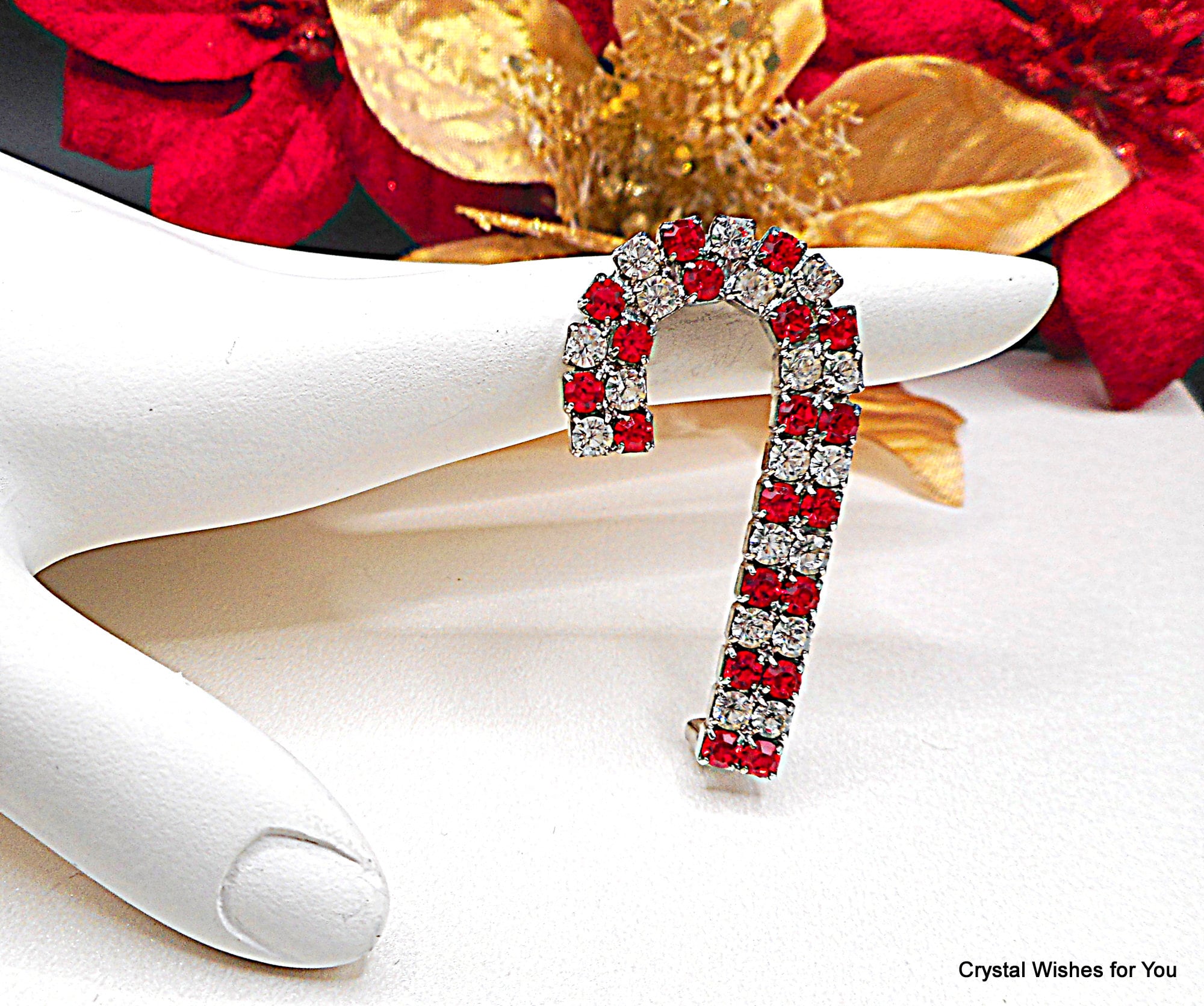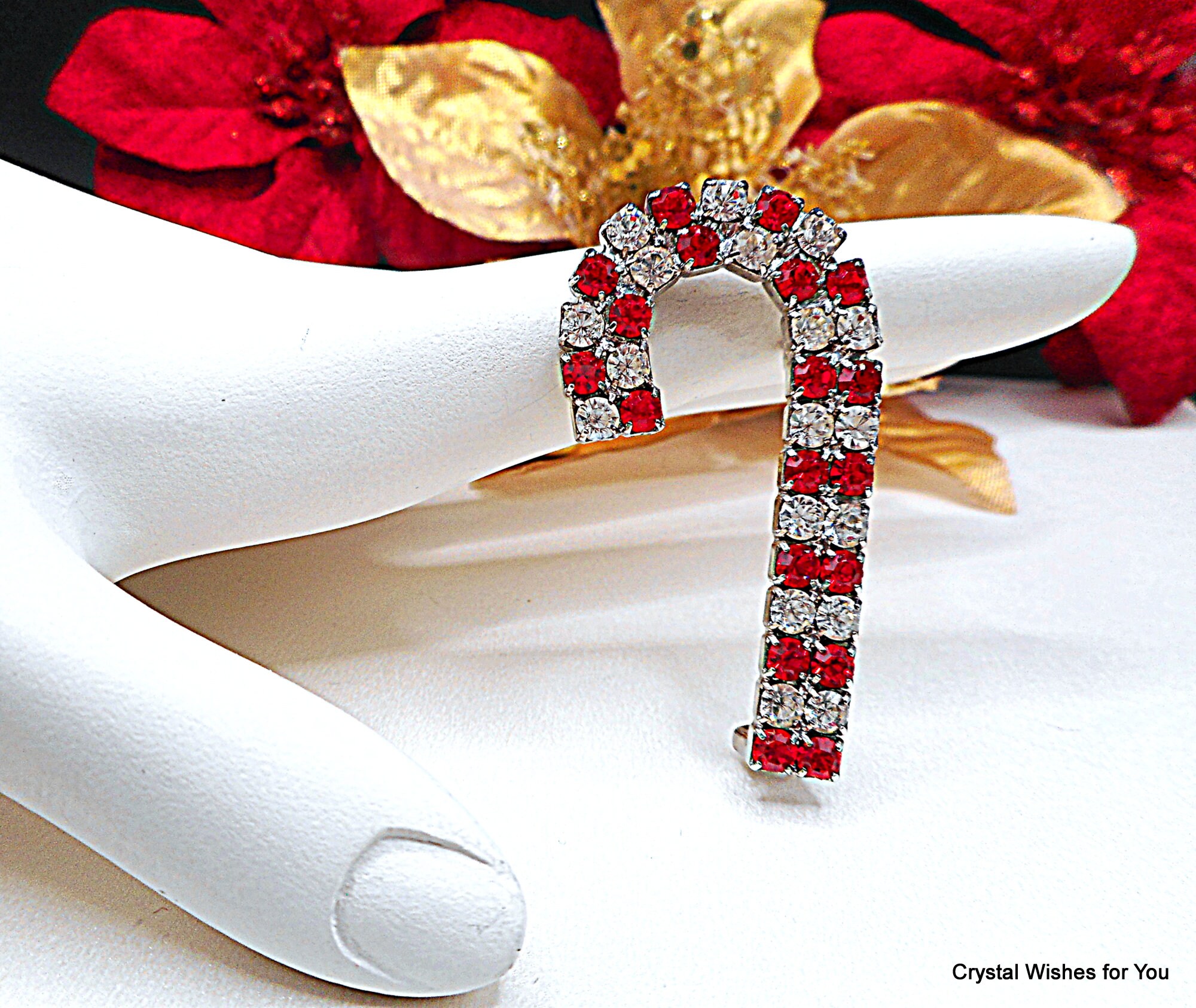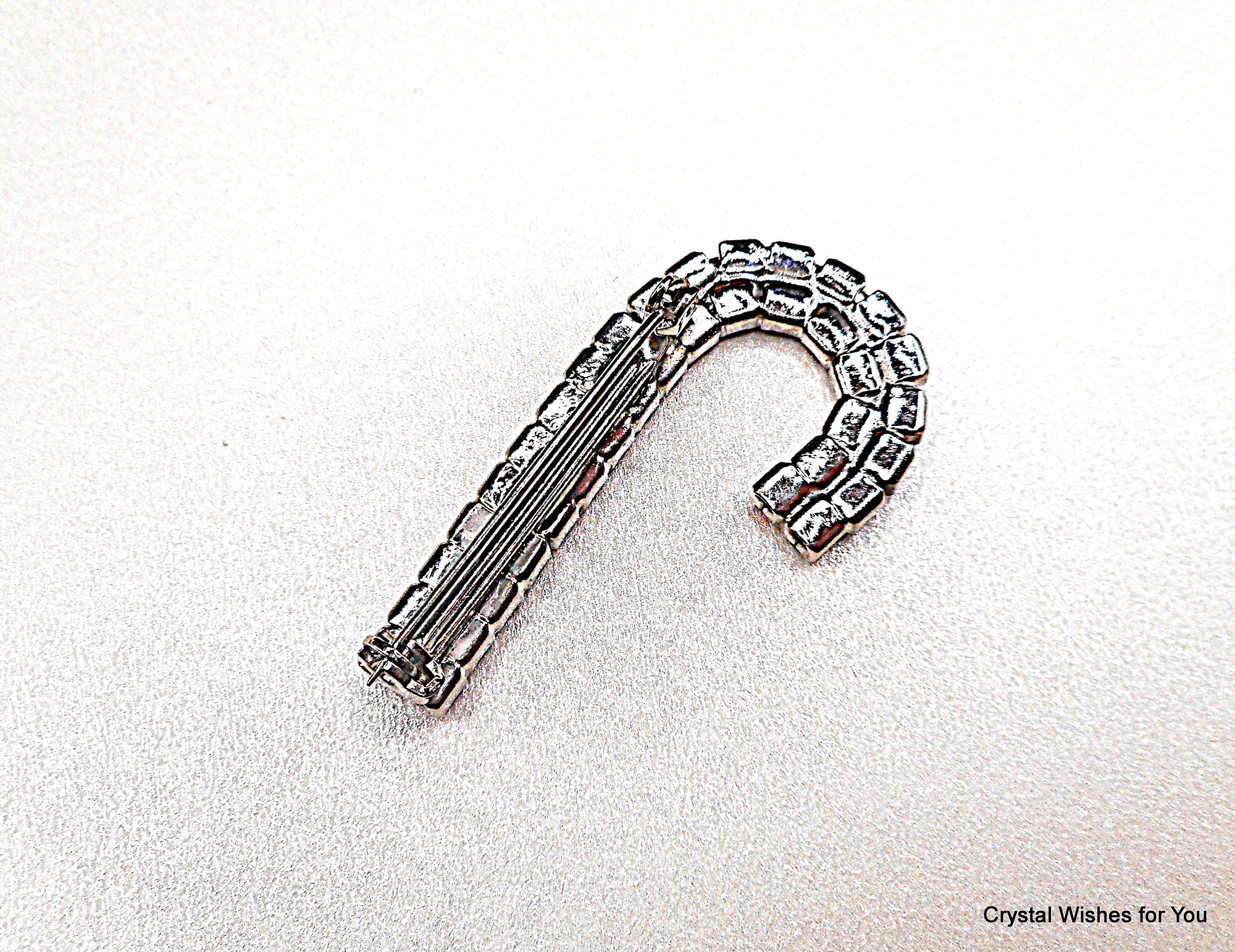 Christmas Candy Cane Brooch Pin DBL Row Red and Clear Glass Rhinestones, Silver Tone Metal