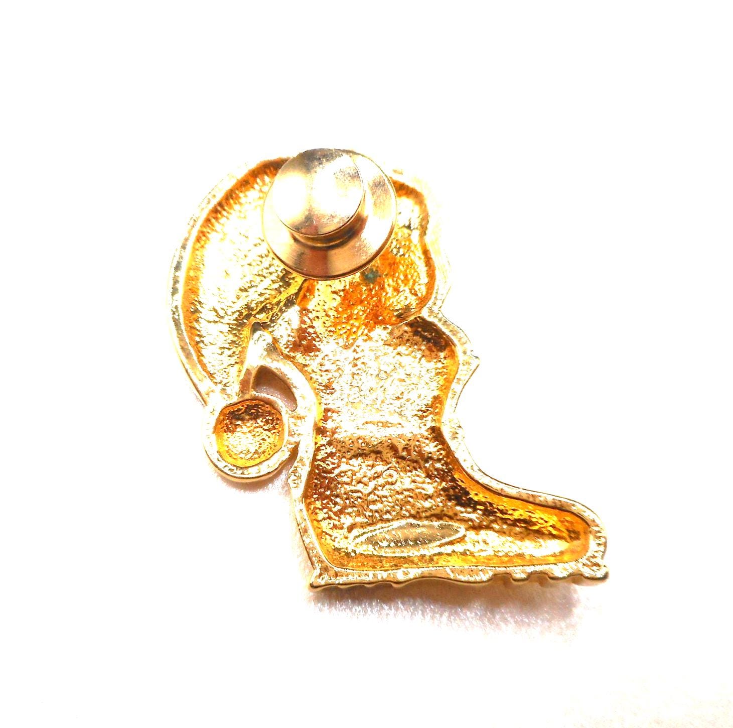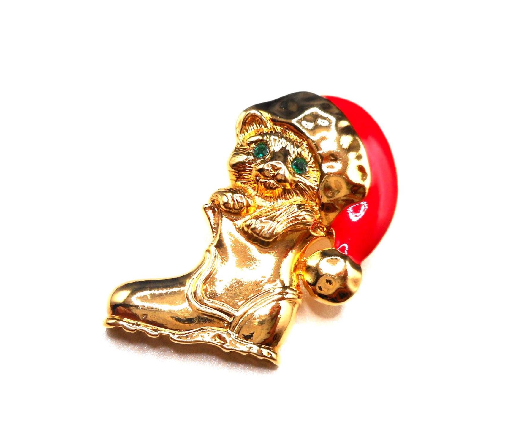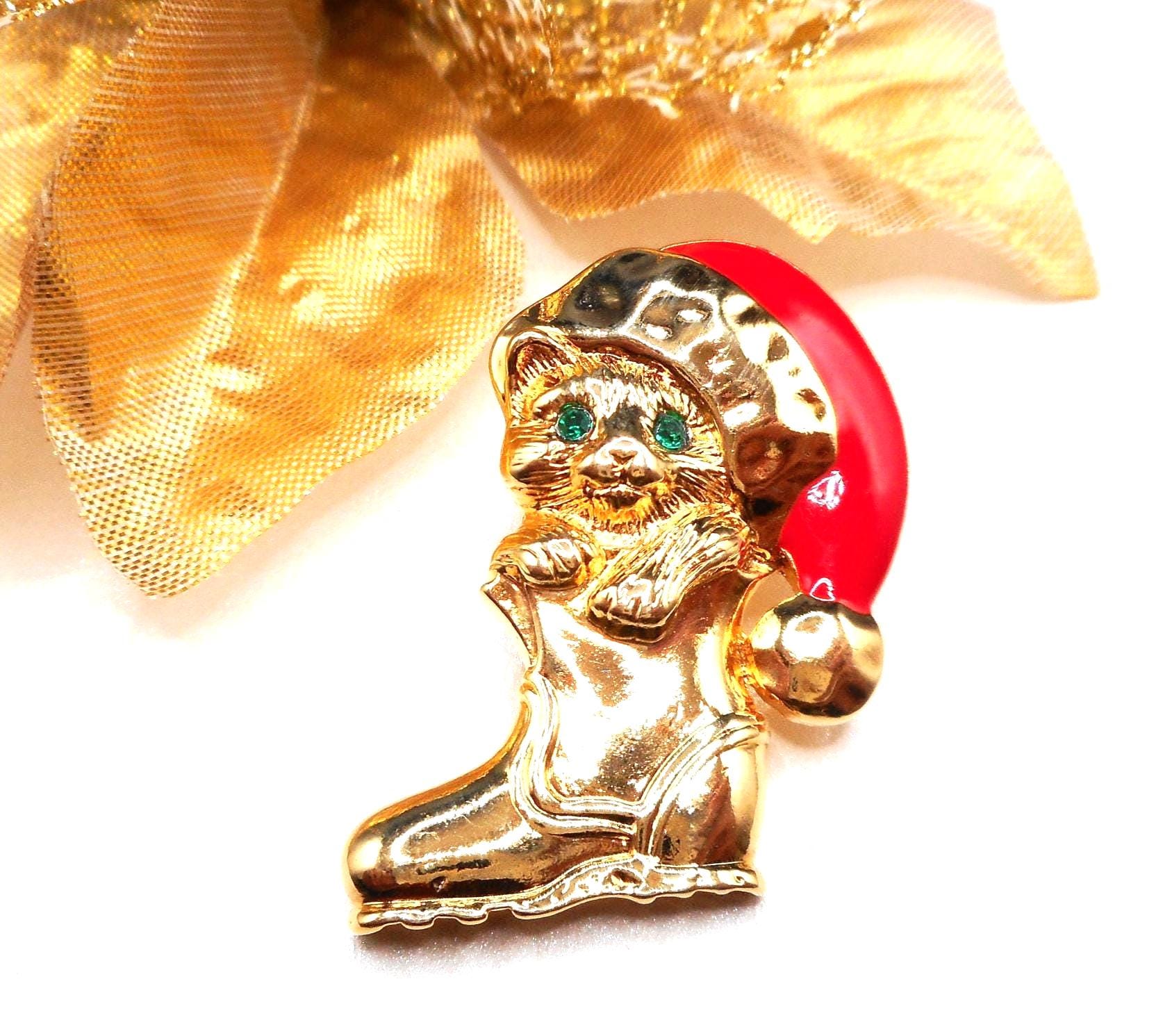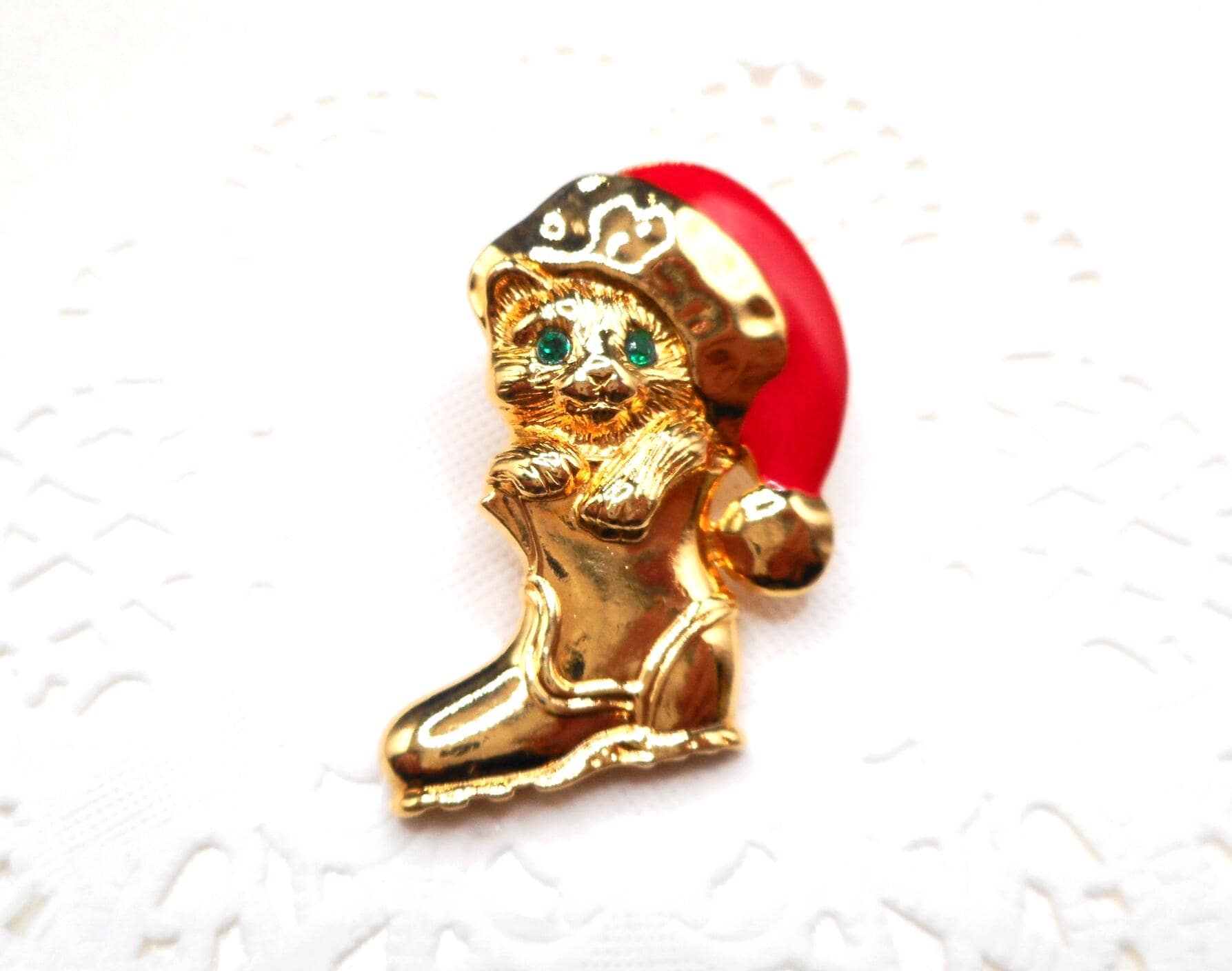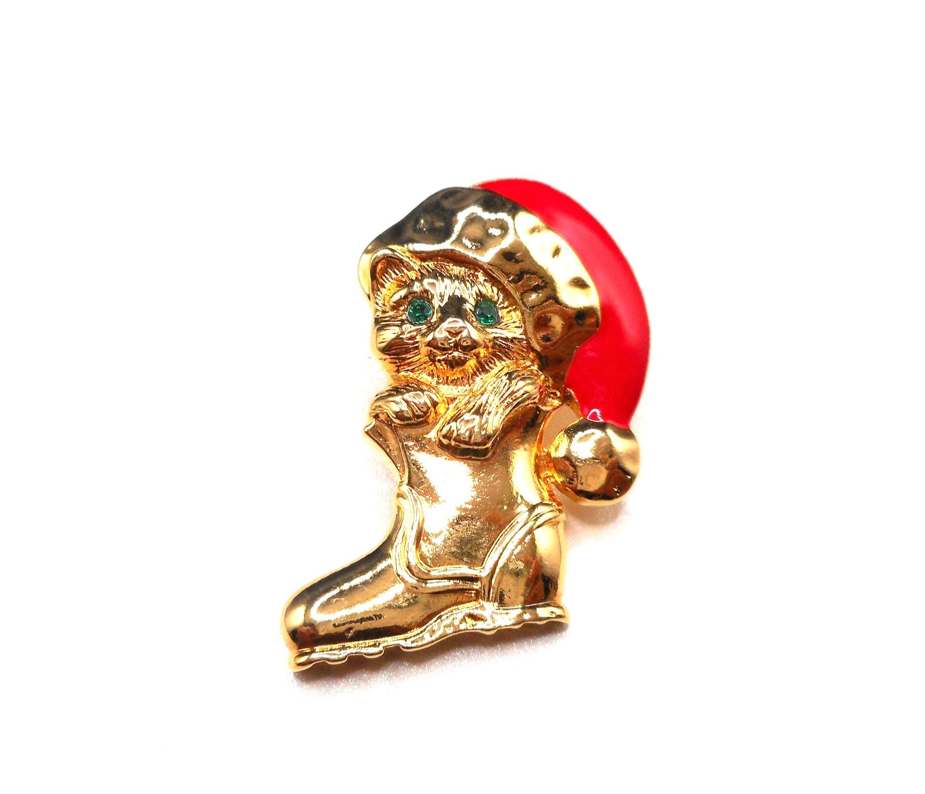 Add a touch of nostalgic holiday cheer to your outfit with this adorable vintage Avon Christmas kitten pin, circa 1995. Crafted in burnished gold tone metal, the design features a sweet little kitten peeking out of a festive boot, topped with a red enamel Santa hat for the perfect seasonal pop of color.