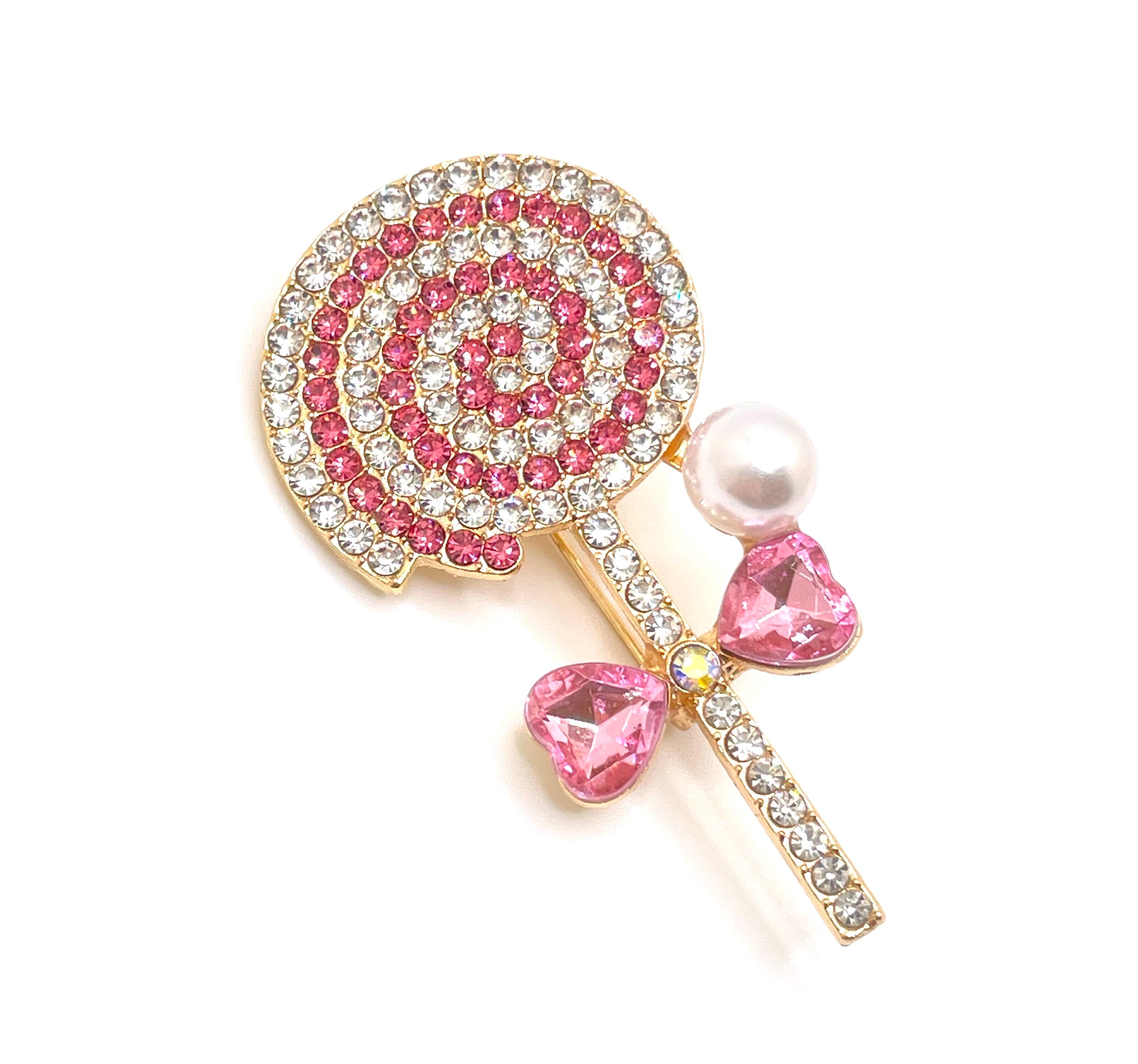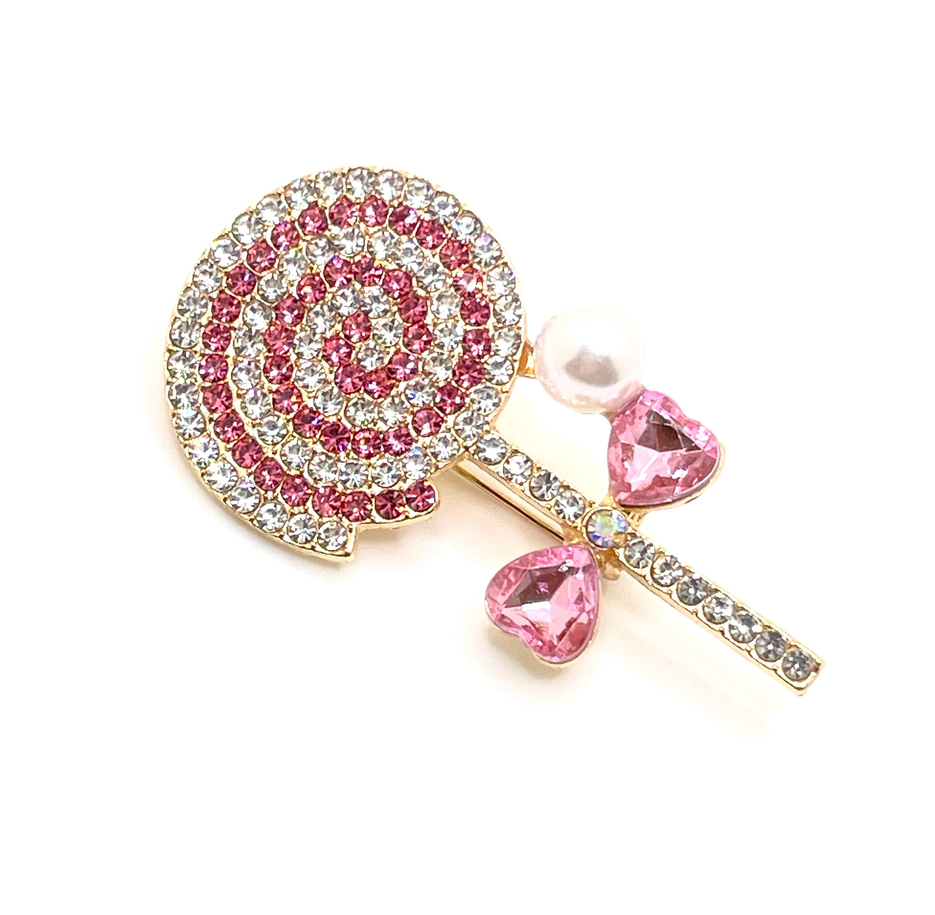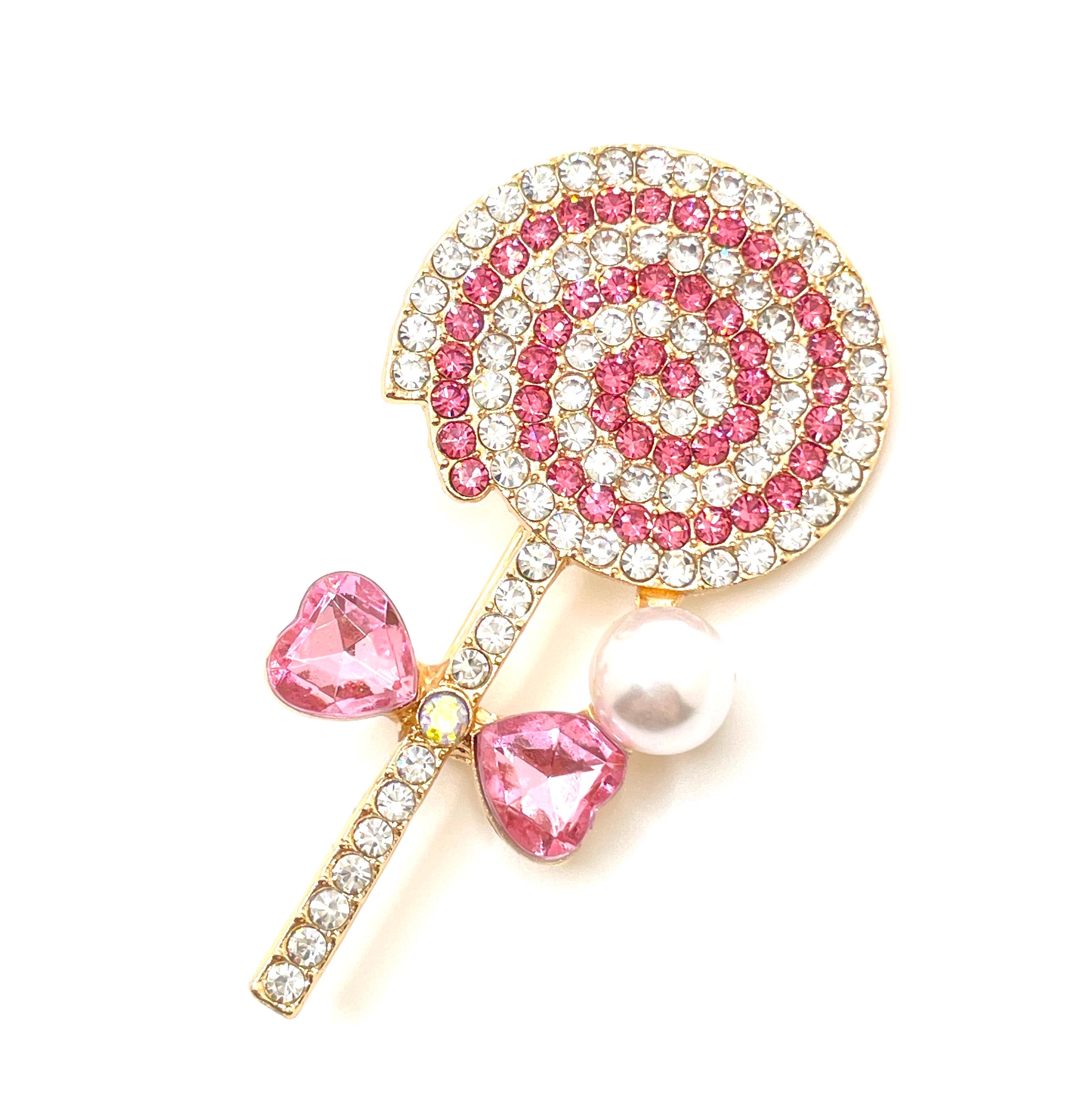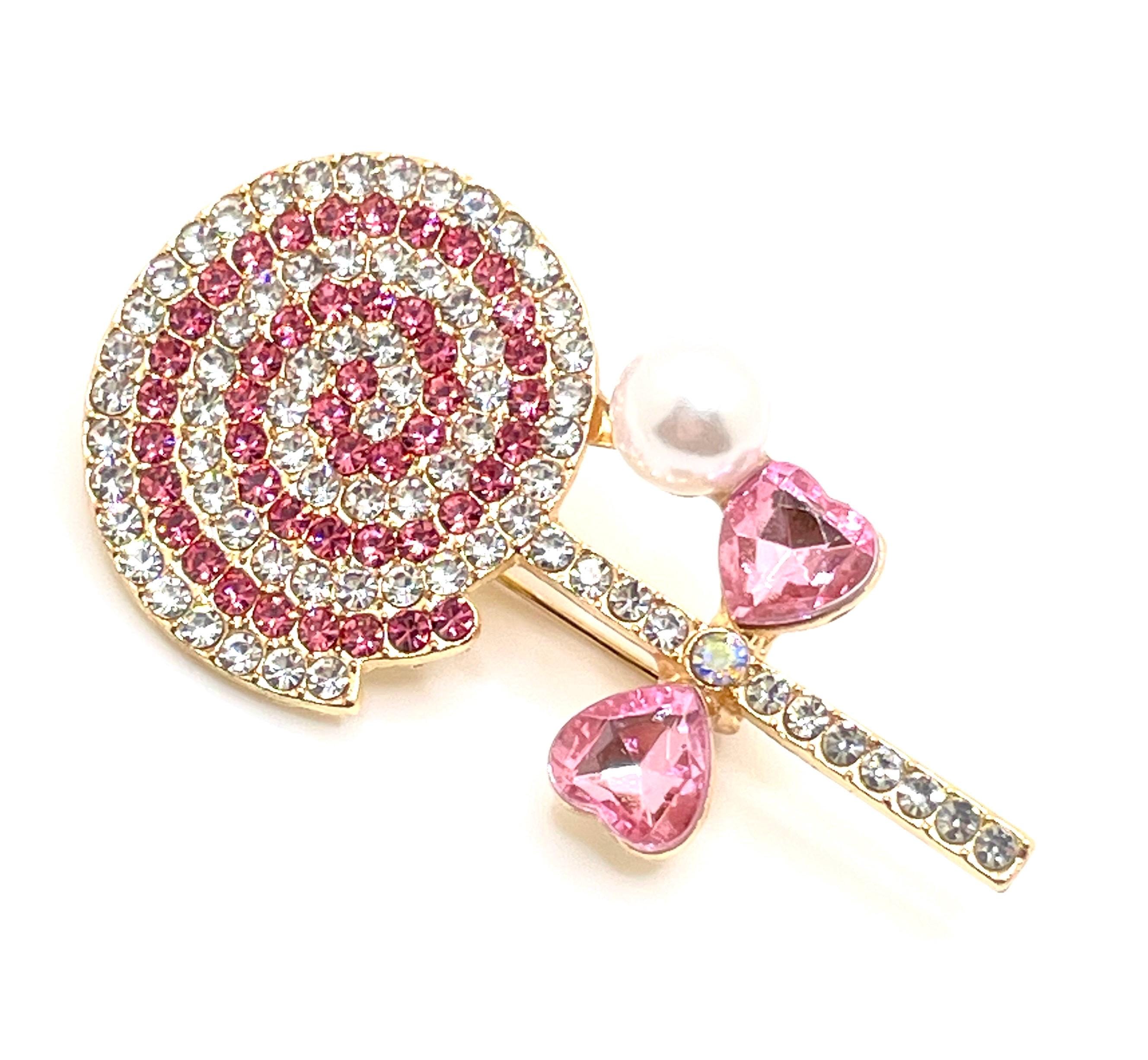 Whimsical Rhinestone Candy Swirl "Lollipop" Brooch – Pink & Clear with Faux Pearl Accent