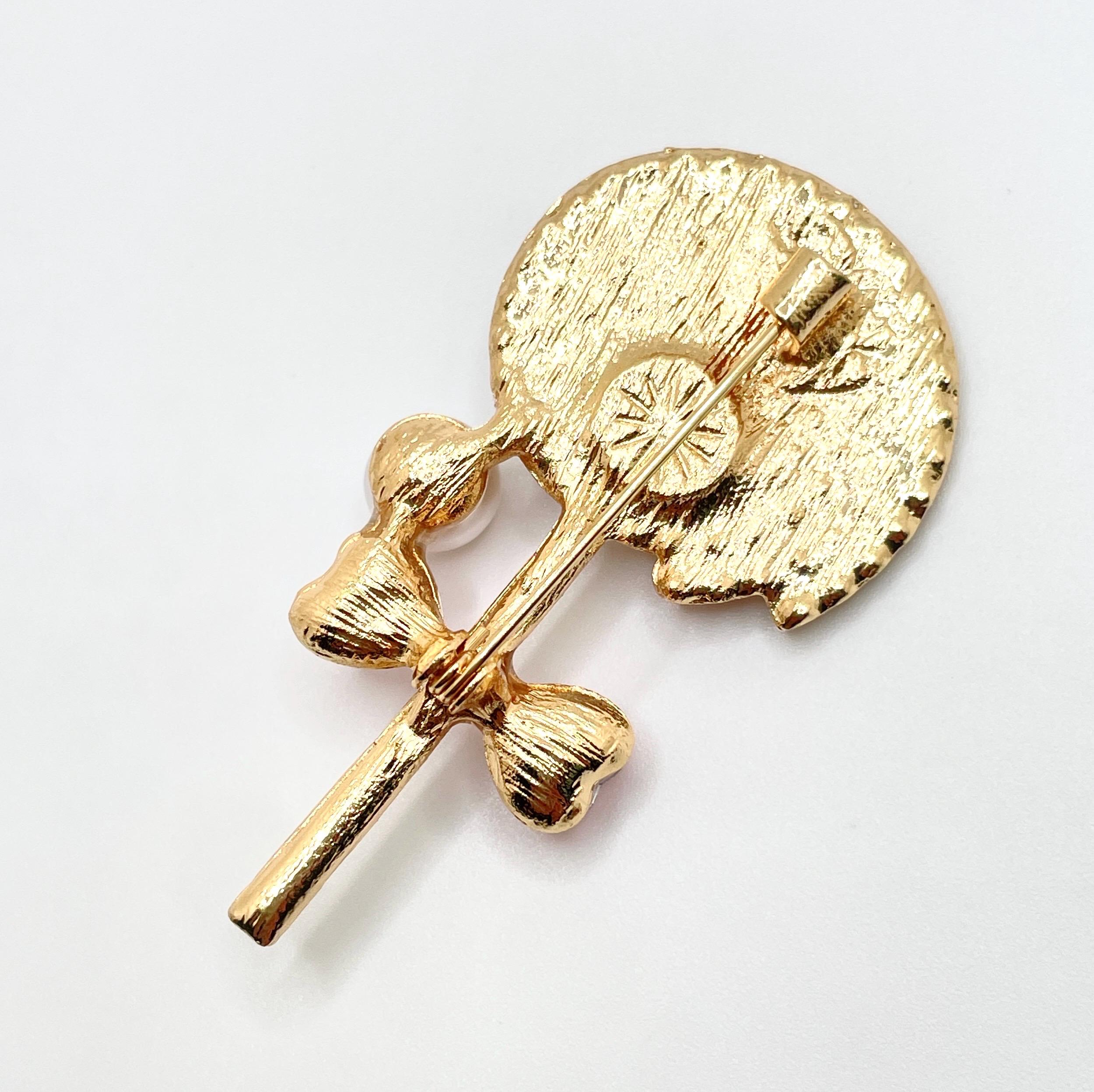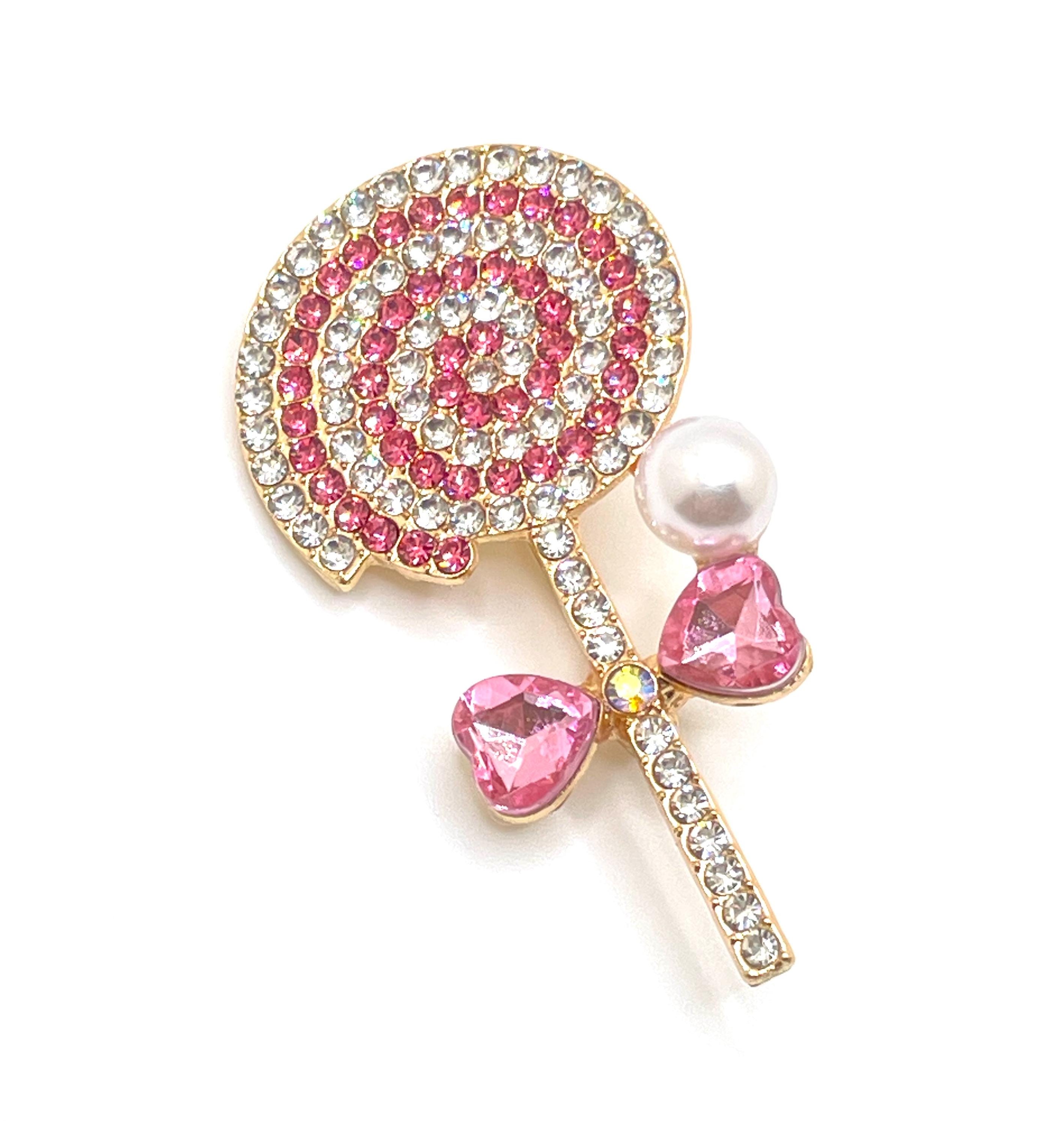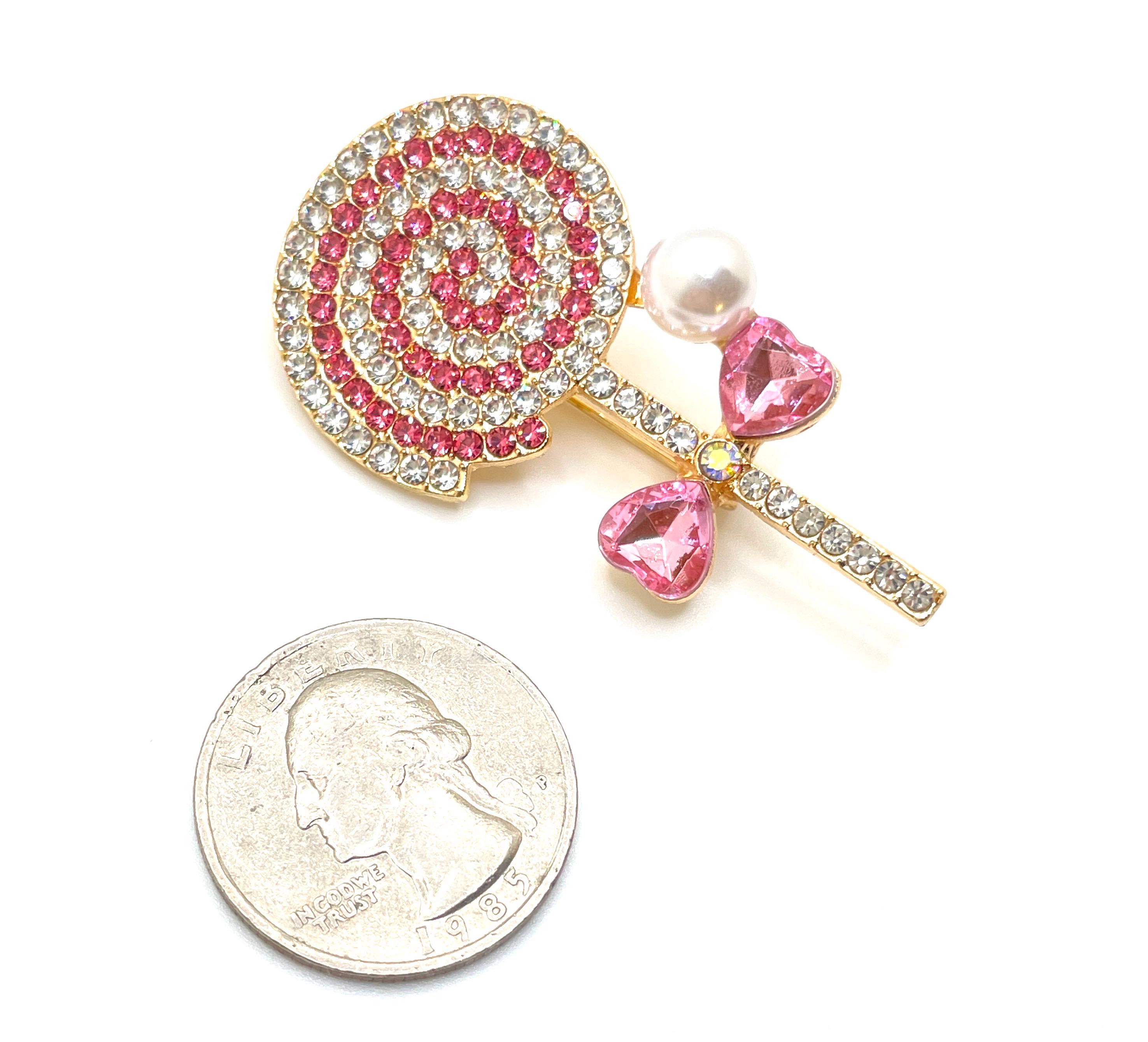 Add a touch of sweetness to your outfit or craft project with this adorable candy-inspired brooch! Featuring a swirl lollipop design, the sucker portion is beautifully pave set with sparkling pink and clear rhinestones in a spiral pattern. The gold tone metal stick is accented with two rhinestone heart-shaped "bow" stones and a central AB crystal for extra shimmer. A faux pearl at the base adds a soft, elegant touch.