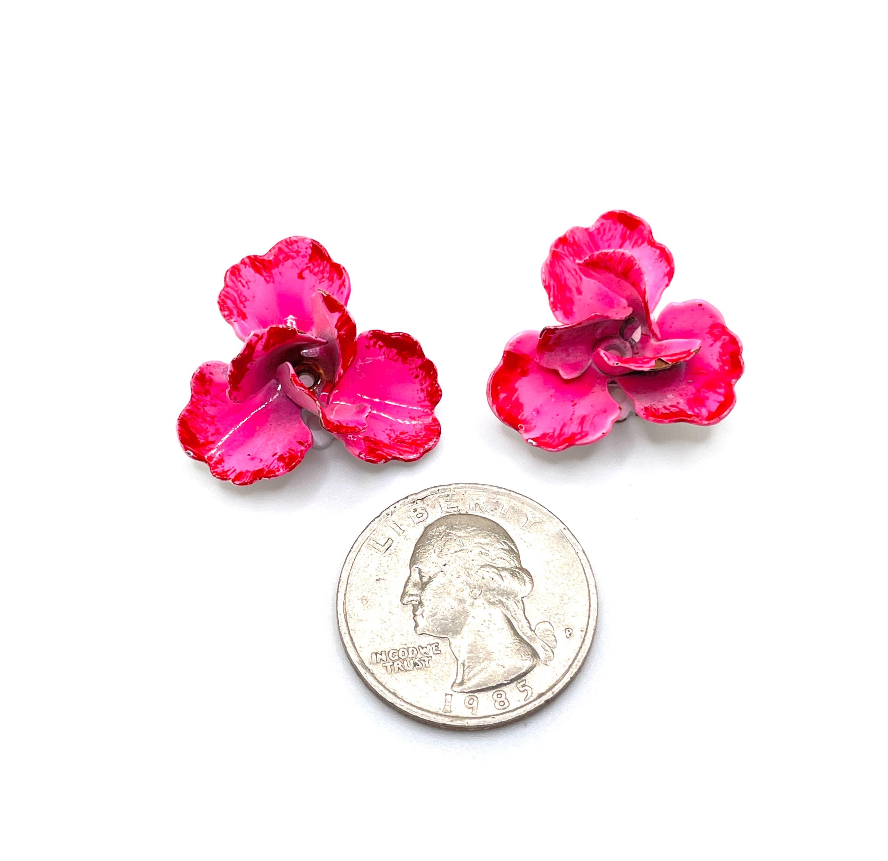 Add a pop of vintage charm to your look with these darling 1960s bright pink enamel flower clip earrings. Featuring ruffled, three-dimensional metal petals in a gradient pink with hand-painted reddish edges, these beauties bring bold retro flair to any outfit. The backs are painted white, highlighting the craftsmanship typical of mid-century design.