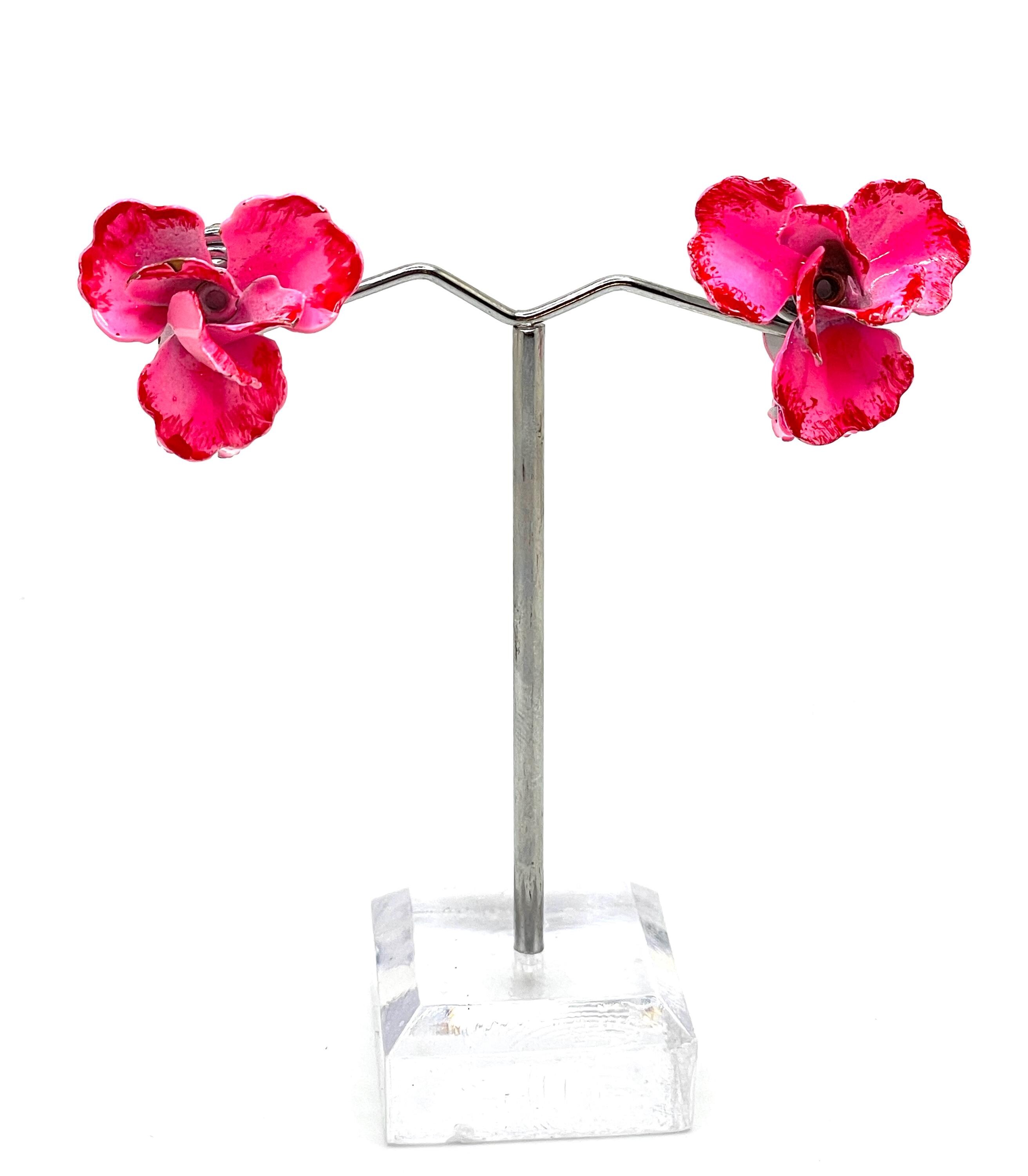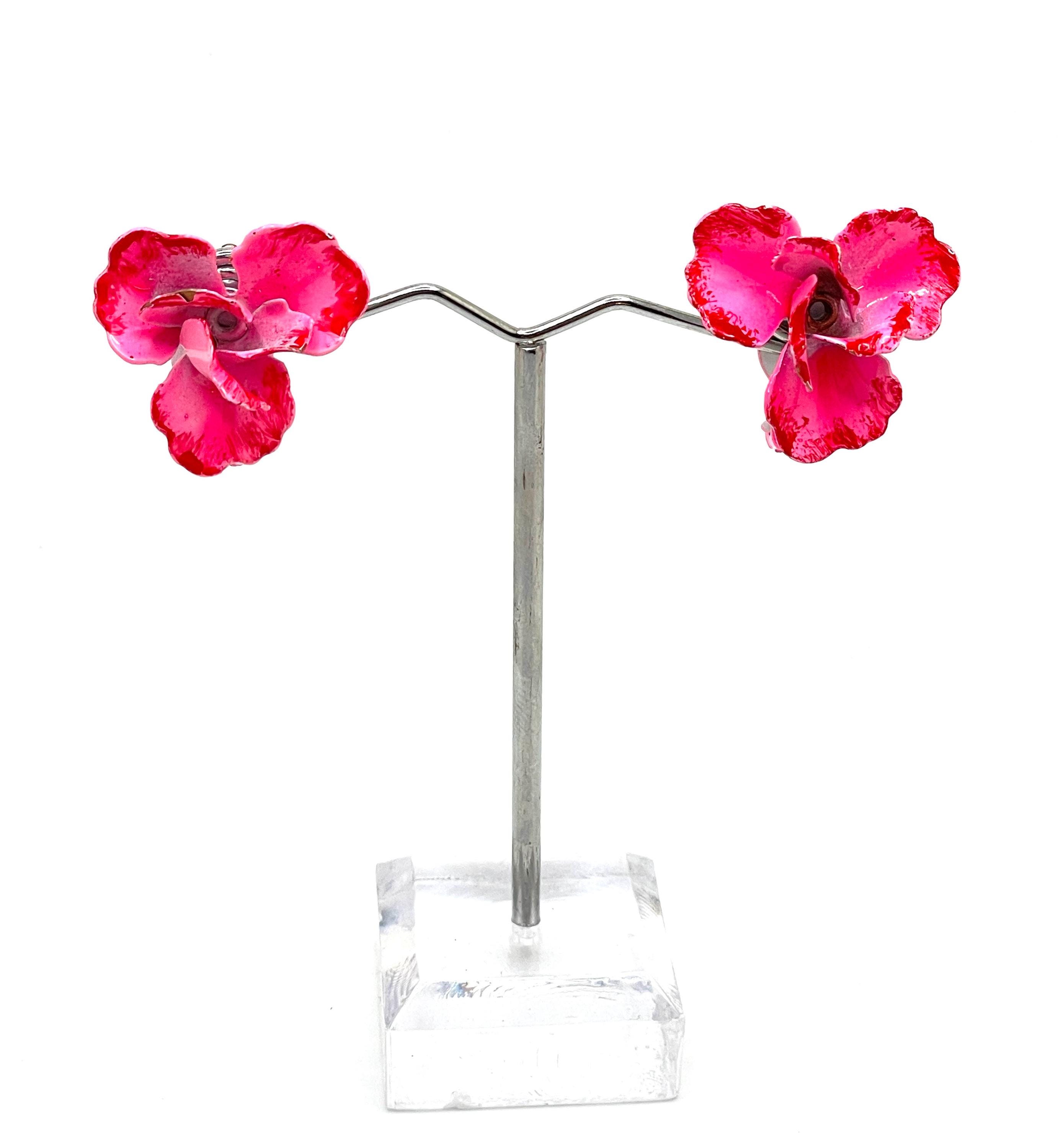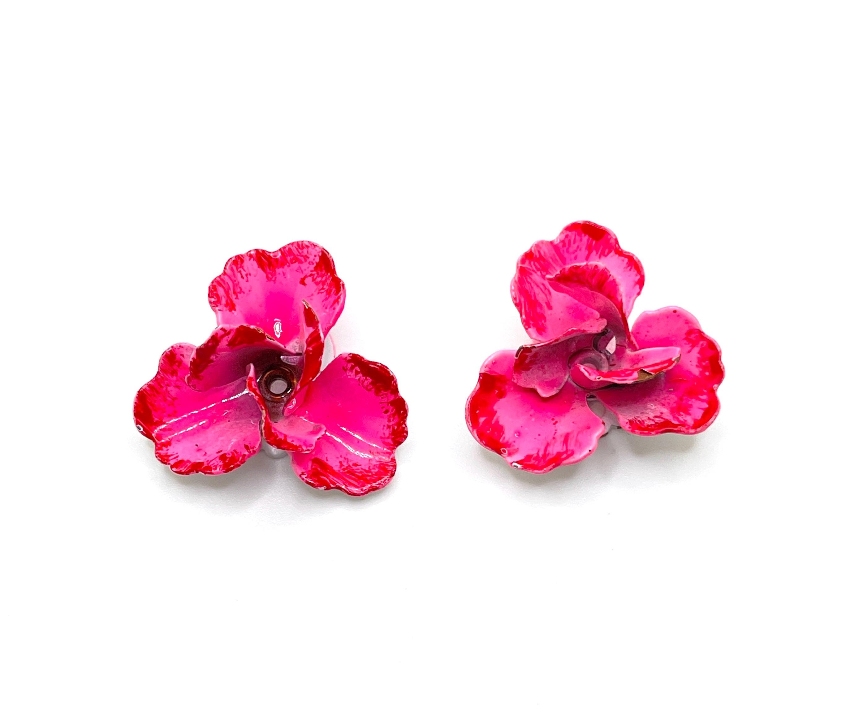 Vintage 1960s Bright Pink Enamel Flower Clip-On Earrings – Hand Painted, Dimensional Ruffled Petals