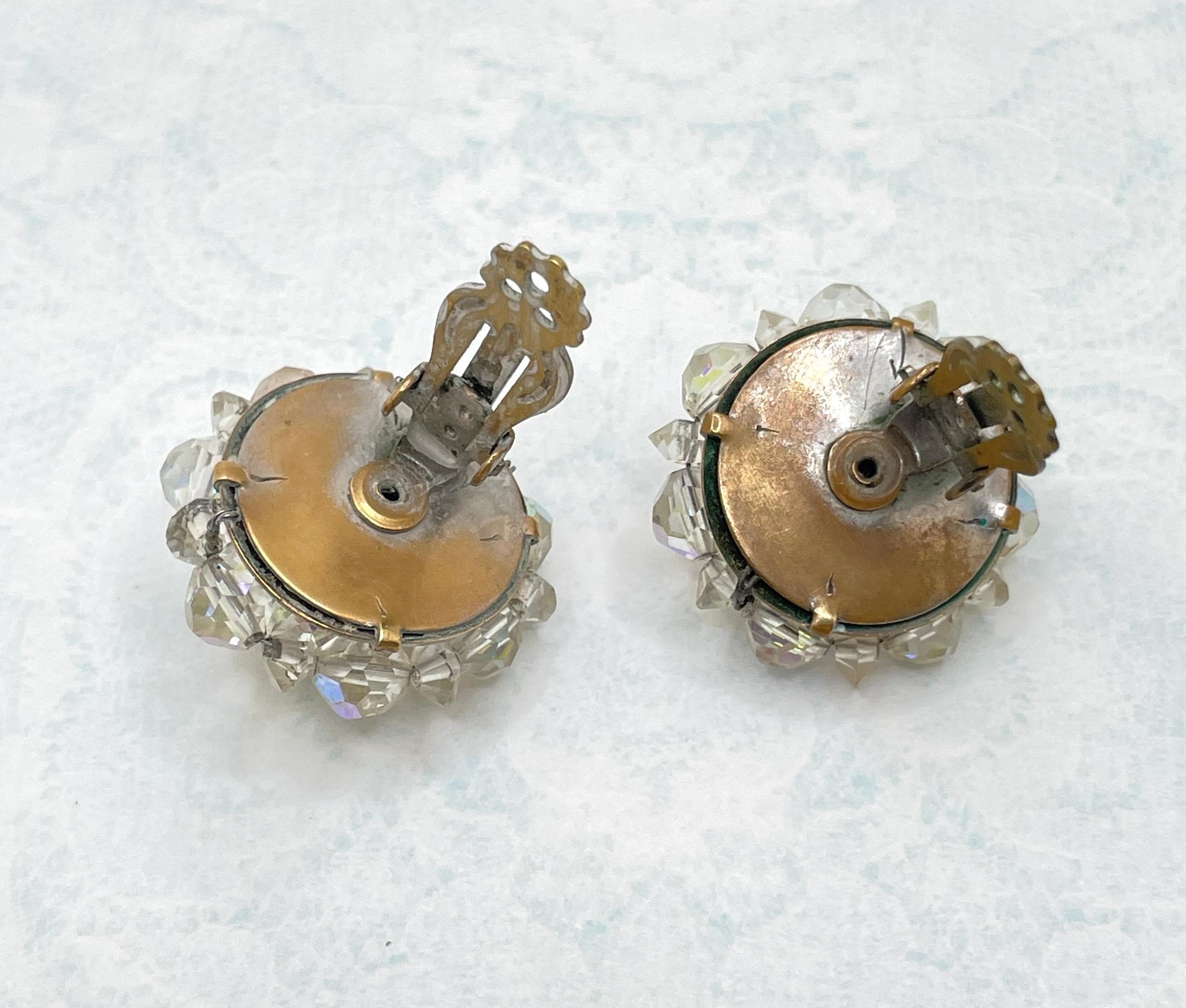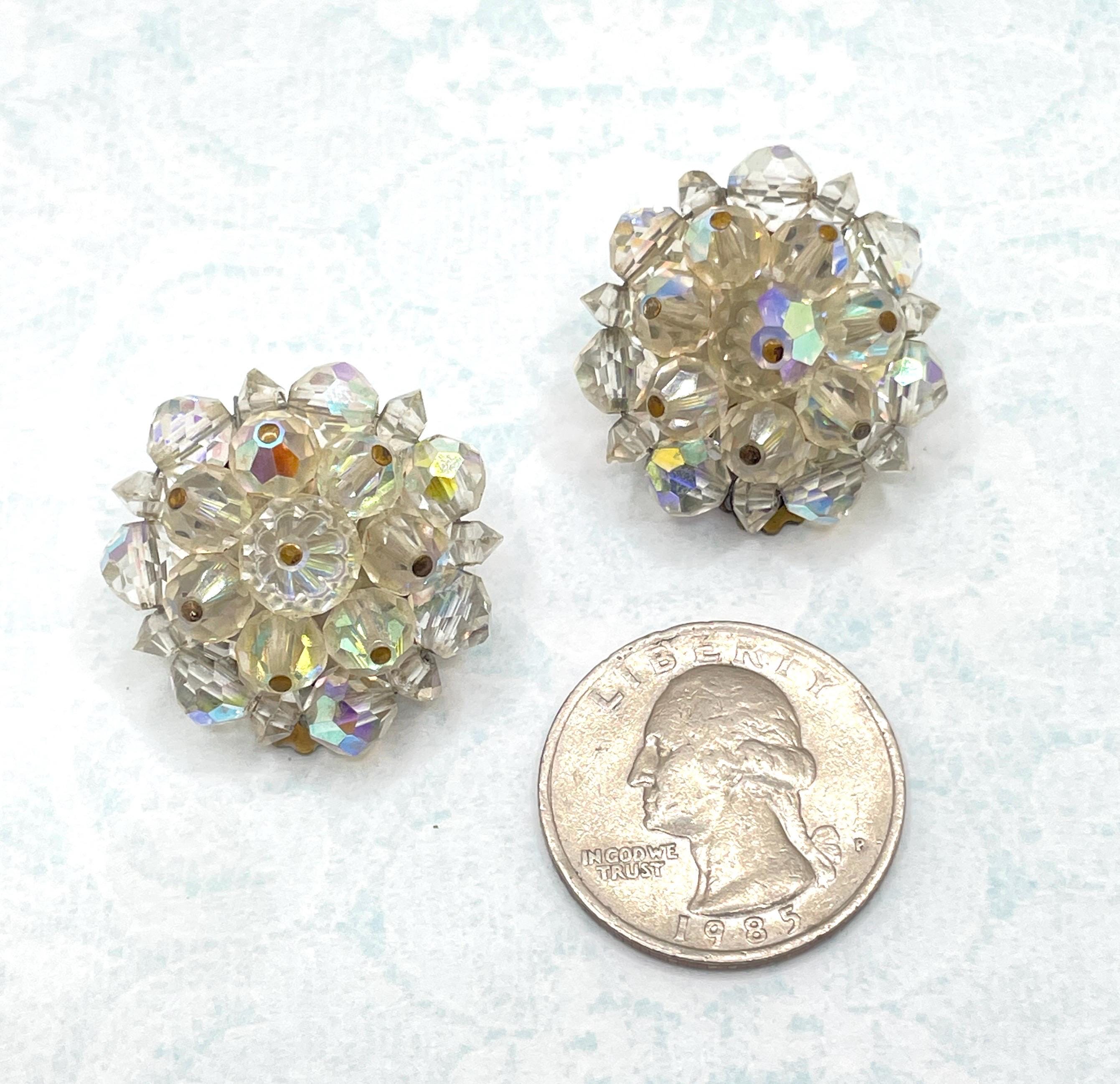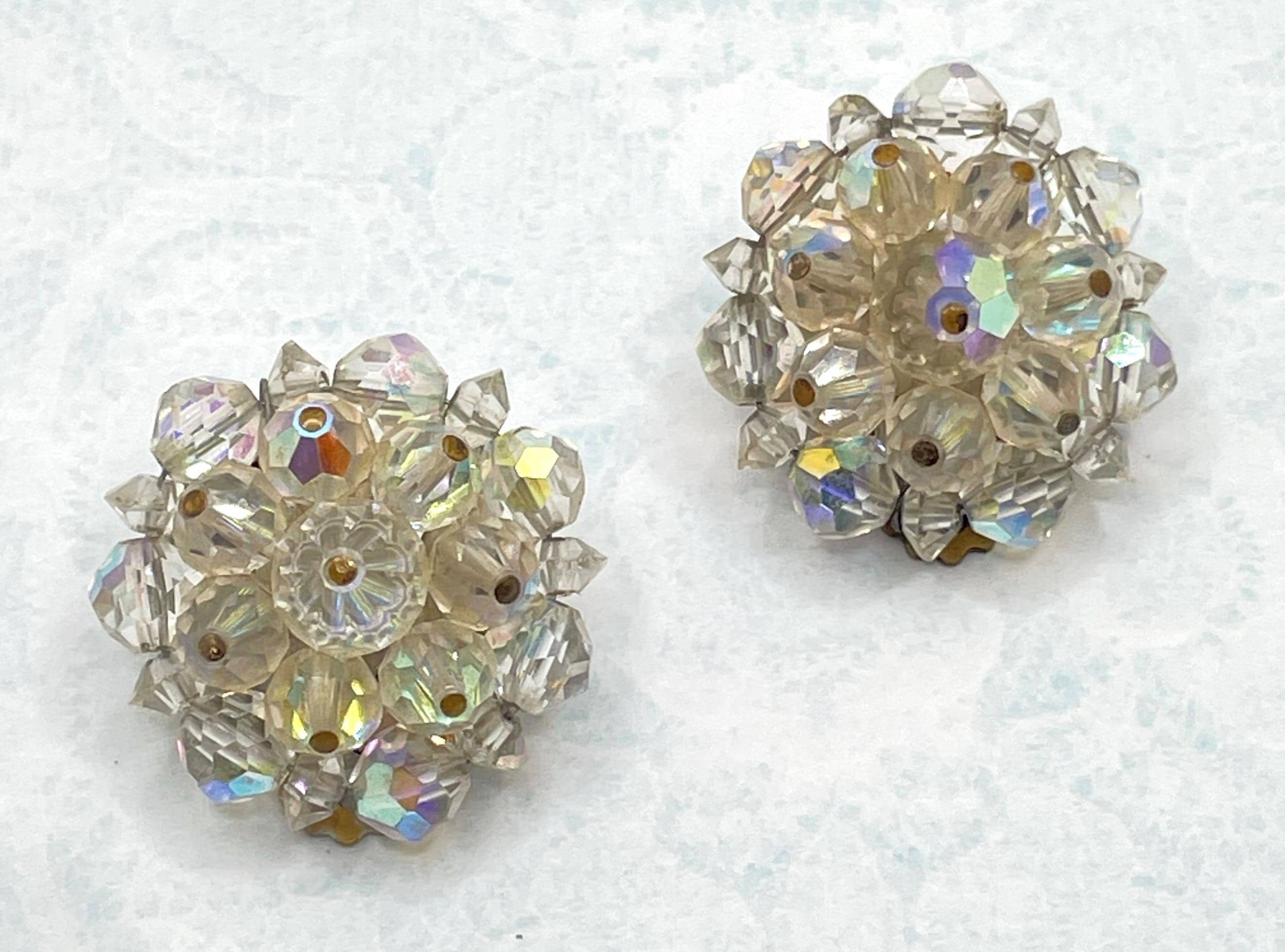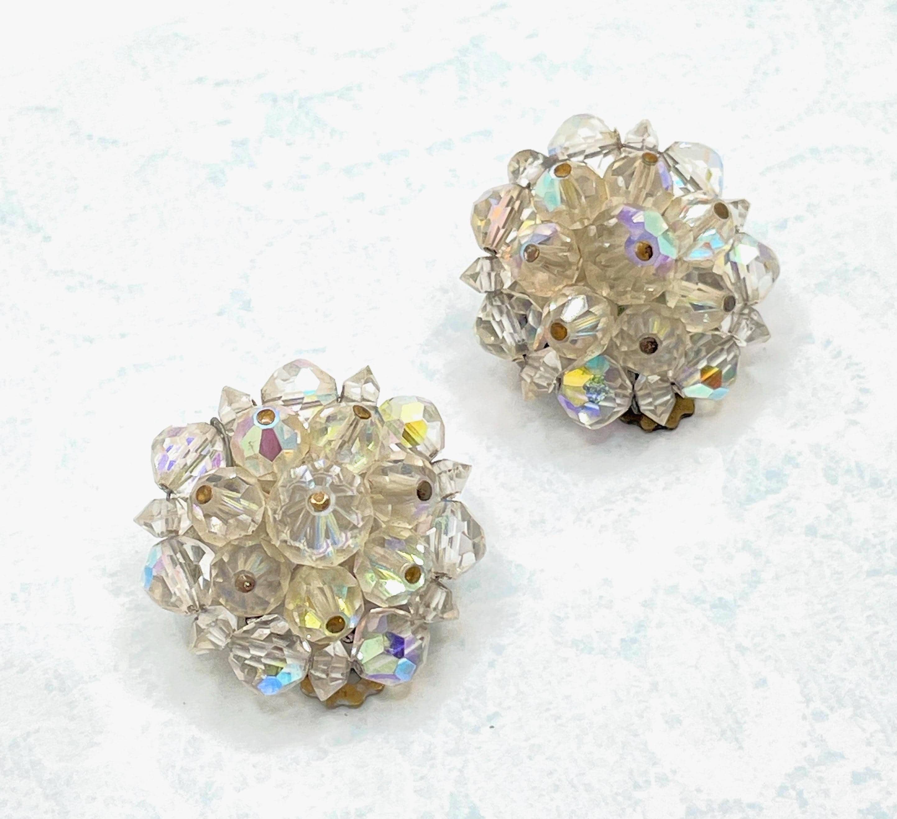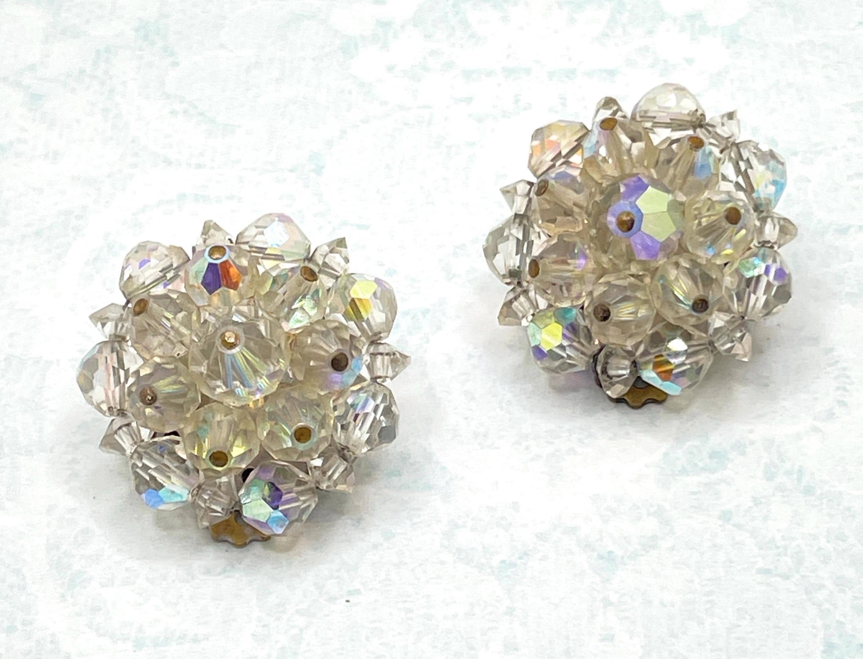 Mid Century 1950s Aurora Borealis Crystal Cluster Clip Earrings | Signed Laguna | AB Glass Beads | Handmade