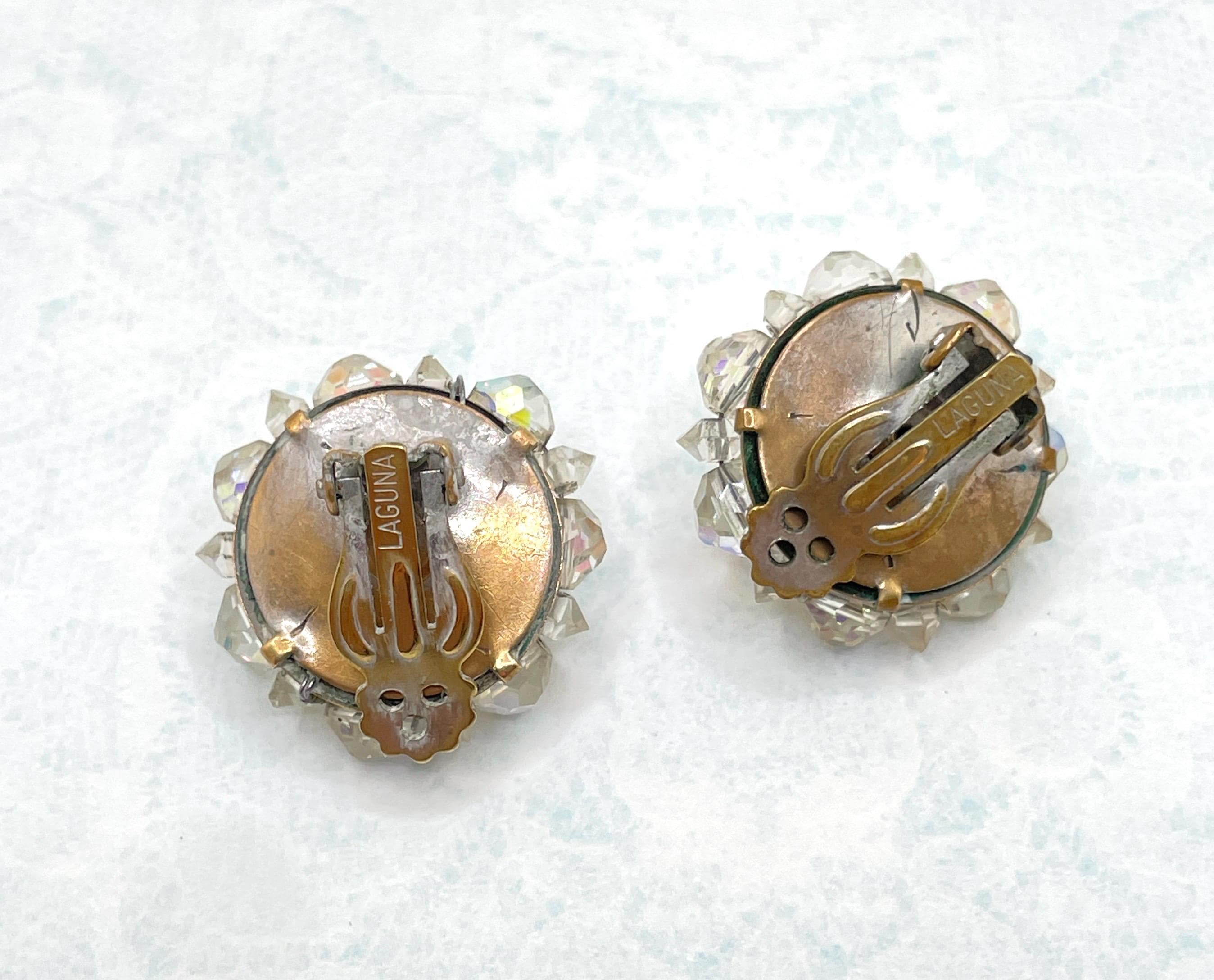 Add a touch of vintage sparkle with these mid century aurora borealis crystal cluster clip earrings, signed “Laguna.” Each earring measures 1" in diameter, featuring hand-wired crystals secured with a prong-set back for a polished, seamless finish. The clips fit securely for comfortable wear.