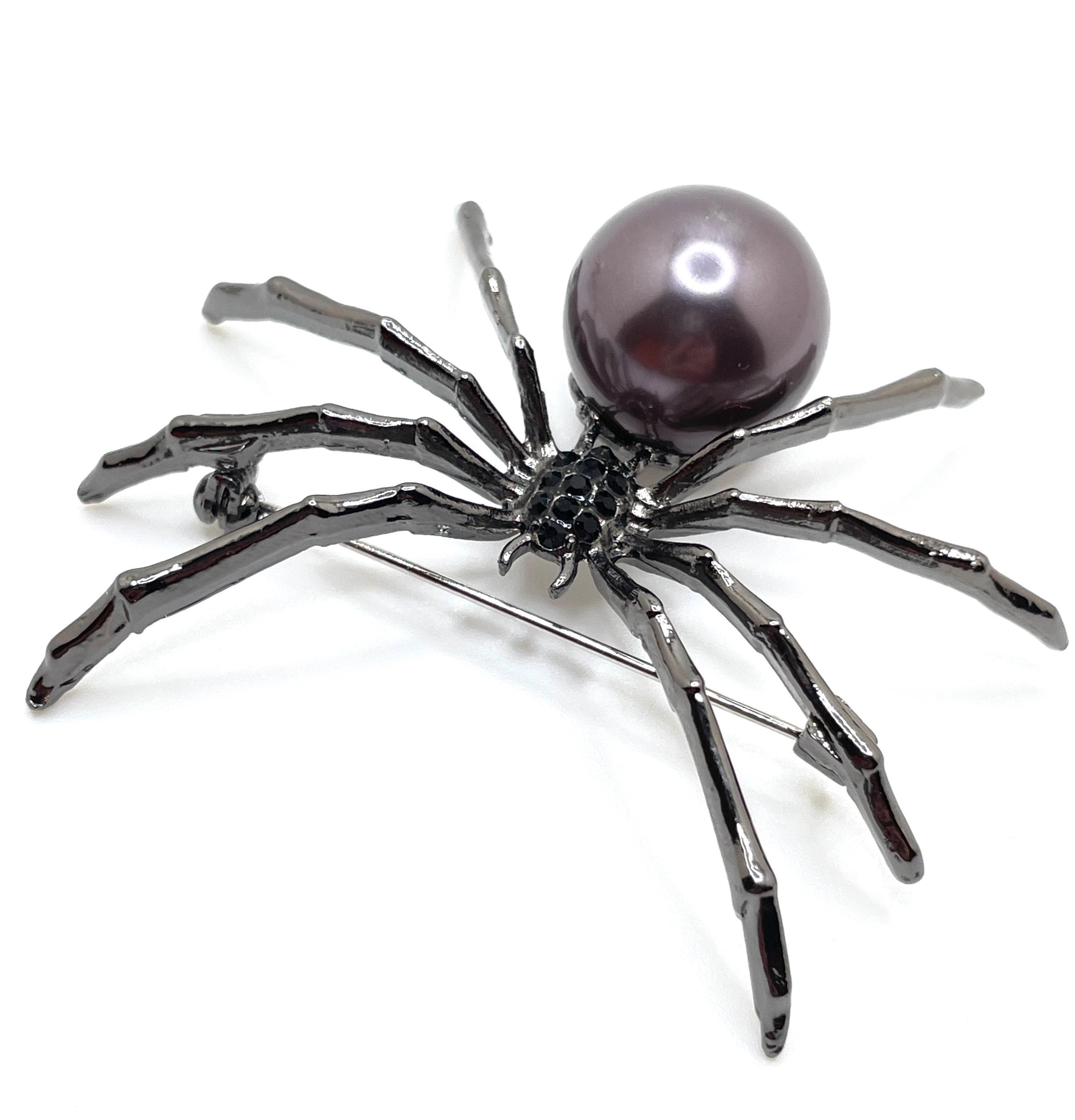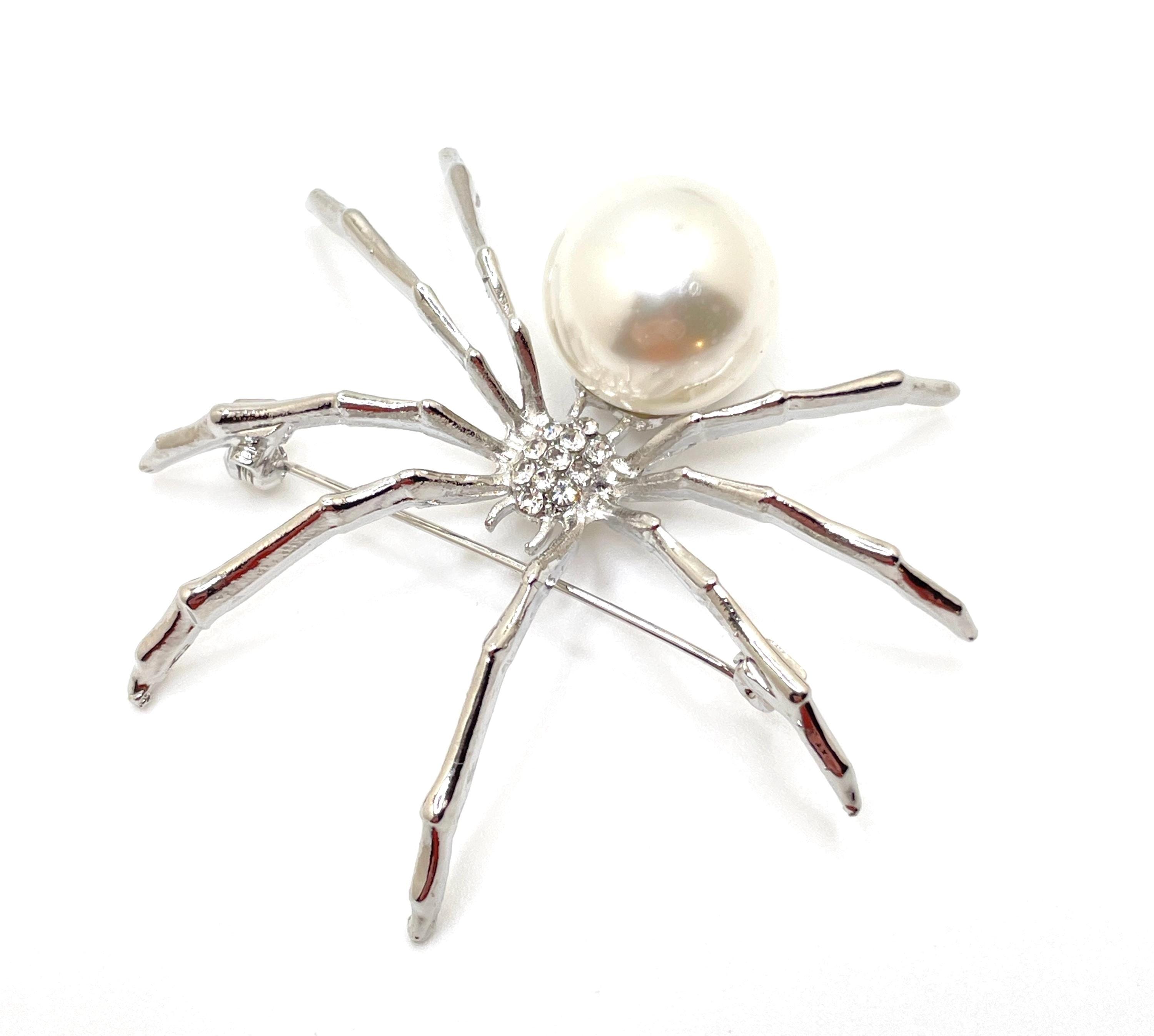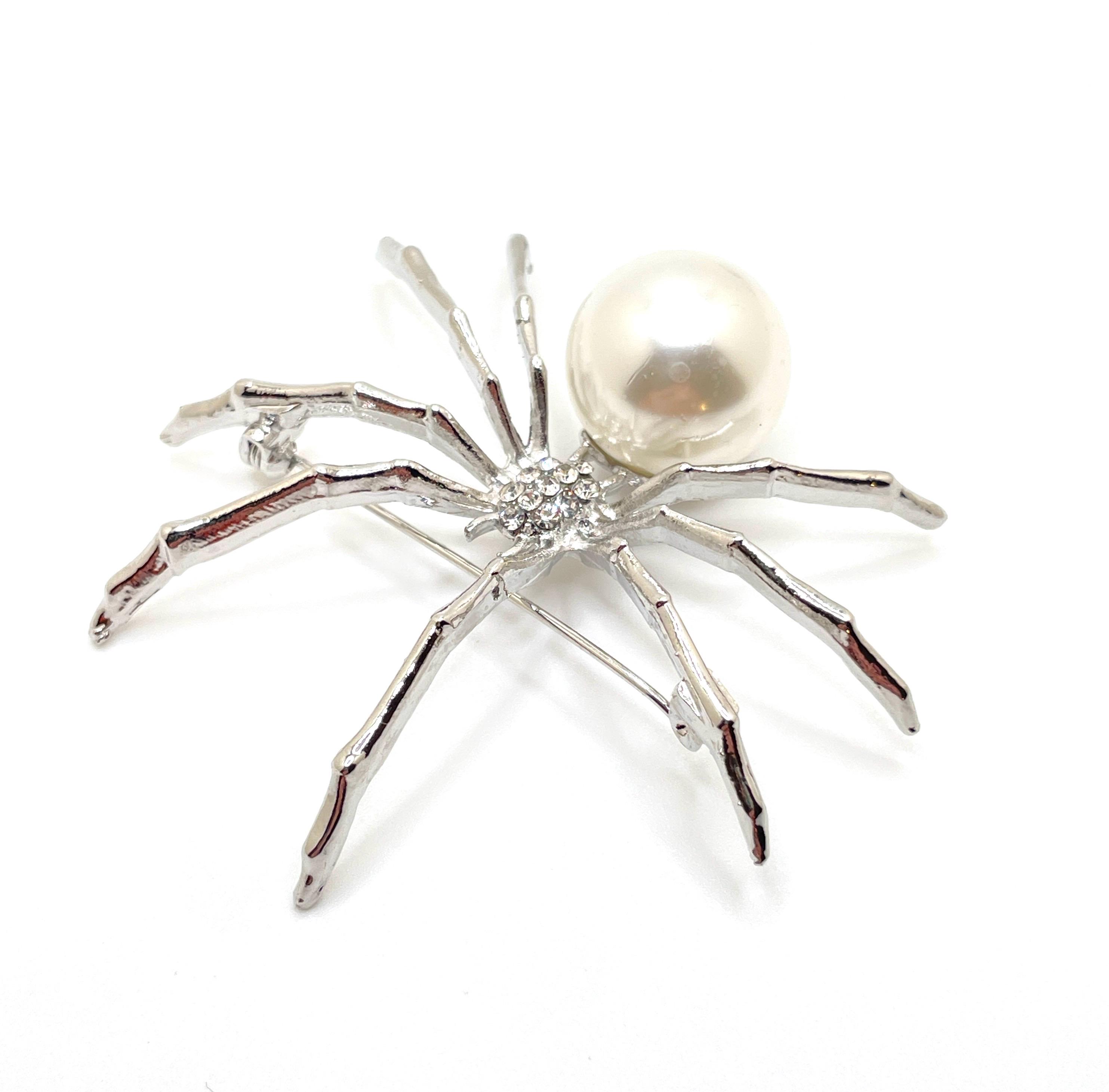 Elegant Creepy Spider Brooch – 16mm Faux Pearl Body with Rhinestones – Silver or Gunmetal Finish – Gothic Halloween Jewelry