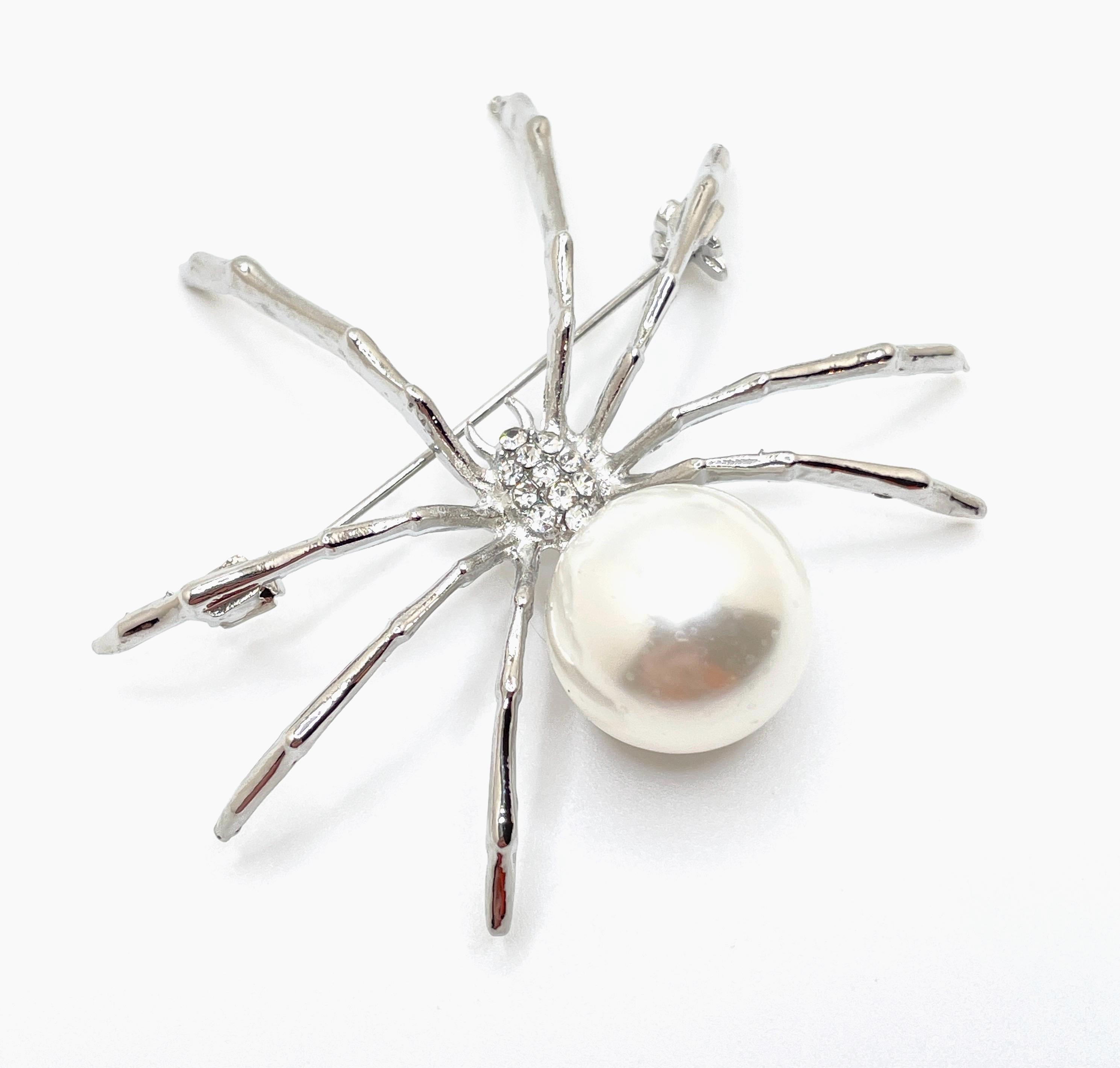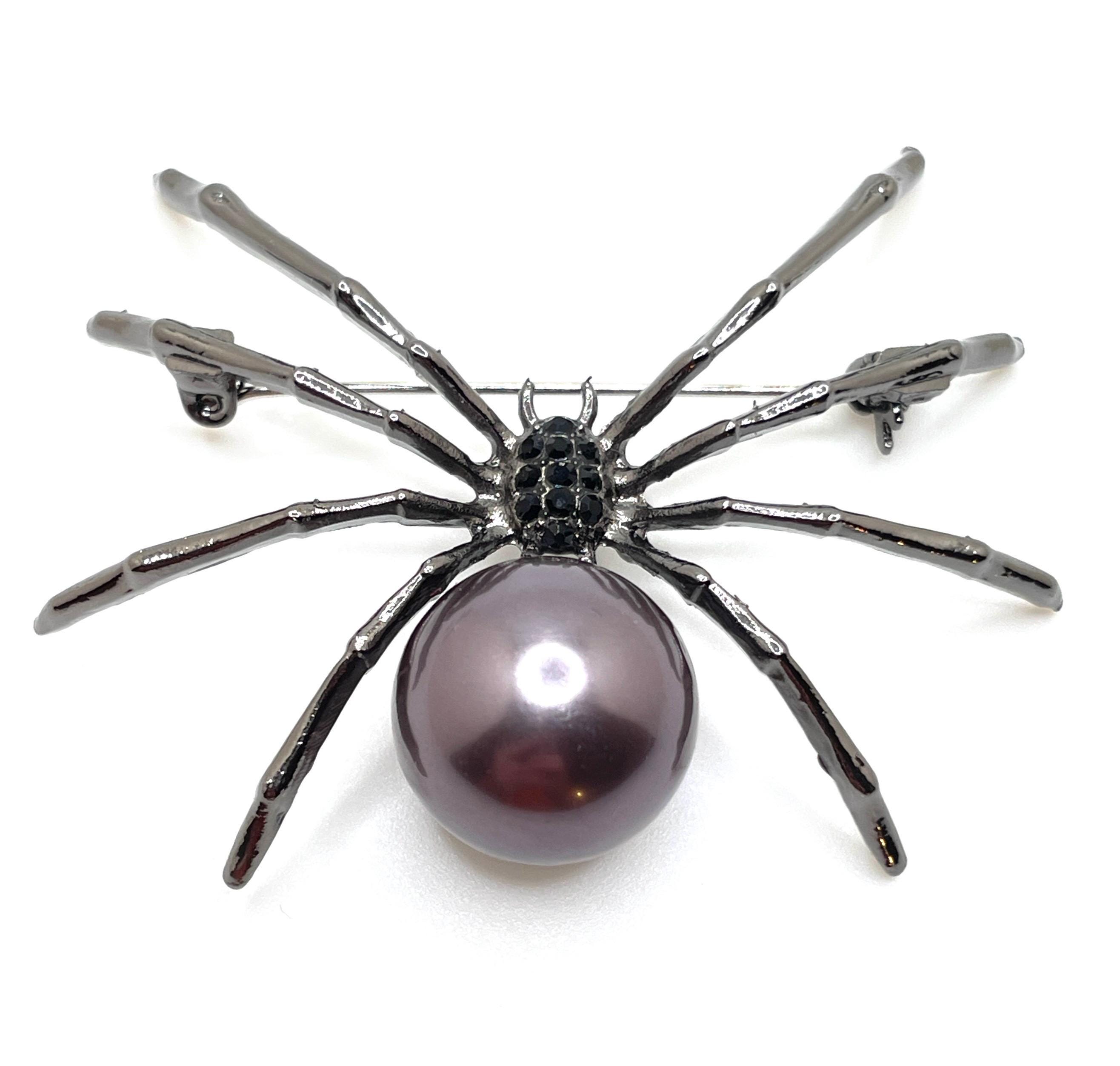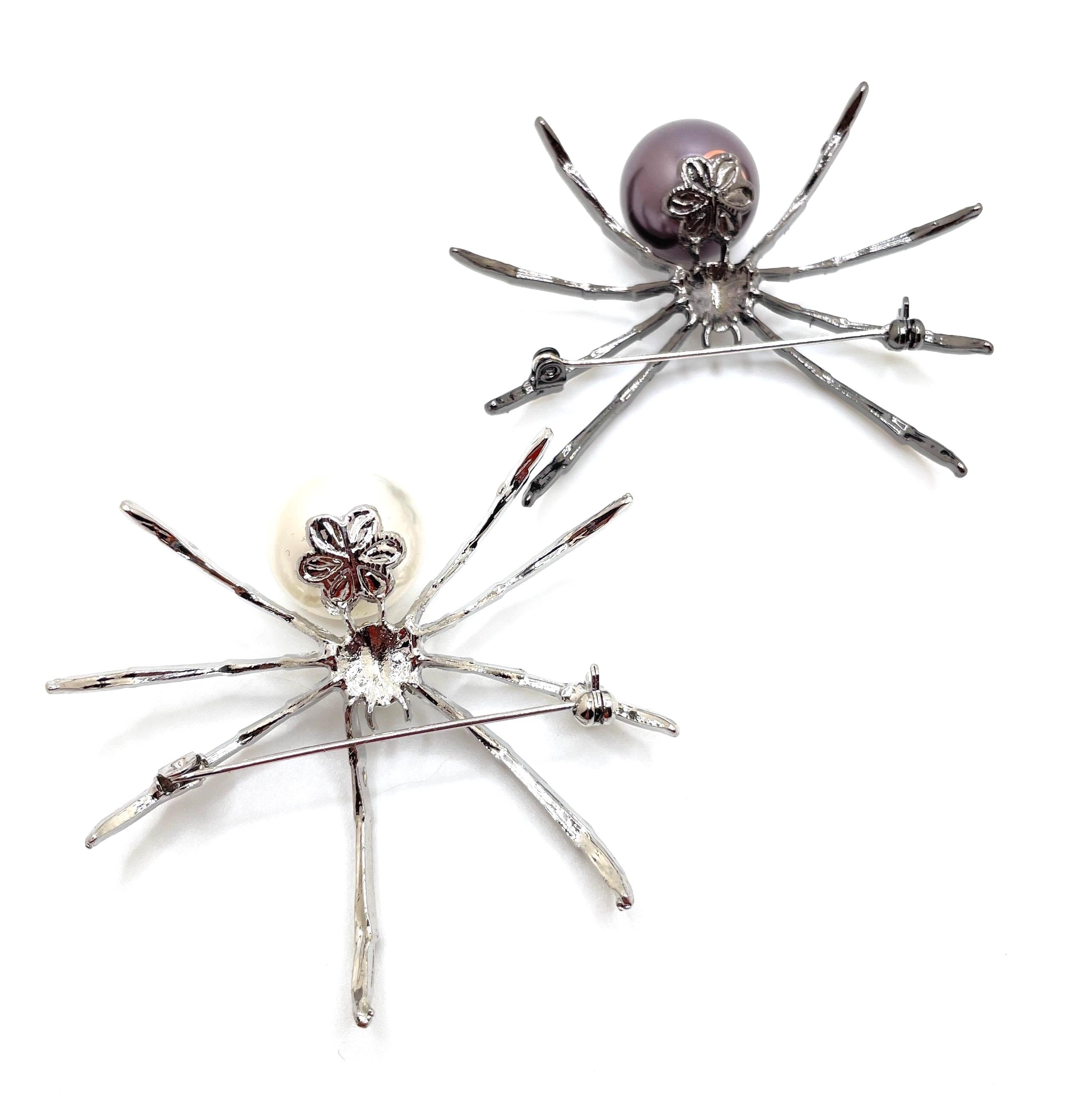 Elegant Creepy Spider Brooch – 16mm Faux Pearl Body with Rhinestones – Silver or Gunmetal Finish – Gothic Halloween Jewelry
