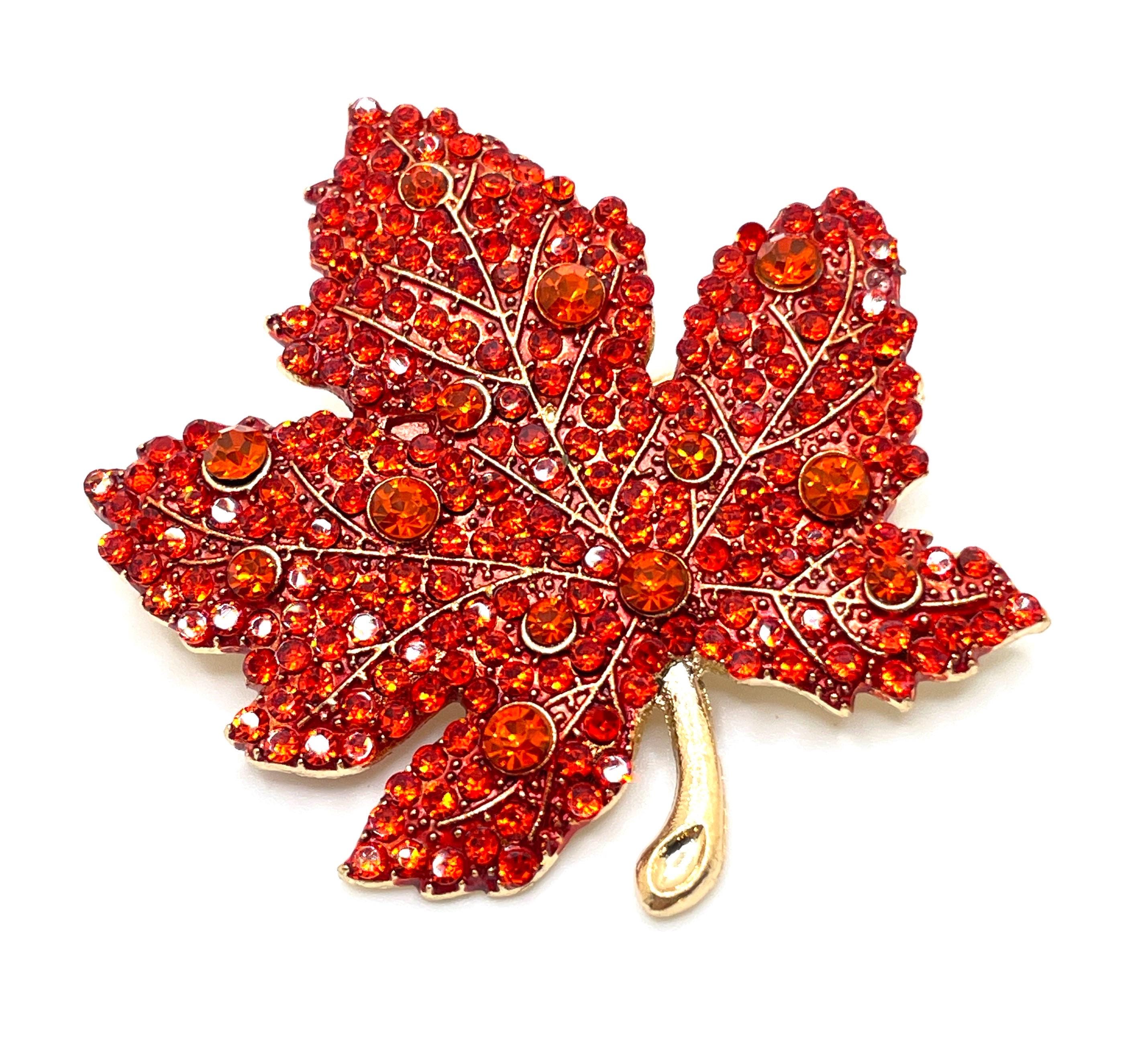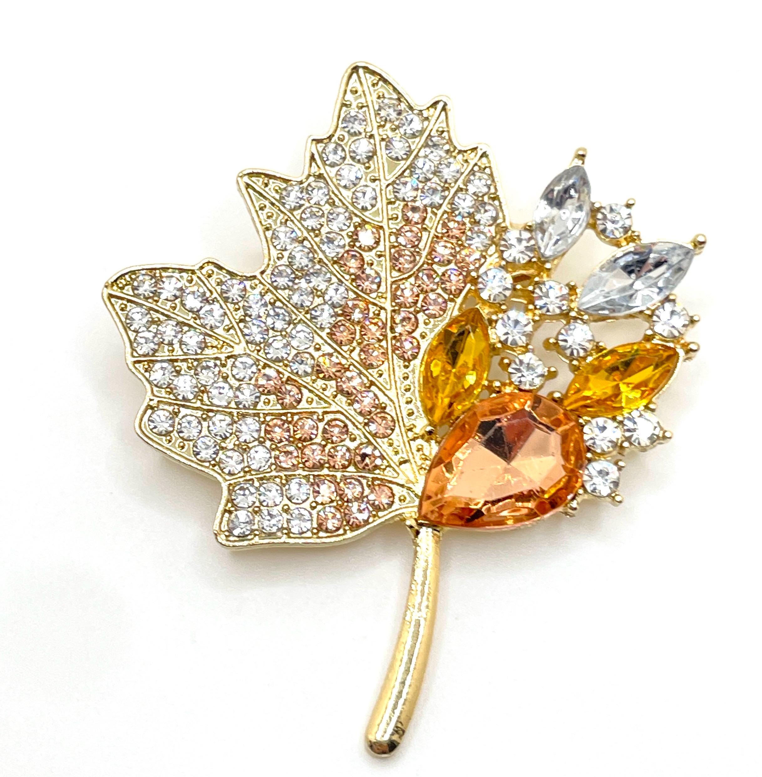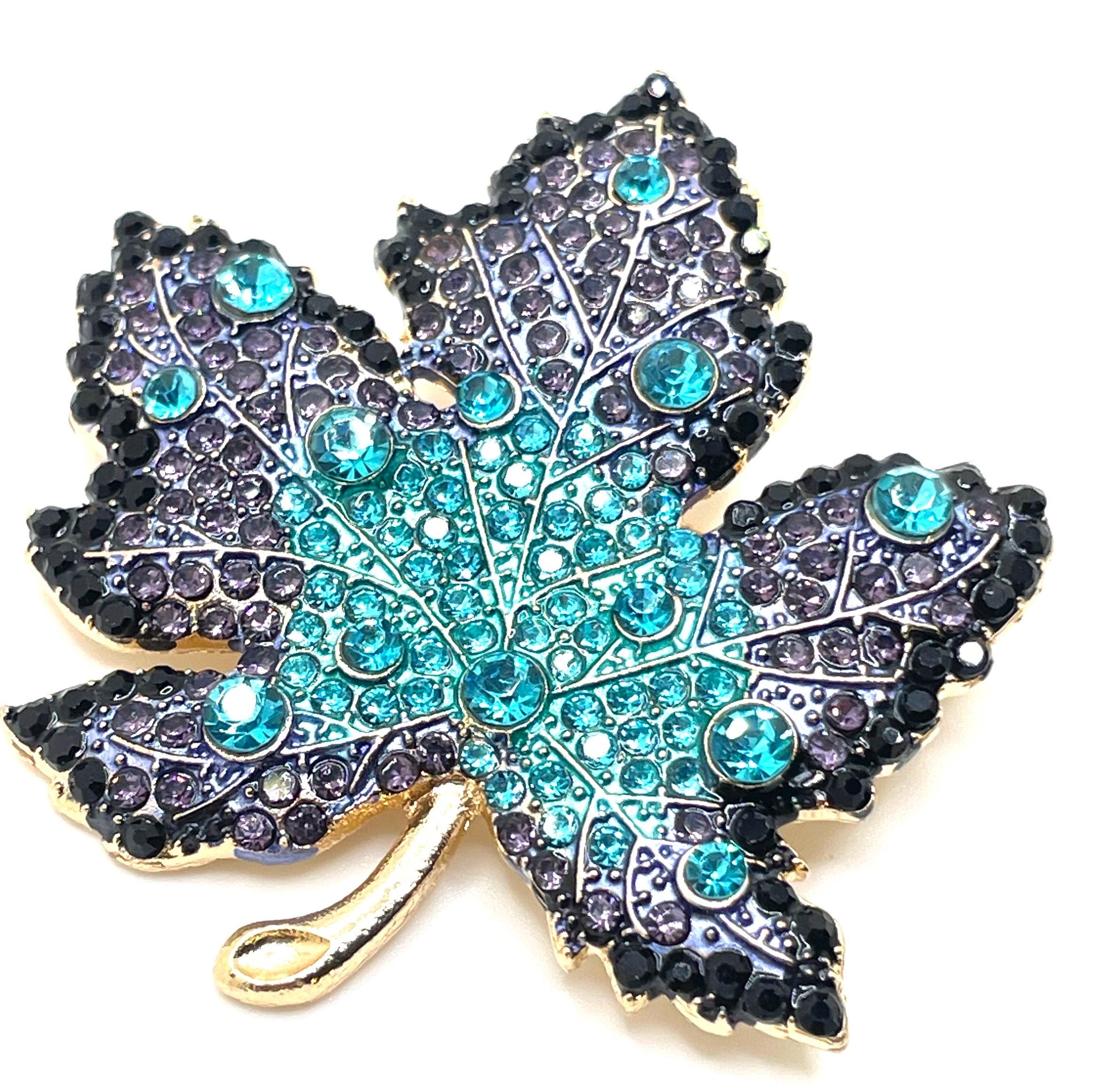 Celebrate the beauty of fall with this sparkling rhinestone maple leaf brooch, available in your choice of Blue, Green, Golden, or Orange. Each leaf is pave set with shimmering rhinestones in a gold tone metal finish, capturing the warm glow of the season.