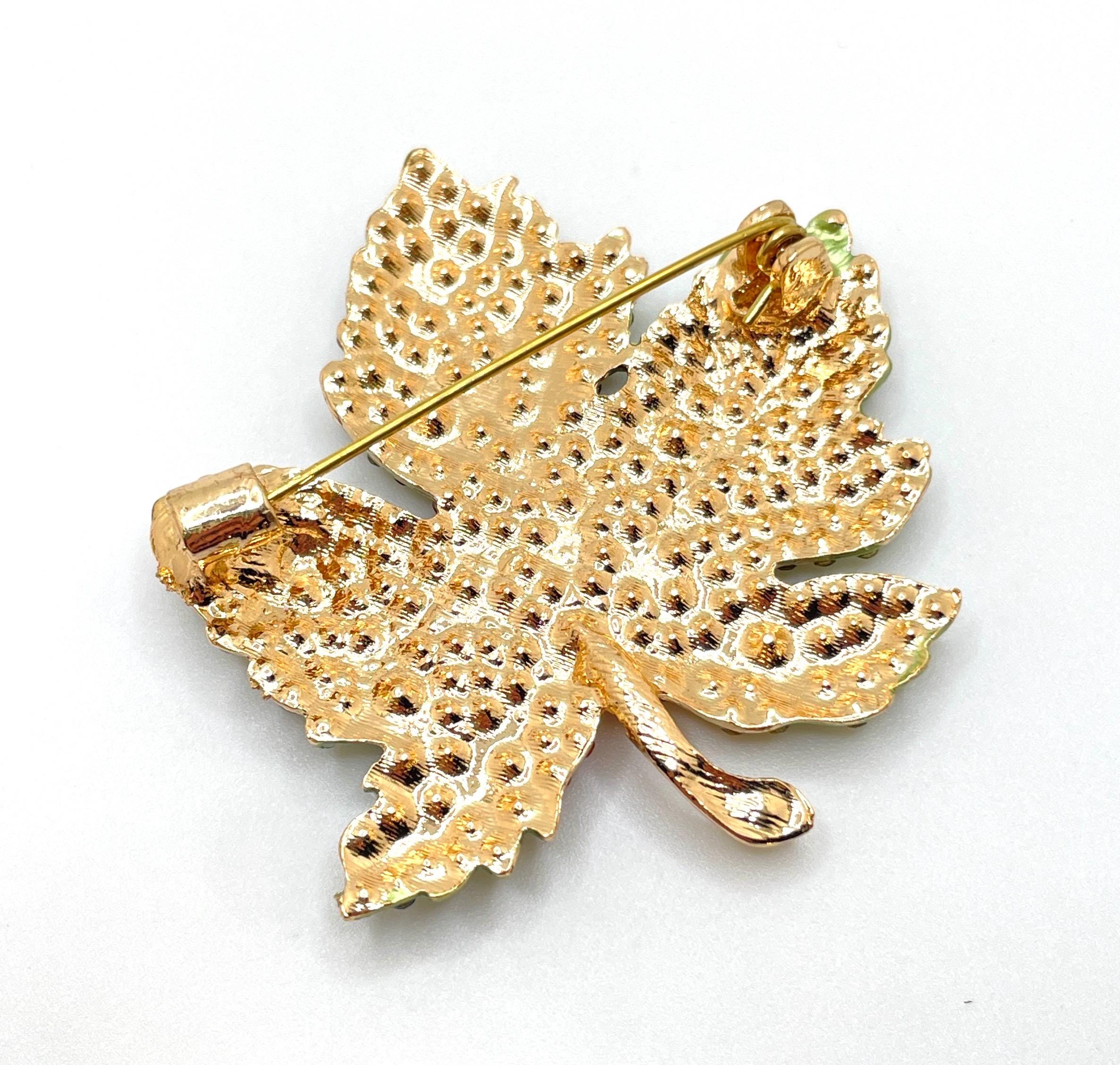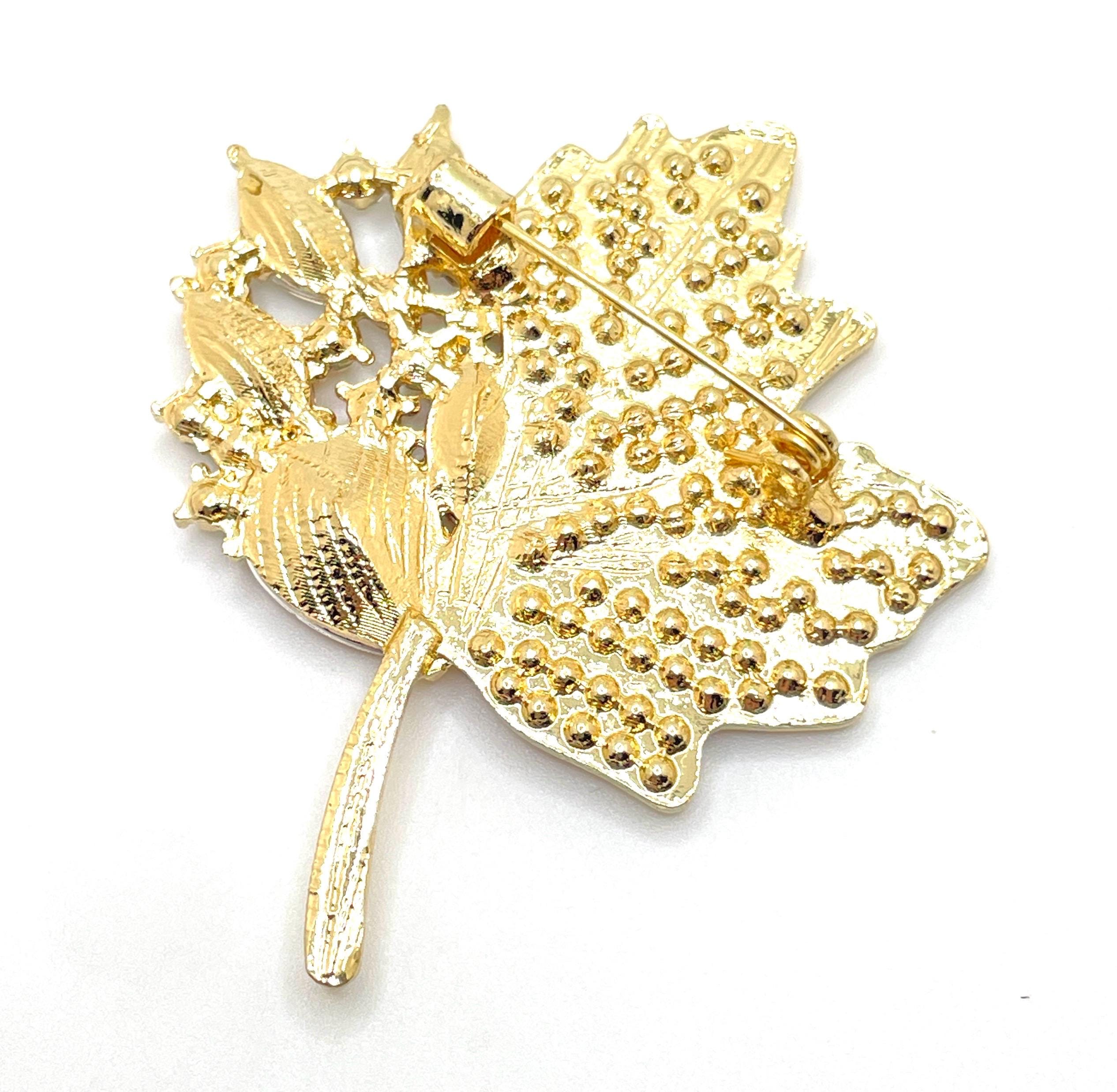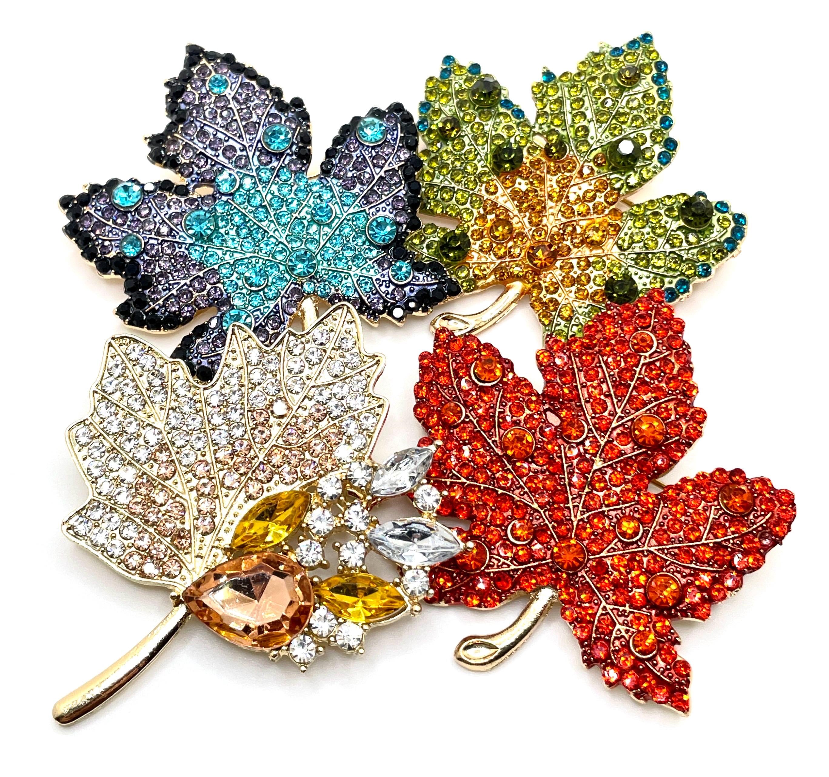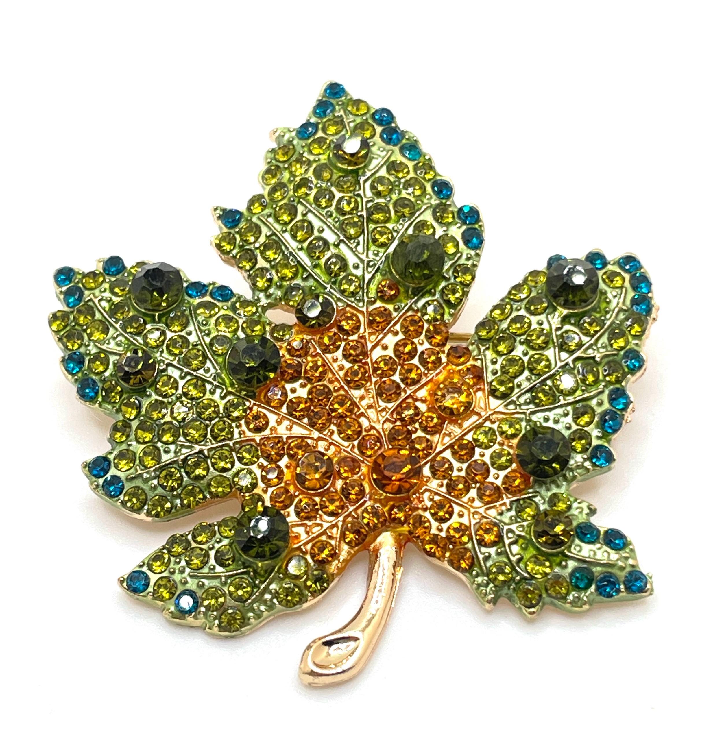 Celebrate the beauty of fall with this sparkling rhinestone maple leaf brooch, available in your choice of Blue, Green, Golden, or Orange. Each leaf is pave set with shimmering rhinestones in a gold tone metal finish, capturing the warm glow of the season.