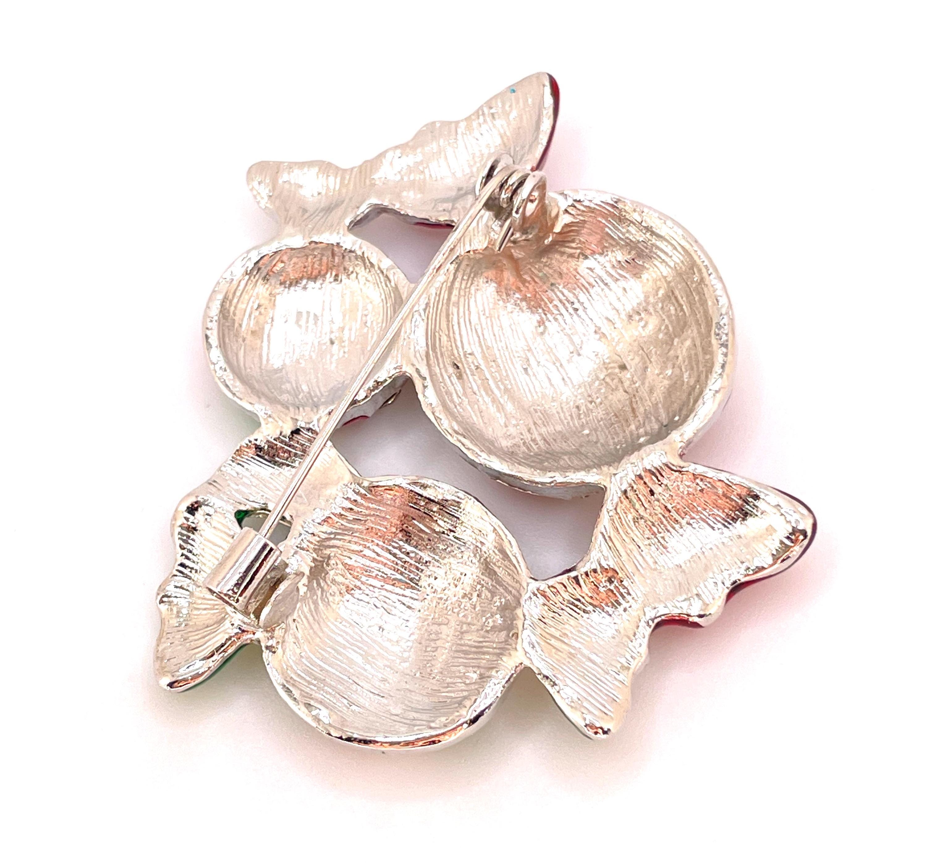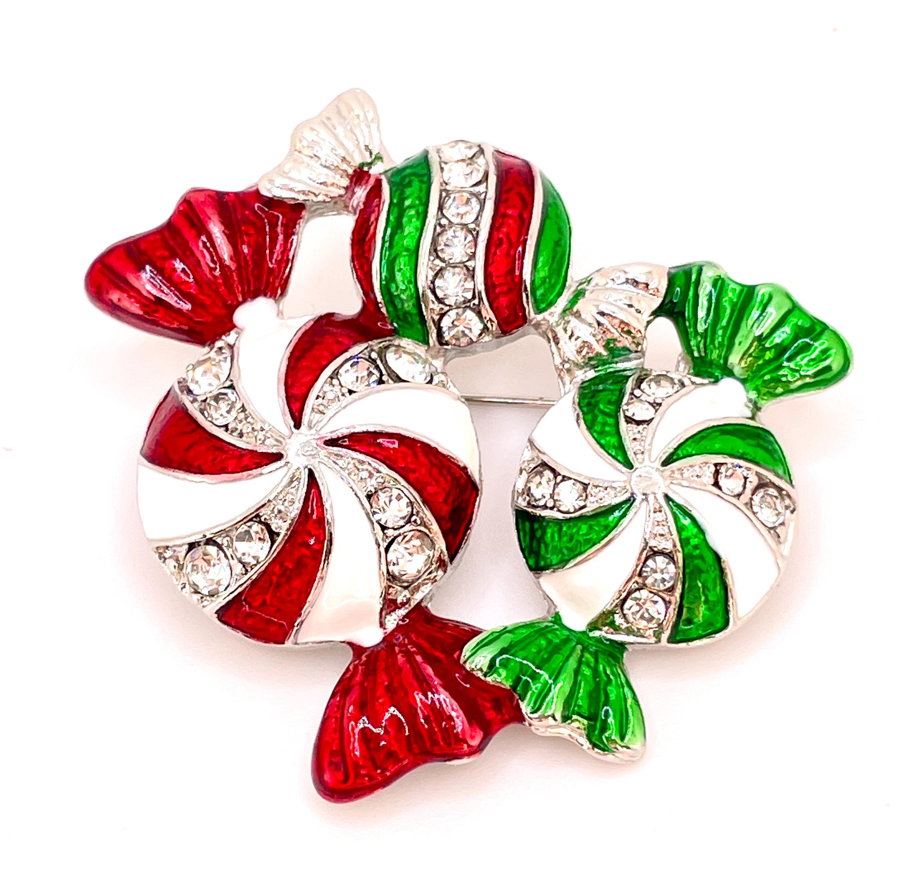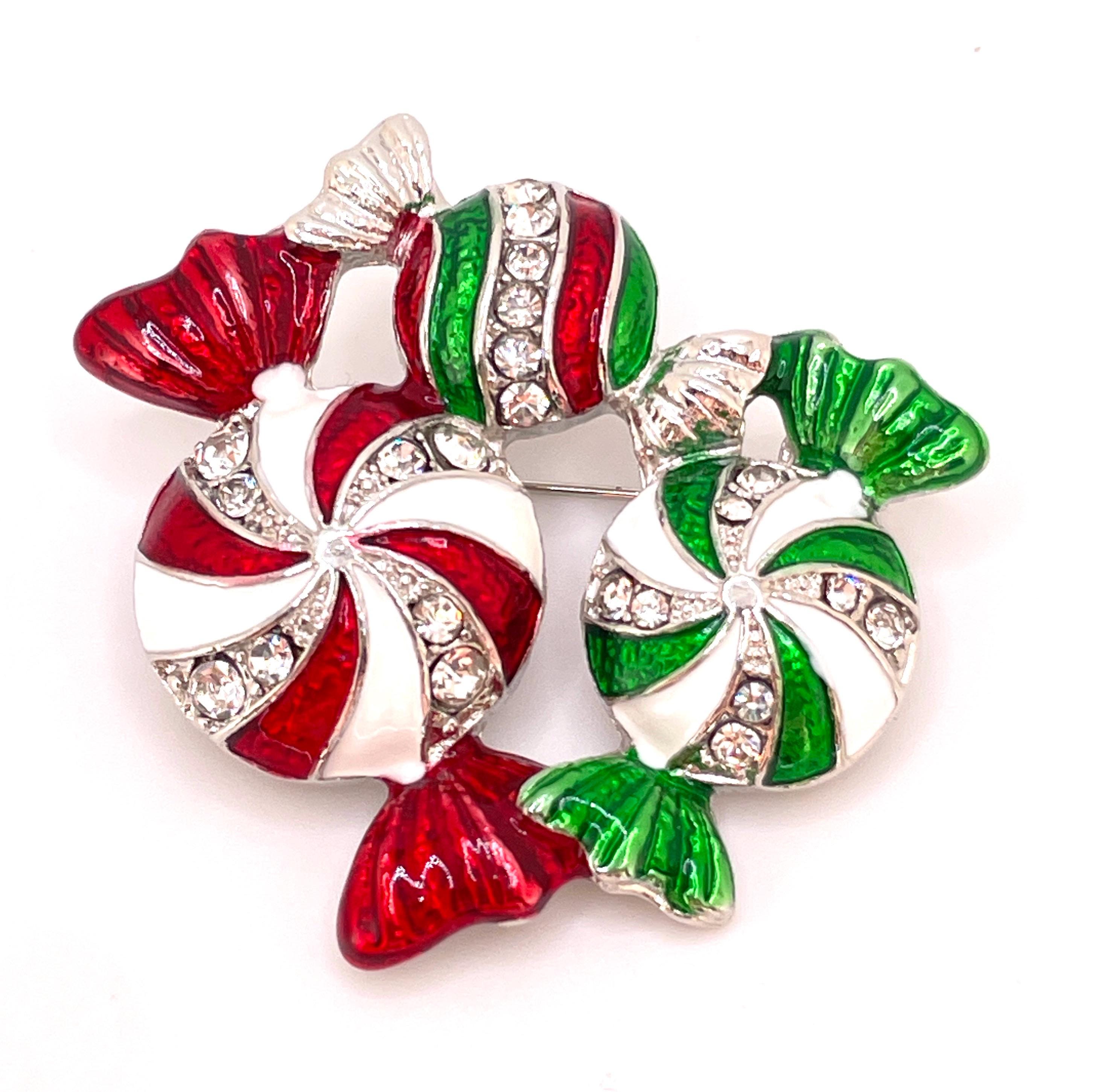 Add a sweet touch of holiday sparkle with this Starlight Peppermint Candy Brooch, featuring three individually wrapped peppermints in festive red, white, and green enamel. Each candy is accented with clear rhinestones, giving this charming piece just the right amount of shimmer for the season. Set in silver tone metal, it’s both durable and high quality — perfect for wearing or crafting.