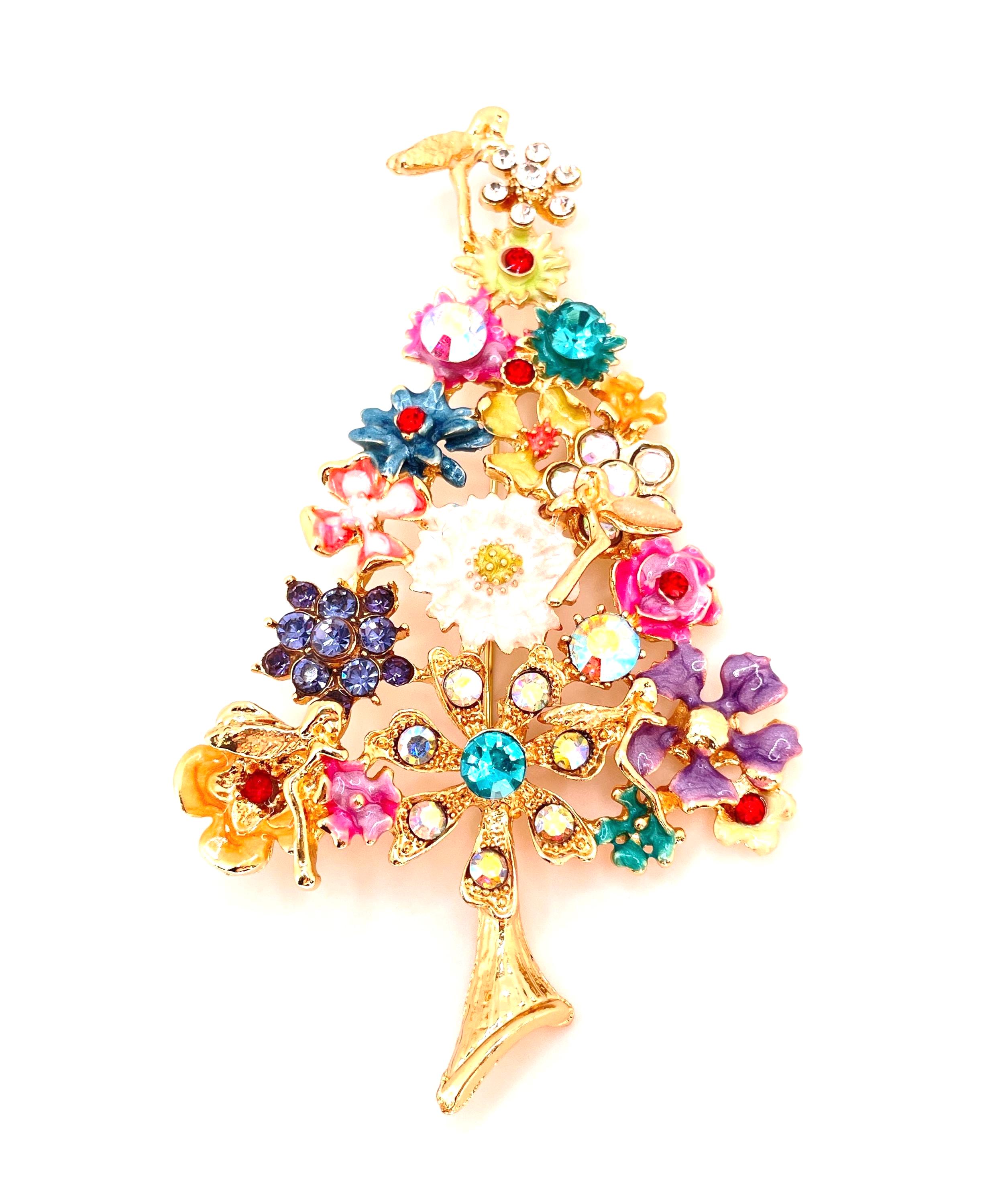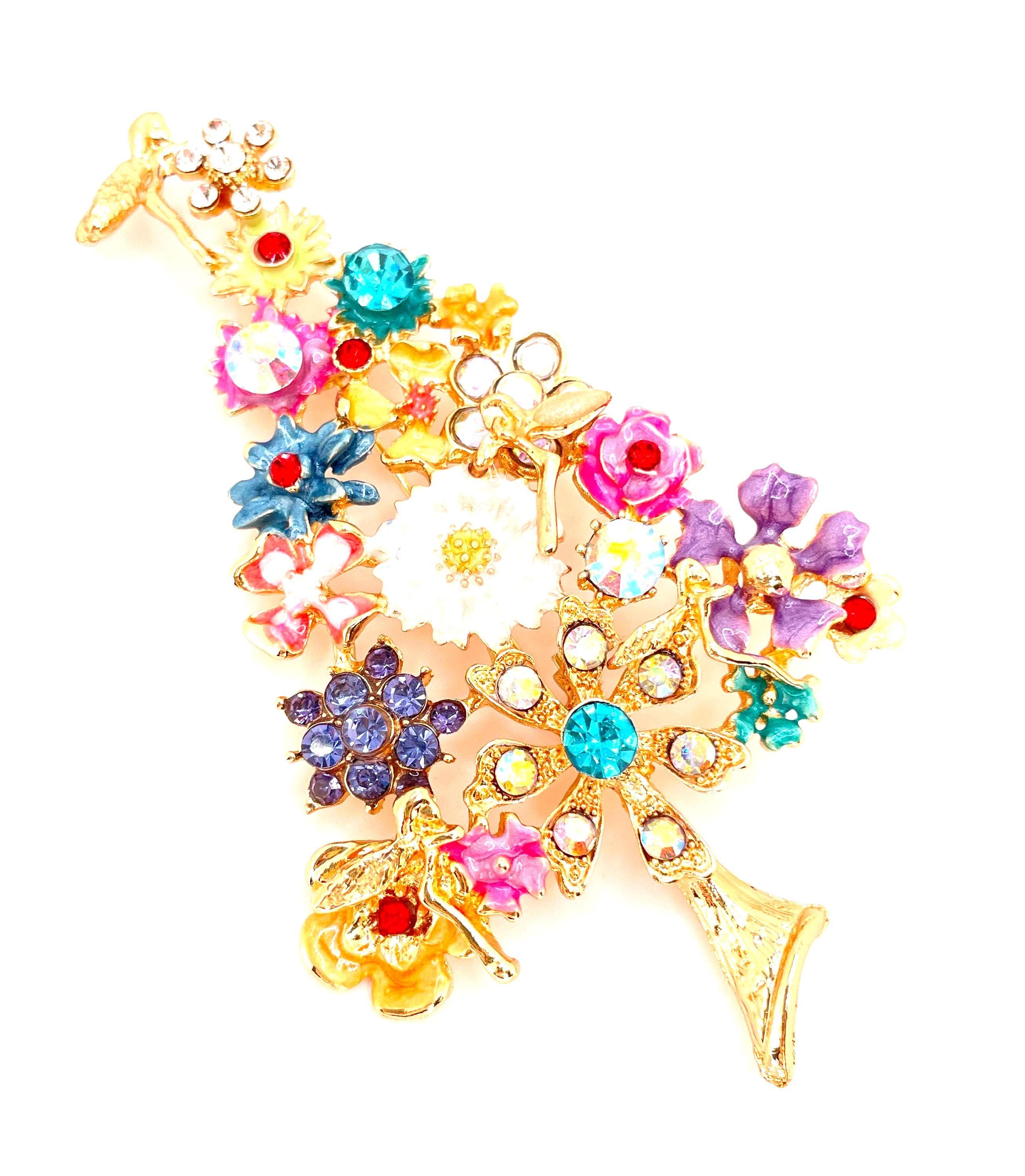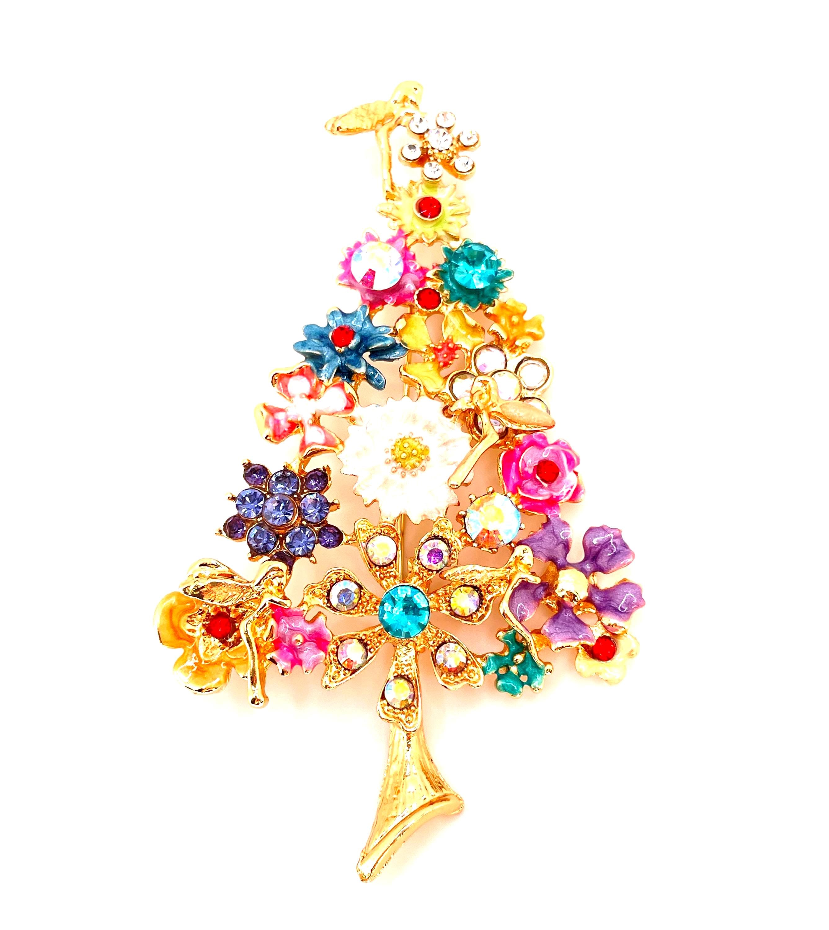 Add some magical holiday charm to your collection with this stunning oversized Christmas tree brooch/pendant. Featuring vibrant multi-color enamel flowers, sparkling rhinestones, and shimmering AB crystals, this piece is full of festive detail. Four raised gold-tone fairies dance throughout the design, giving it an enchanting, whimsical touch.