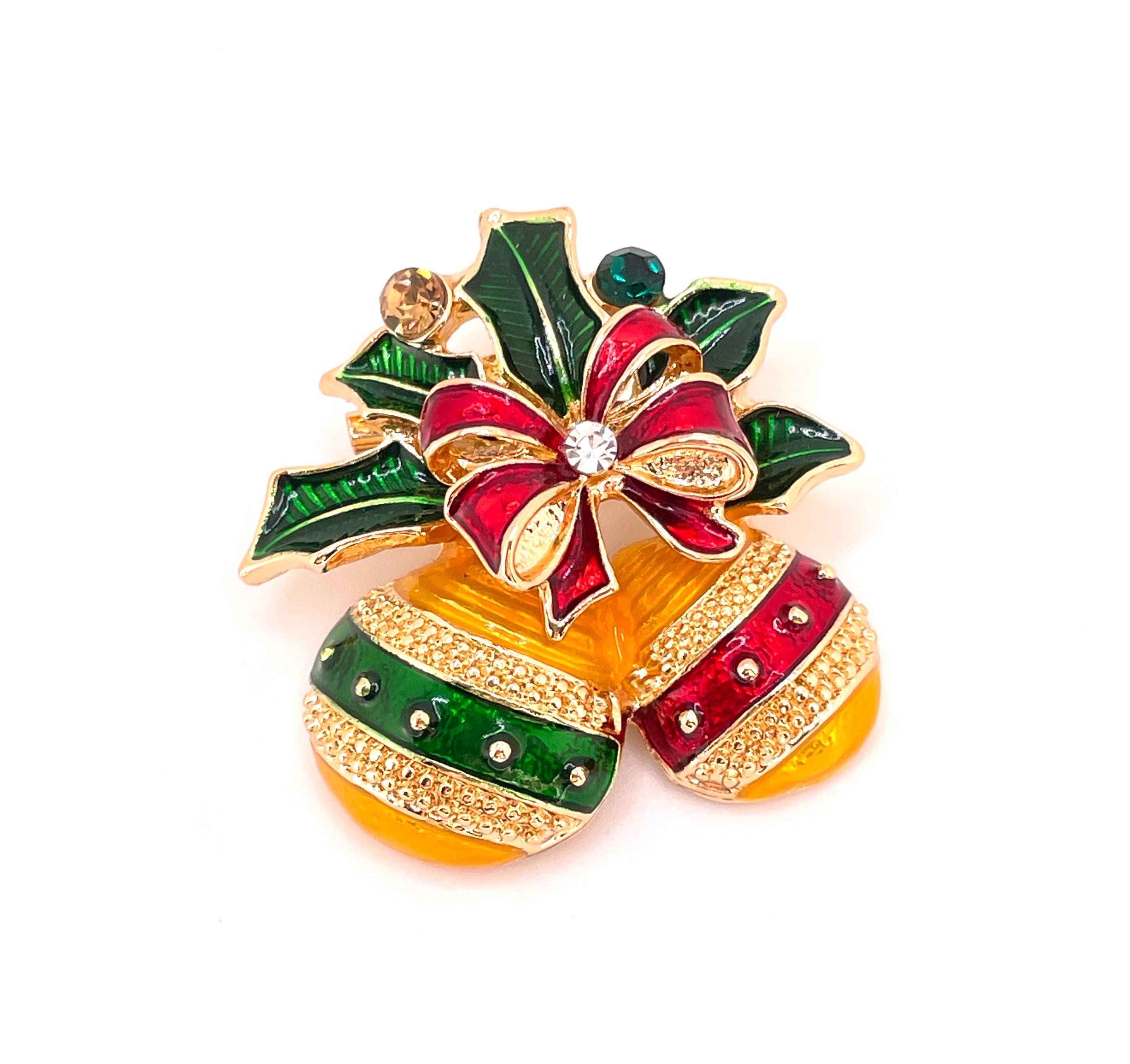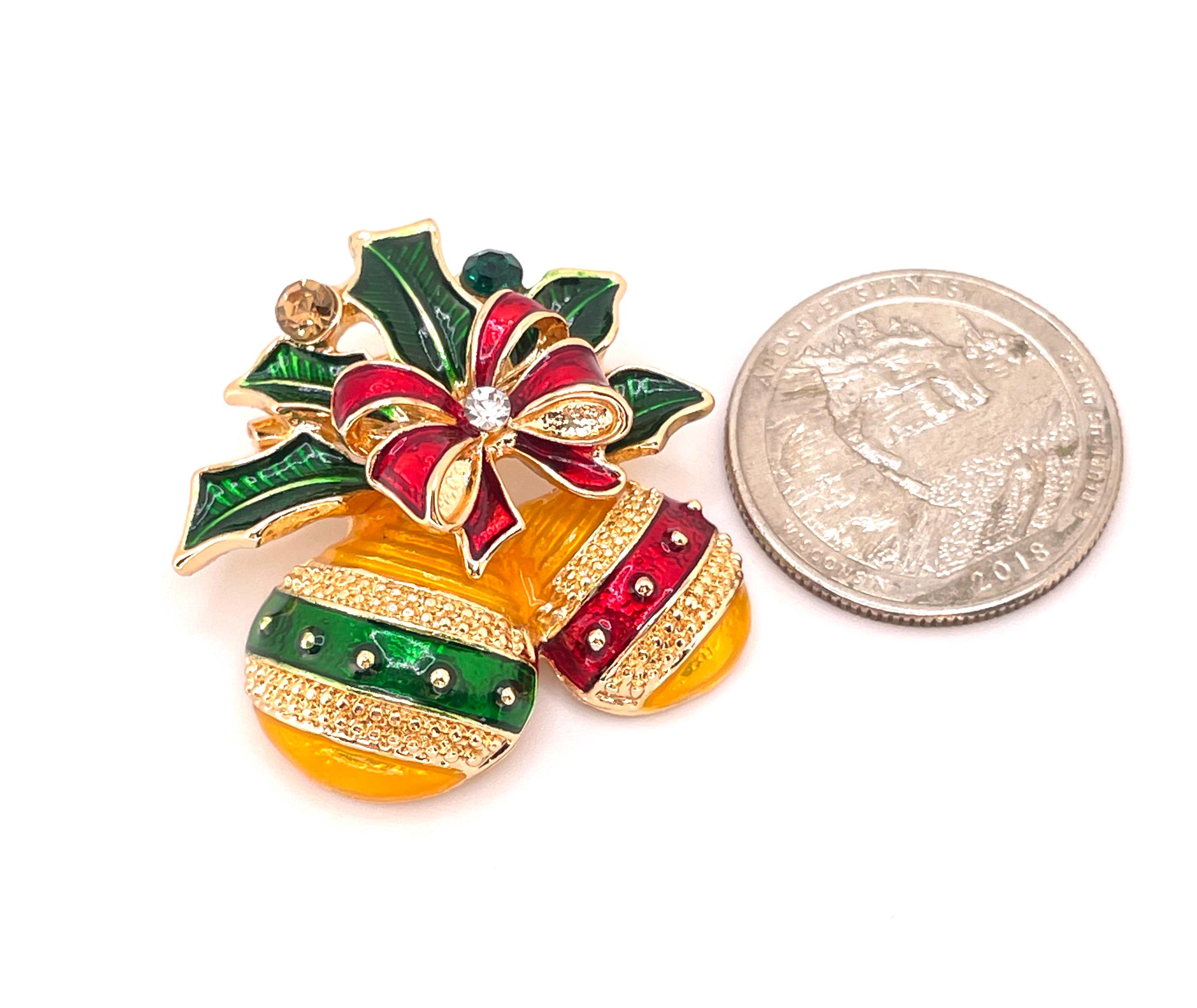 Bring bold holiday cheer to your outfit or craft project with this striking Christmas ornament brooch! Featuring two raised golden enamel ornaments with vivid red and green enamel stripes, this piece offers a beautiful 3D effect while remaining fixed in place for durability. Each ornament hangs from a coordinating red and green enamel bow accented with sparkling rhinestones and green enamel holly leaves.
