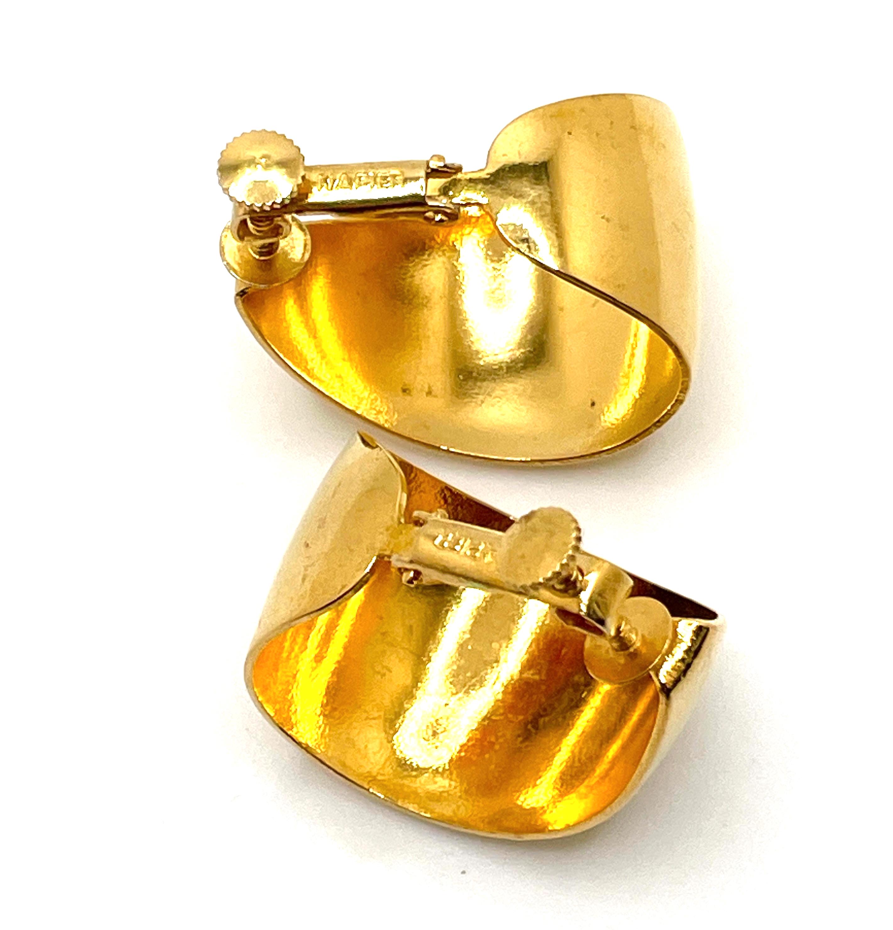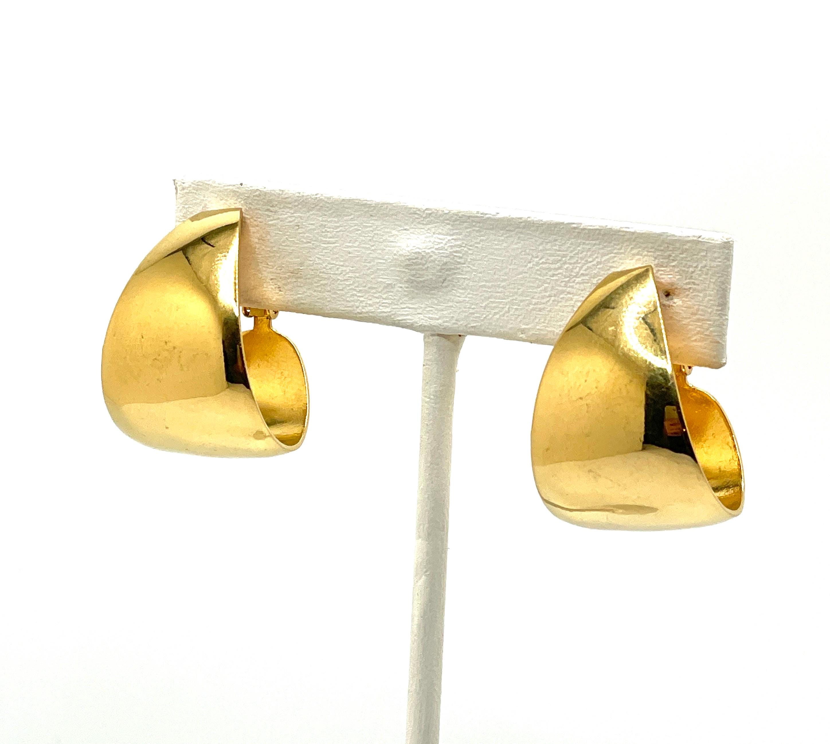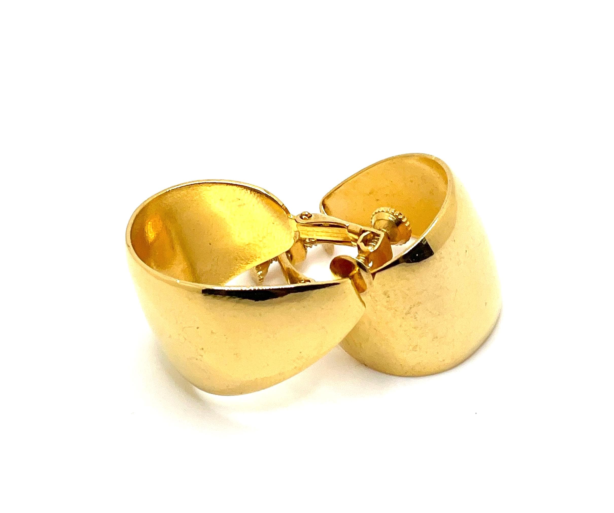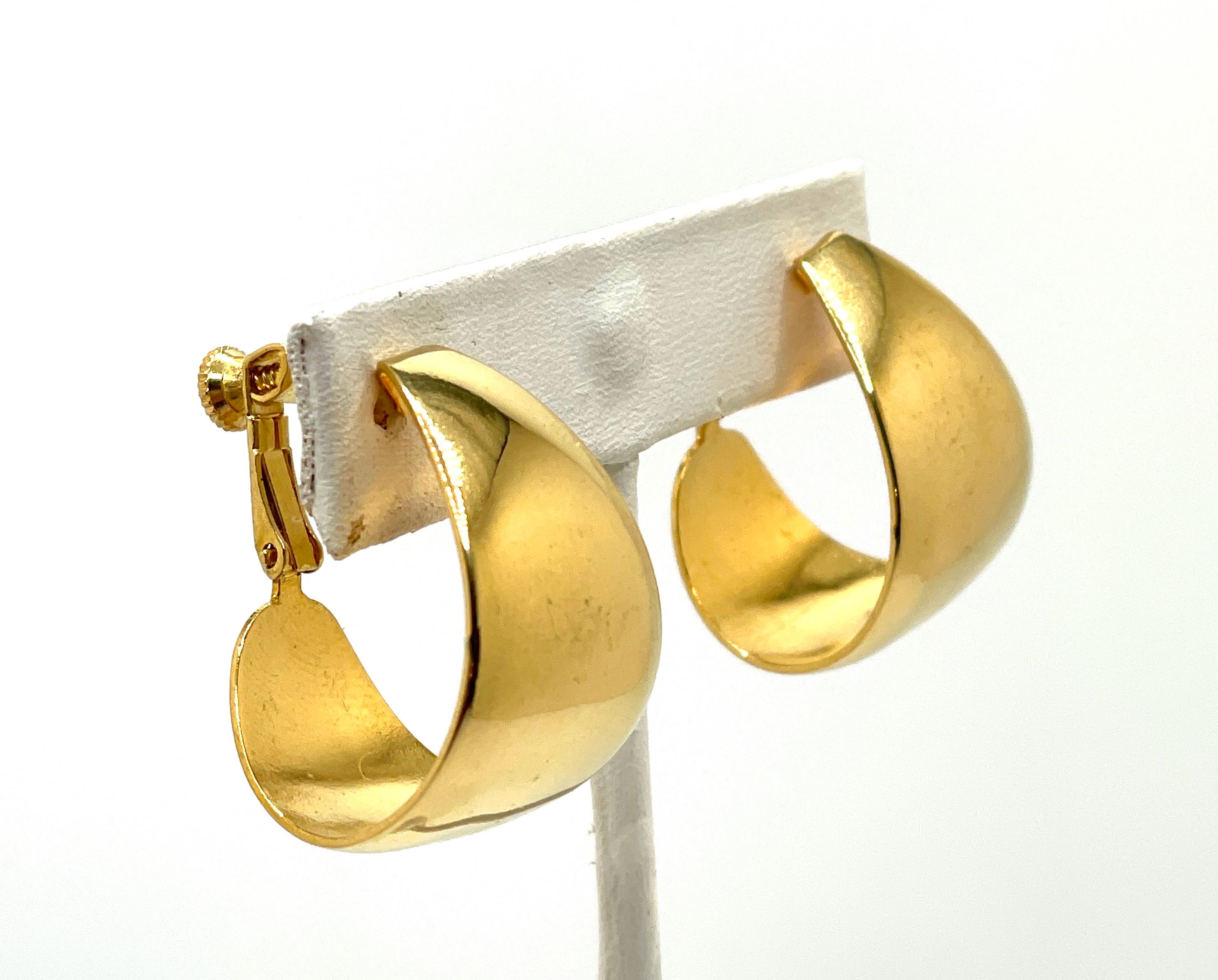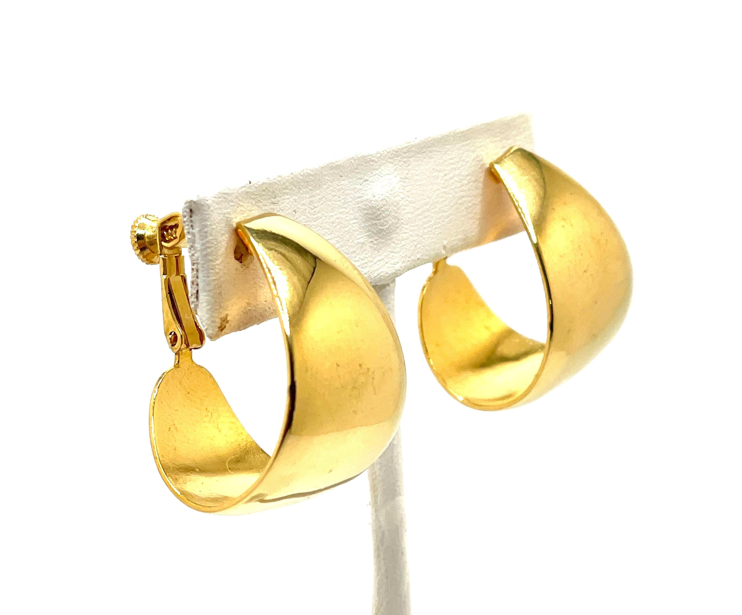 Elevate your vintage style with these stunning Napier wide hoop earrings, crafted in burnished 18K gold plated metal. These beauties feature a bold, tapered silhouette—wider at the center and elegantly slimming at the ends. Signed by Napier and dating to the chic 1980s, they’re a classic statement piece with a unique twist! Adjustable screw back fastenings offer comfort and versatility, perfect for both pierced and non-pierced ears.