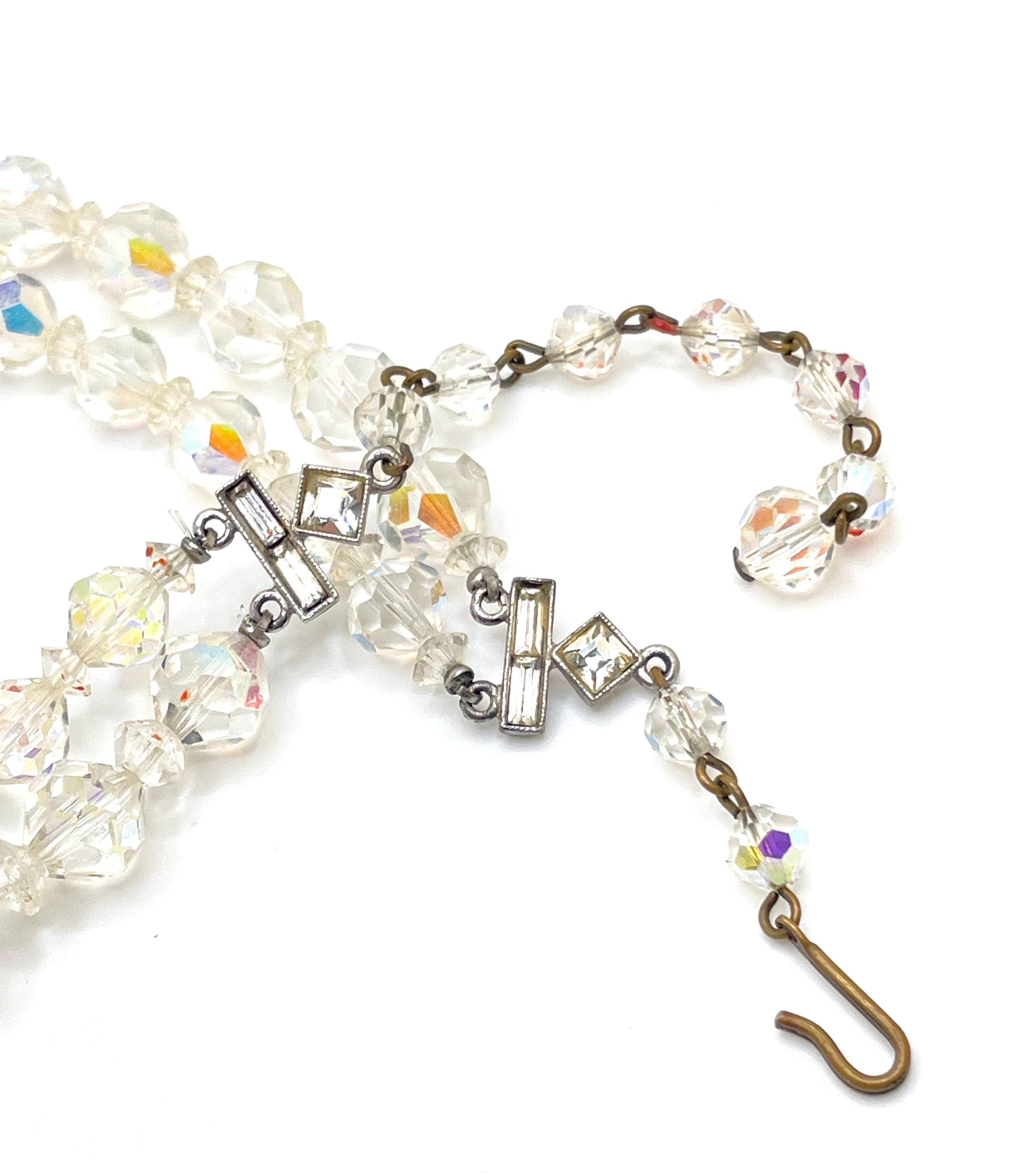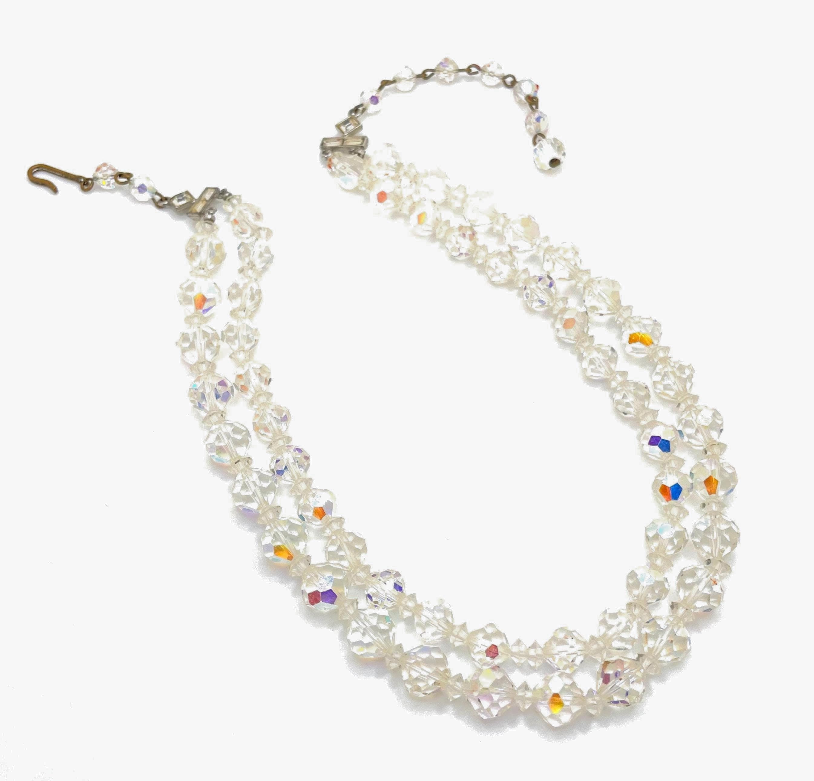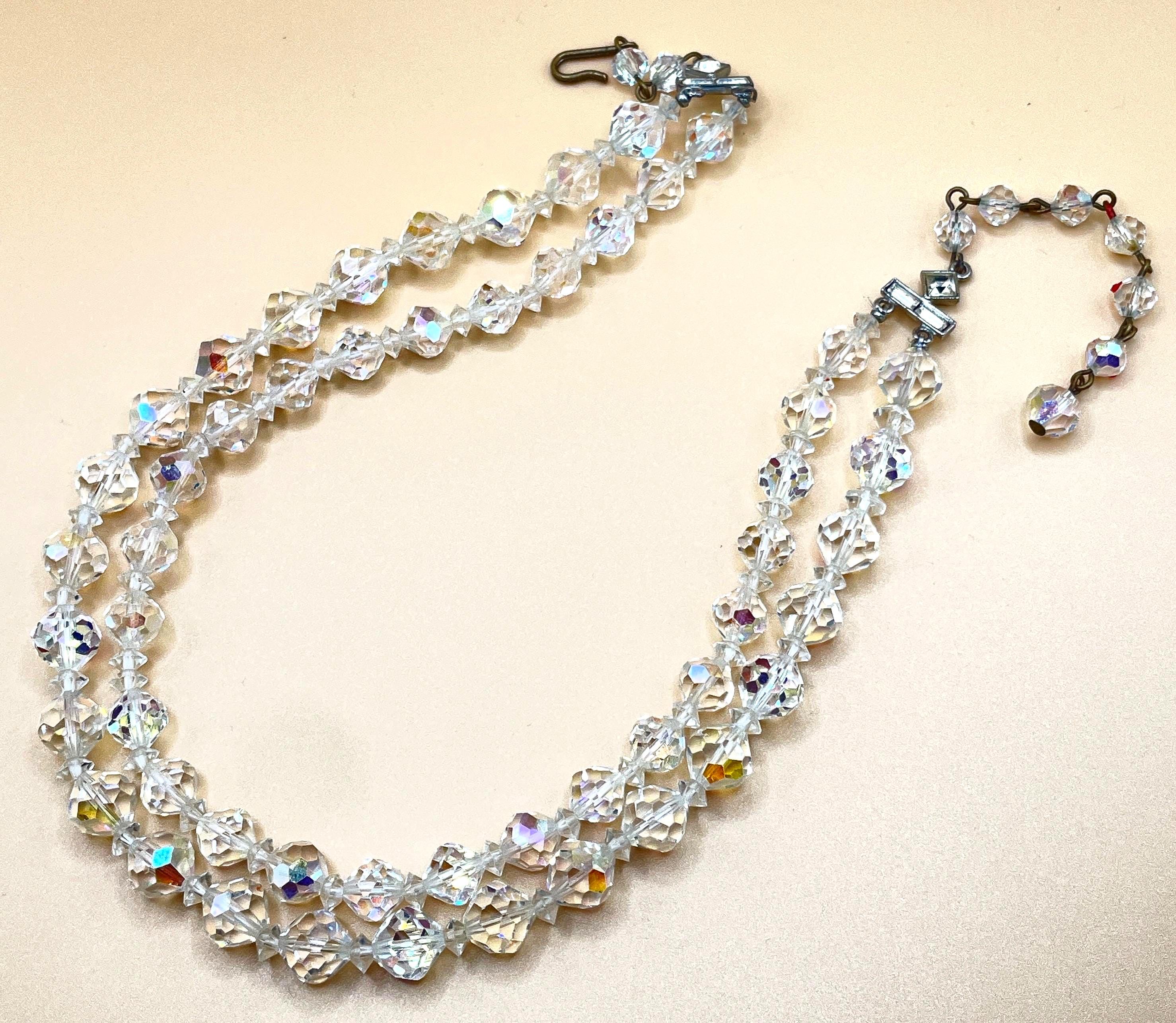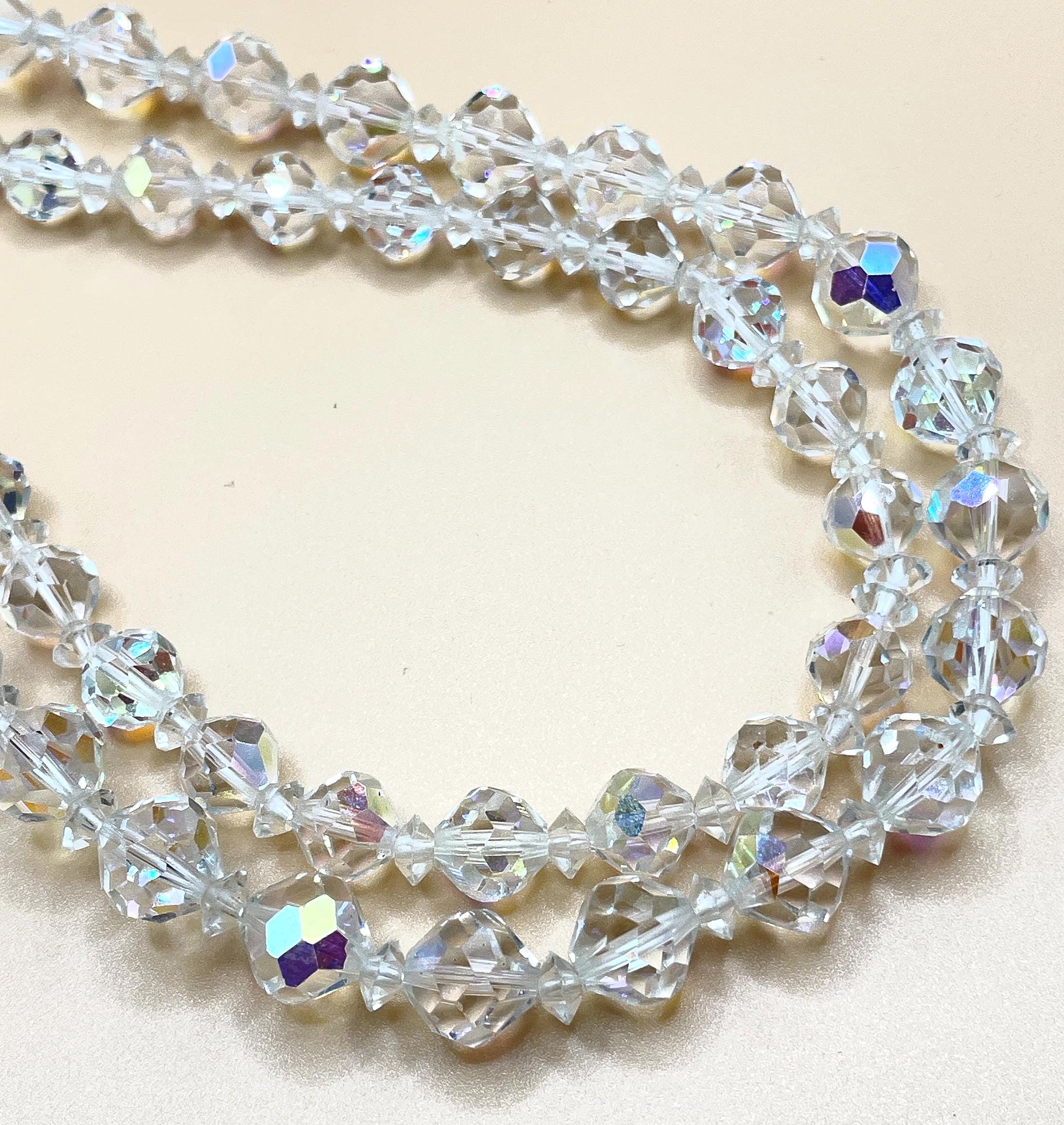This dazzling vintage choker features graduated double strands of aurora borealis crystal glass beads, offering beautiful rainbow sparkle with every movement. The bottom strand showcases 9mm round faceted crystals, while the top strand features 7mm round faceted crystals, accented with small faceted disc spacers for added dimension. Both strands connect to vintage rhinestone connectors on each side, finished with a classic hook clasp.