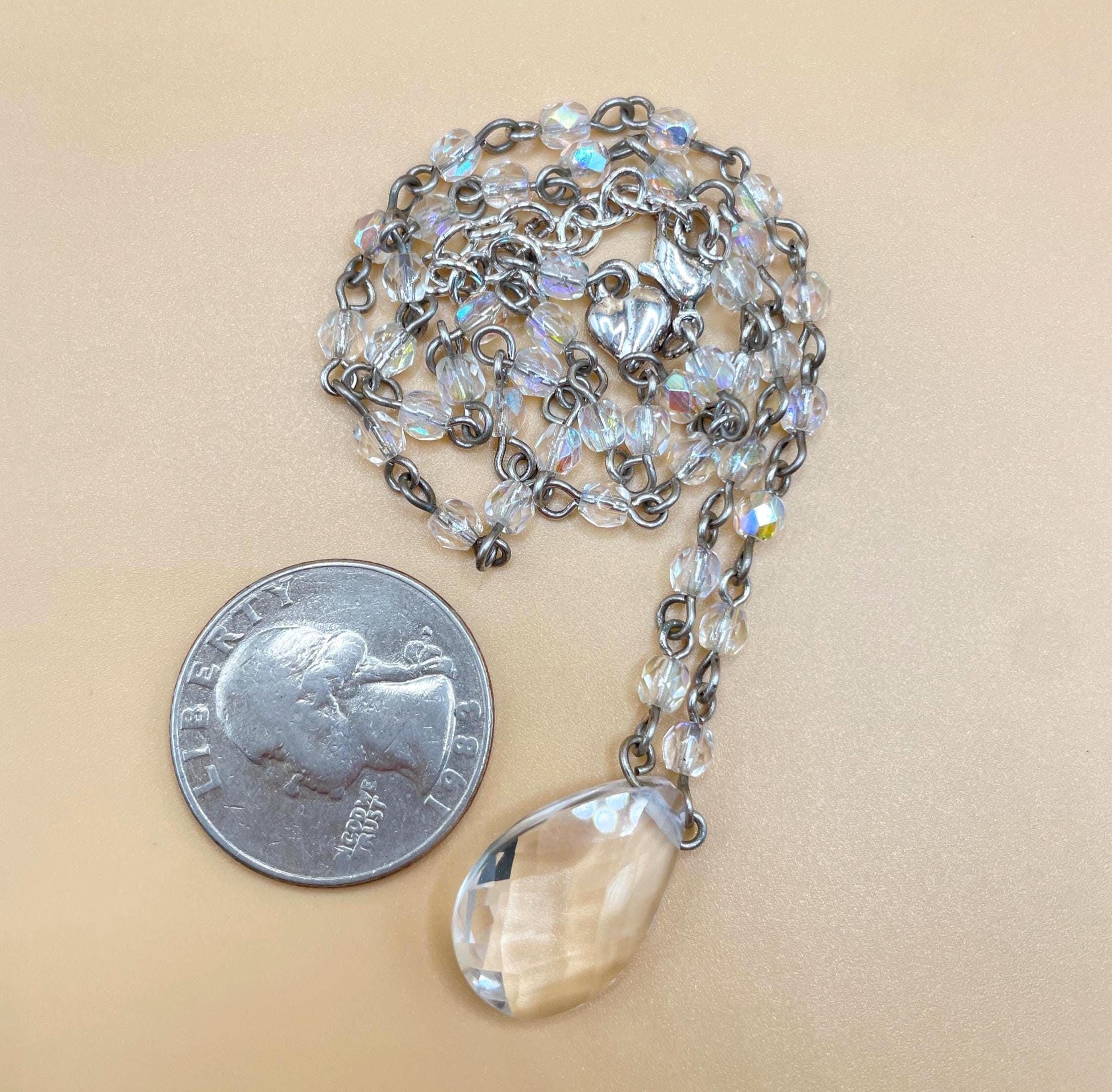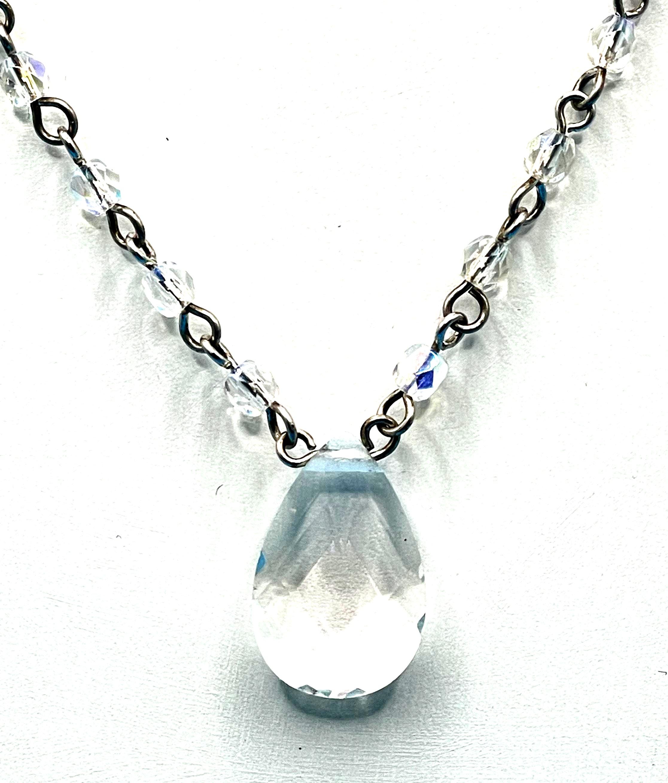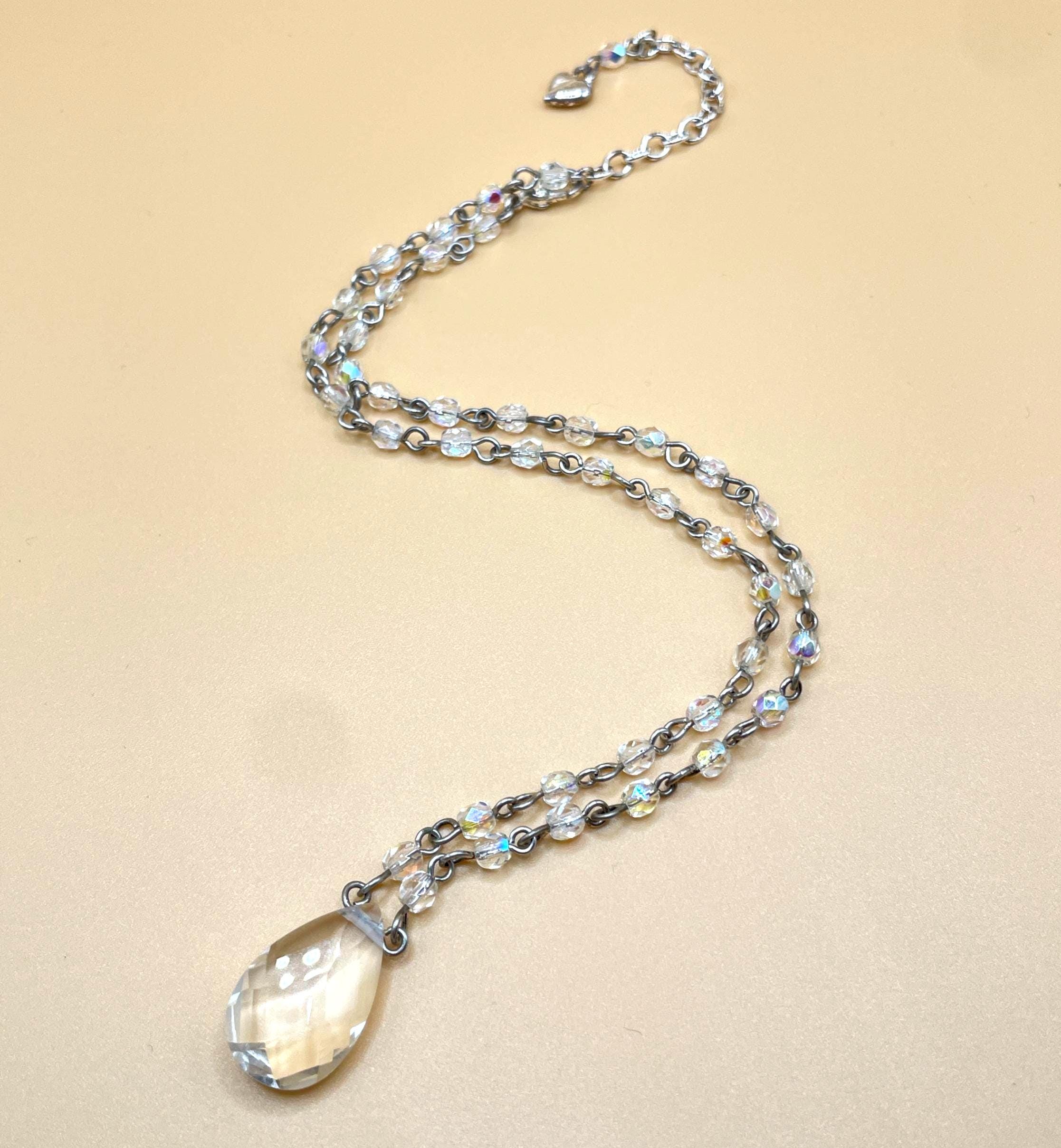 This elegant vintage pendant necklace by Carolee features a beautifully faceted clear crystal teardrop that captures and reflects light with every movement. Suspended from a delicate silver tone chain accented with shimmering aurora borealis crystal beads, the piece has a graceful balance of simplicity and brilliance.