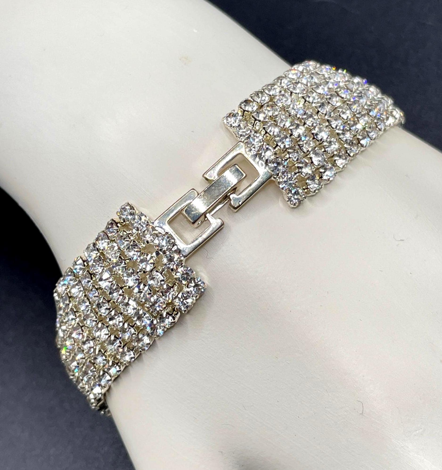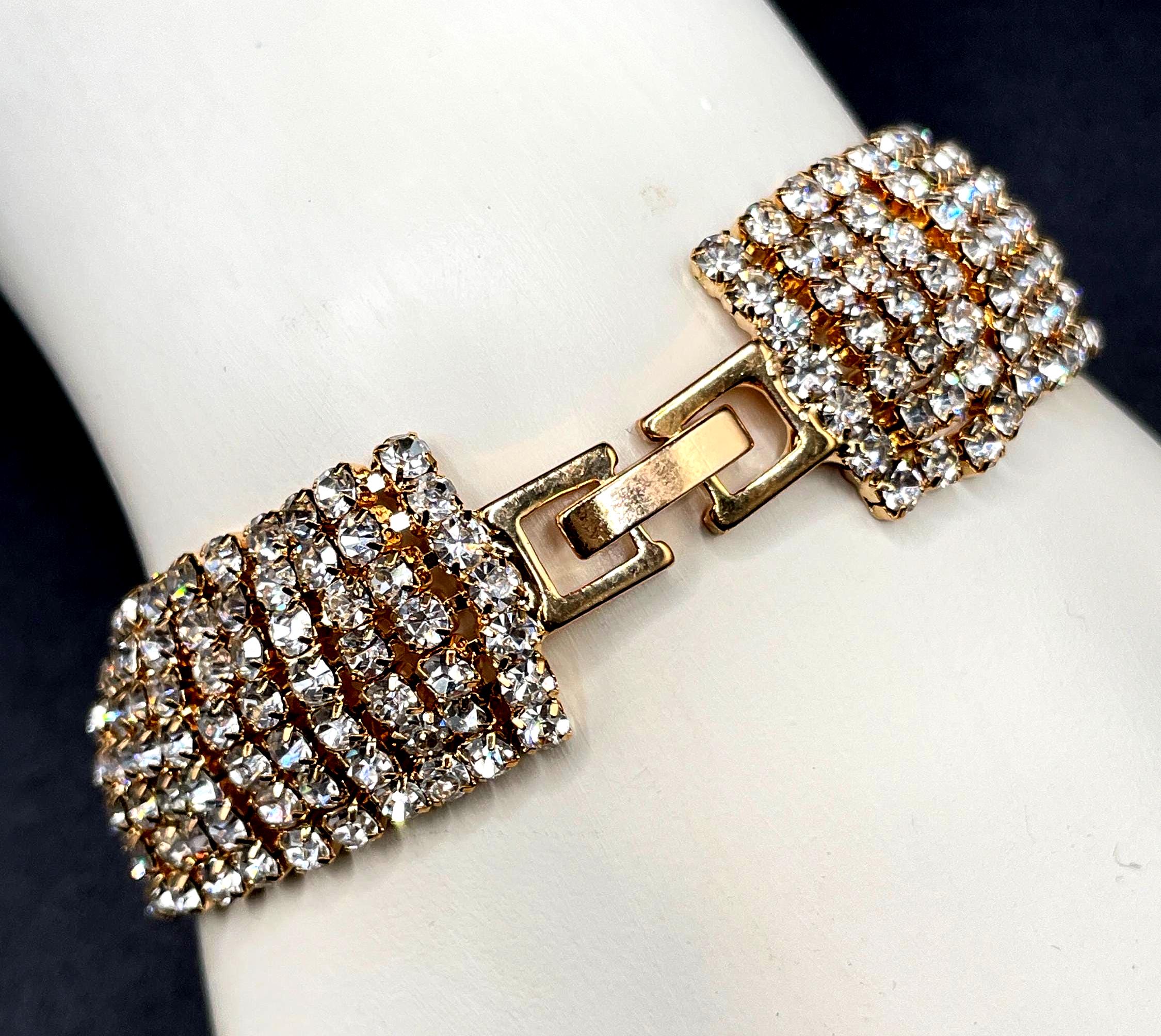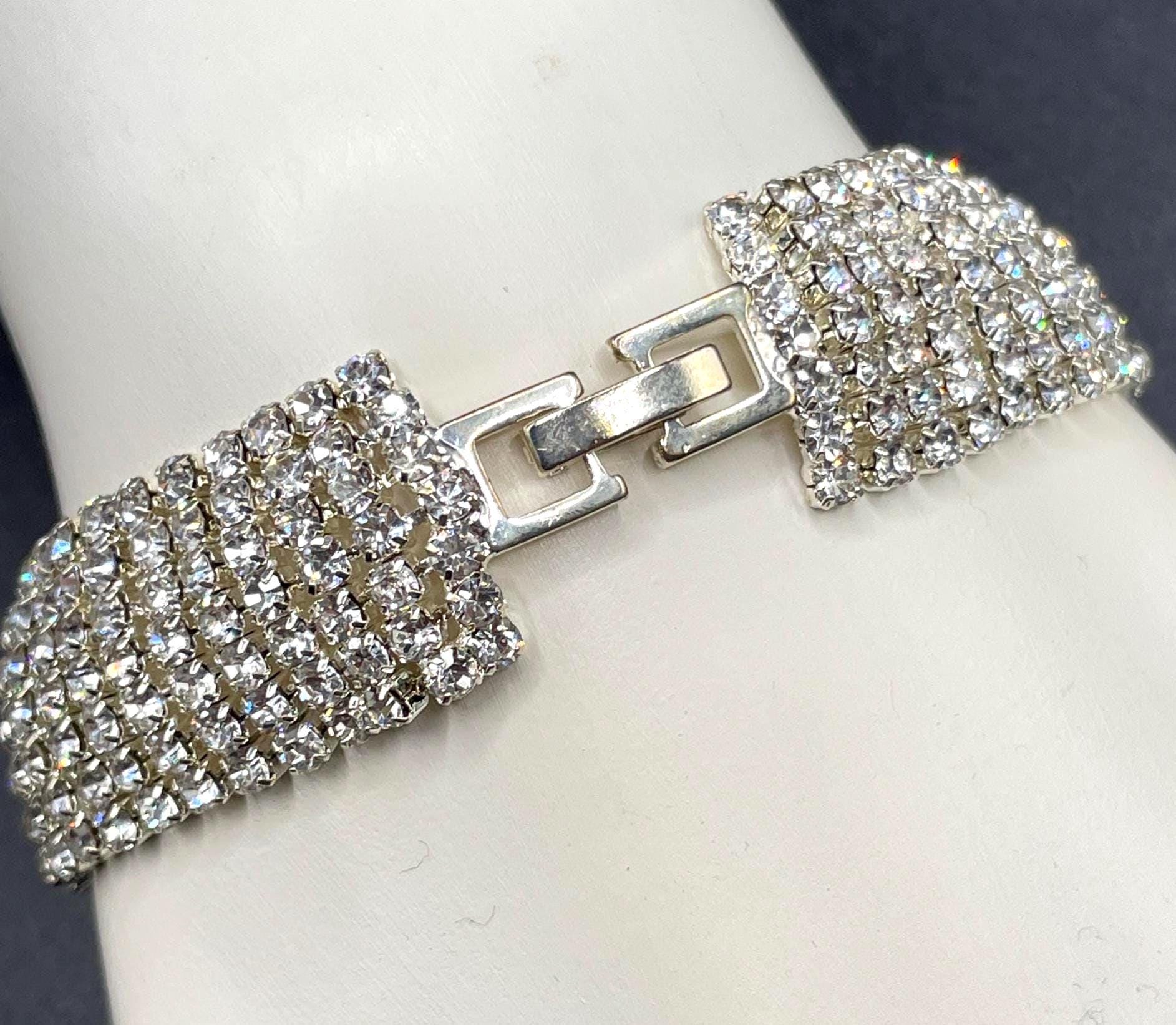 With its secure fold-over clasp and comfortable fit, this bracelet is both stylish and easy to wear. A perfect piece for rhinestone lovers, vintage collectors, or anyone who appreciates a little extra sparkle.