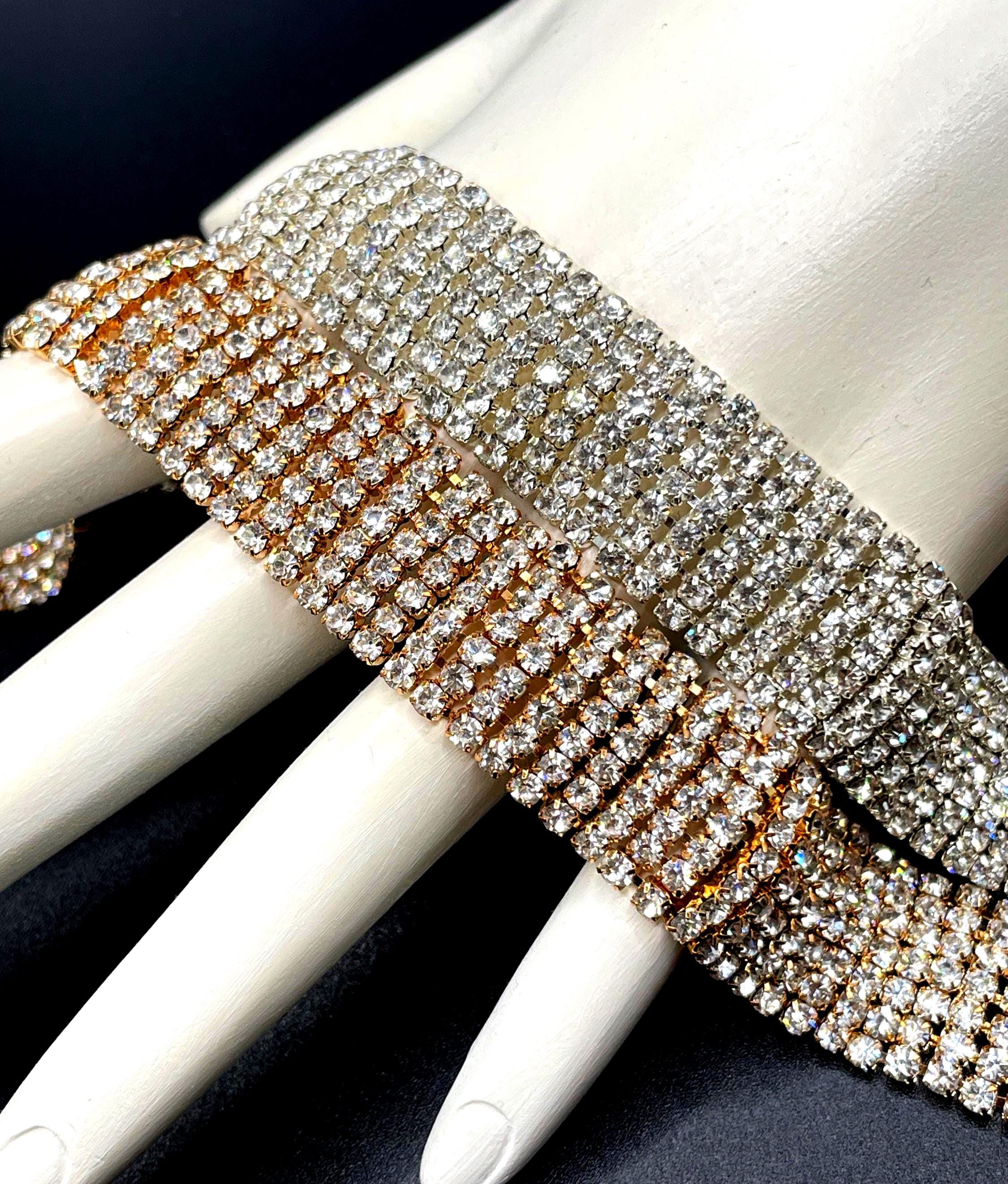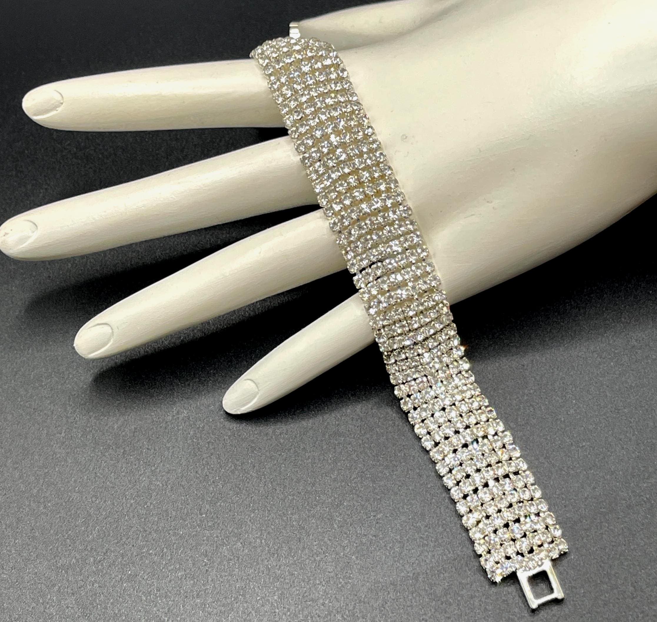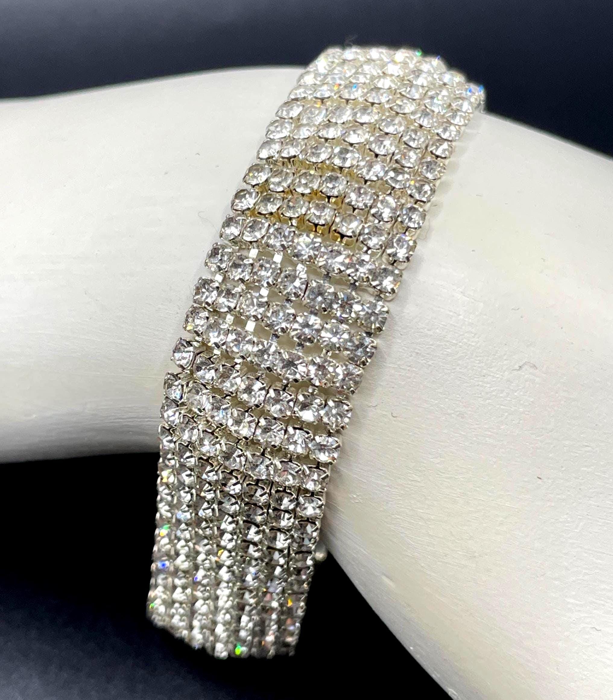 This vintage rhinestone link bracelet features seven dazzling rows of prong-set clear rhinestones, creating a brilliant statement piece that catches the light from every angle. The structured link design gives the bracelet a timeless elegance while still offering plenty of vintage sparkle.