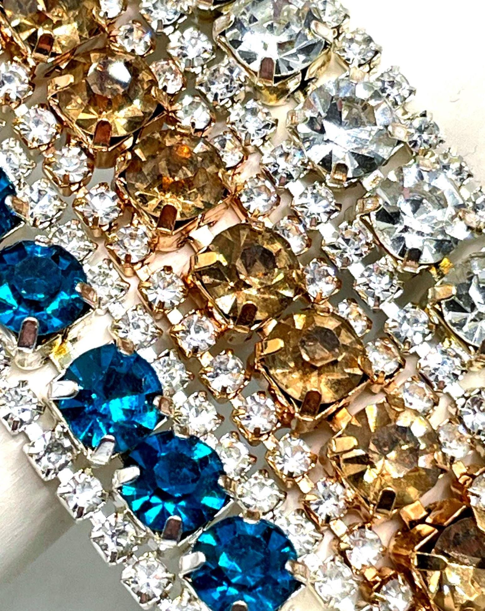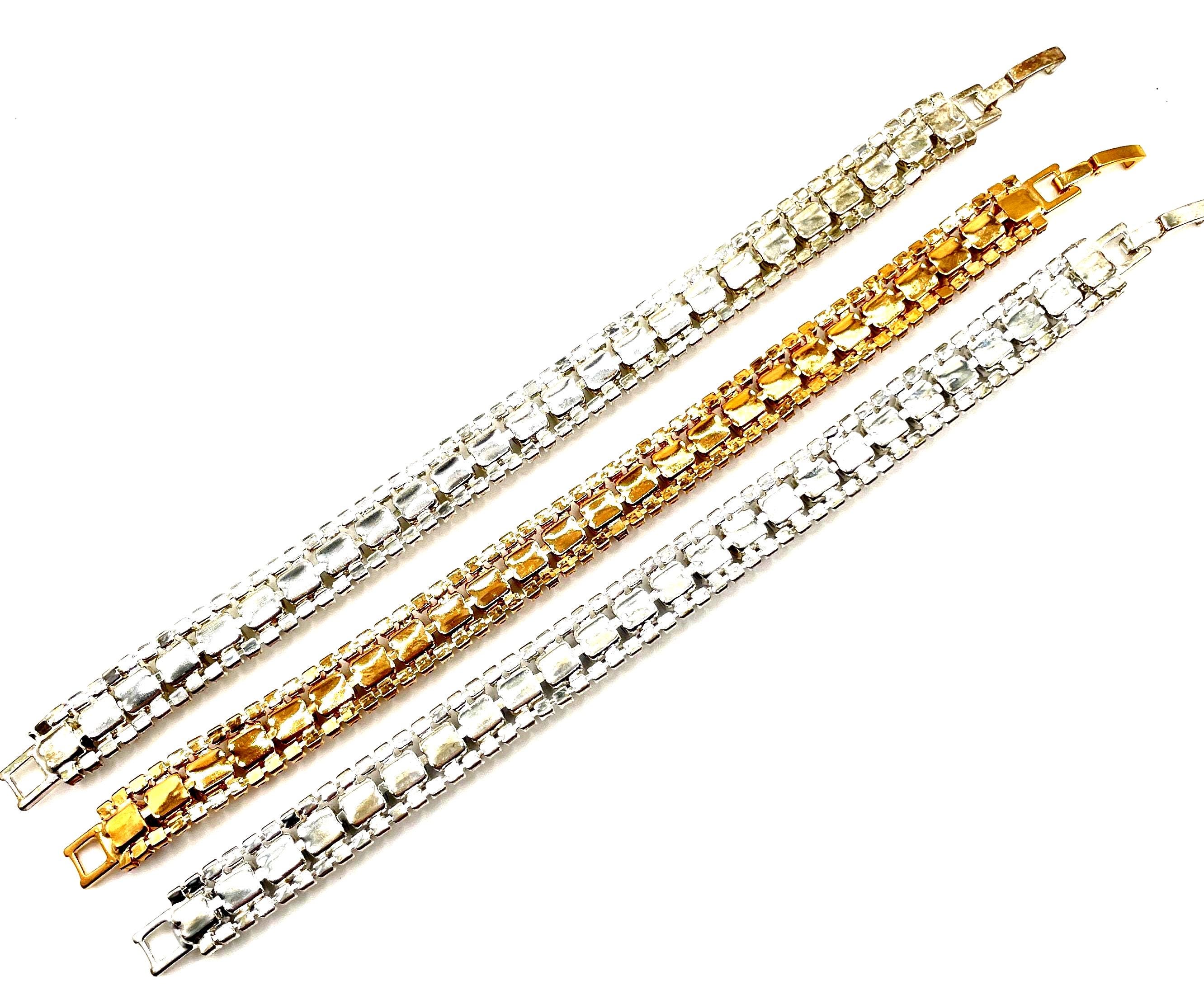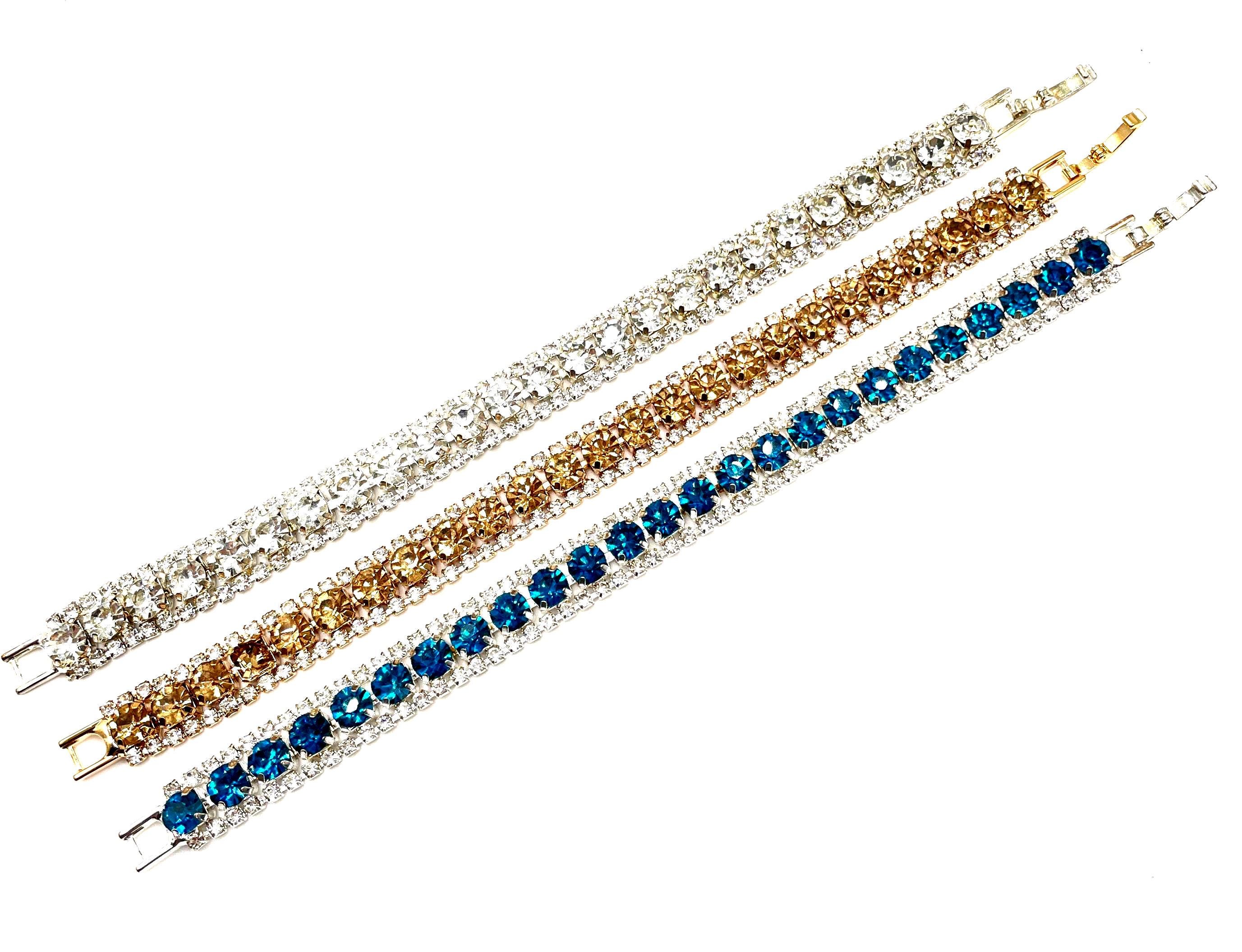A timeless sparkle with classic vintage charm! ✨ These beautiful rhinestone link bracelets feature a sleek three-row design that catches the light from every angle. The center row showcases larger stones, framed by two rows of smaller crystals for an elegant shimmer.