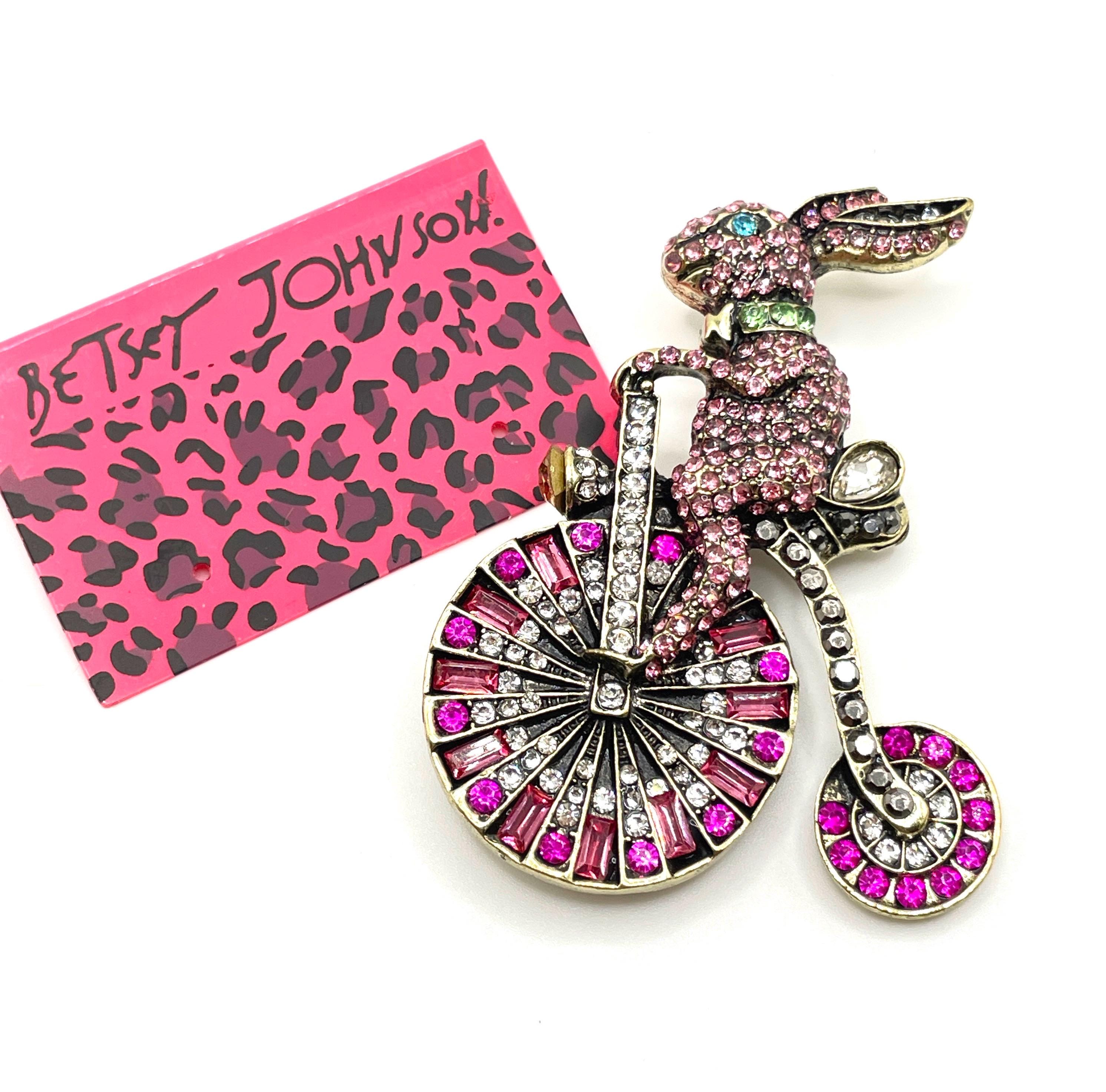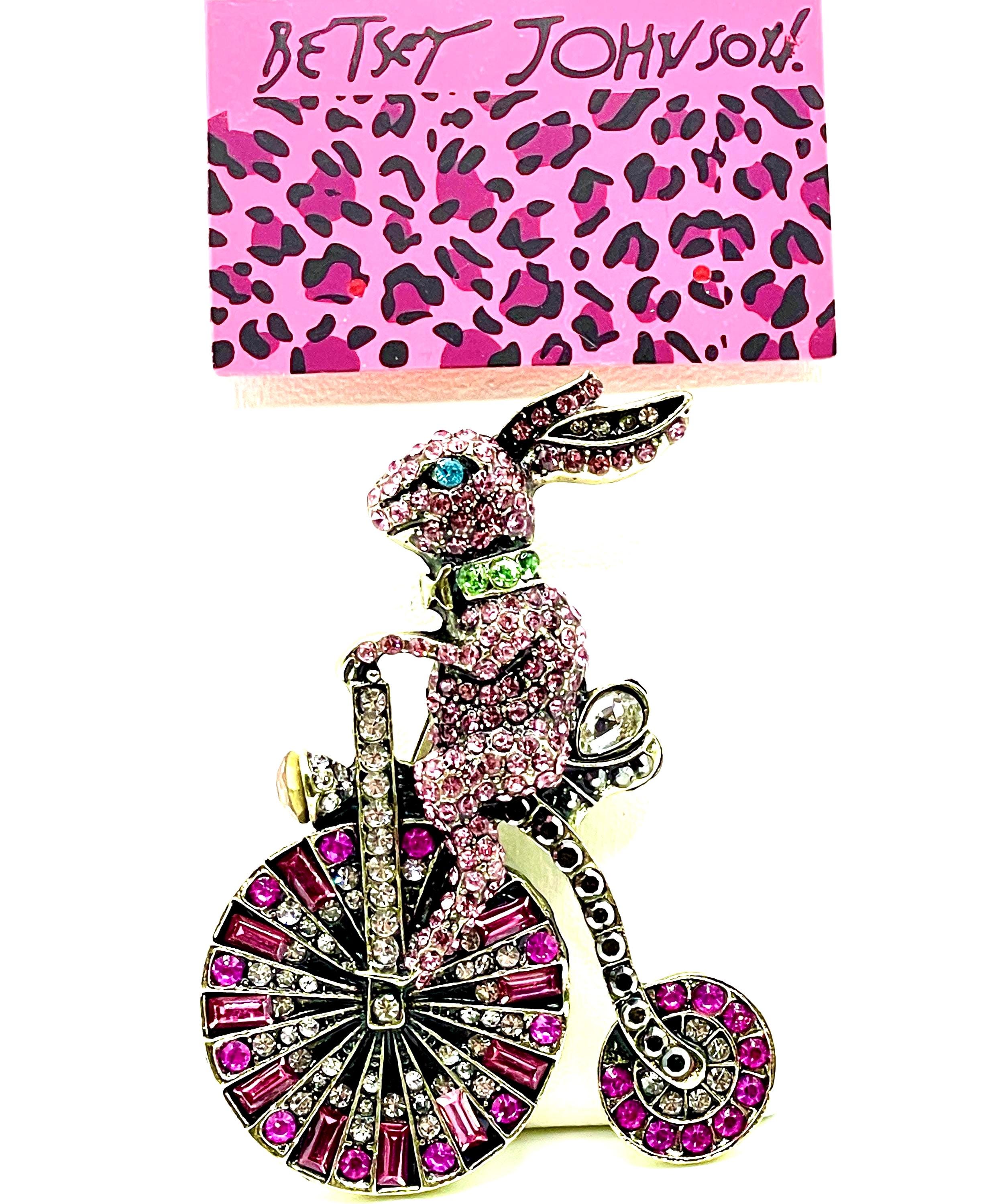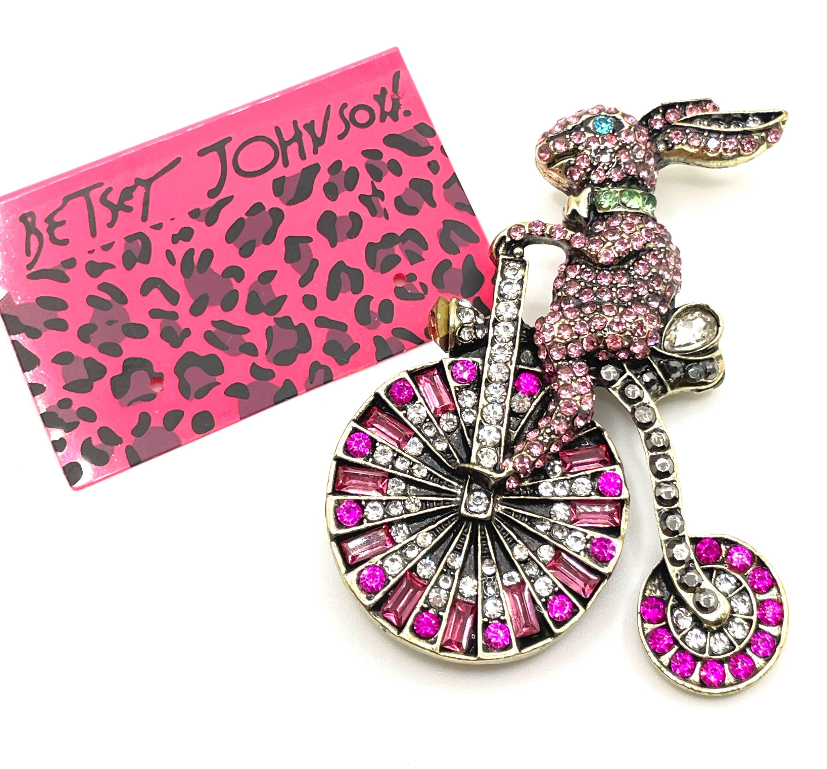 π° Step into a world of whimsy with this enchanting Betsey Johnson rhinestone brooch featuring an adorable vintage-inspired rabbit riding a charming big wheel bicycle. Designed with playful imagination and sparkling detail, this delightful piece is encrusted with mostly pink pave rhinestones accented with multicolor crystals, creating a vibrant and eye-catching statement.