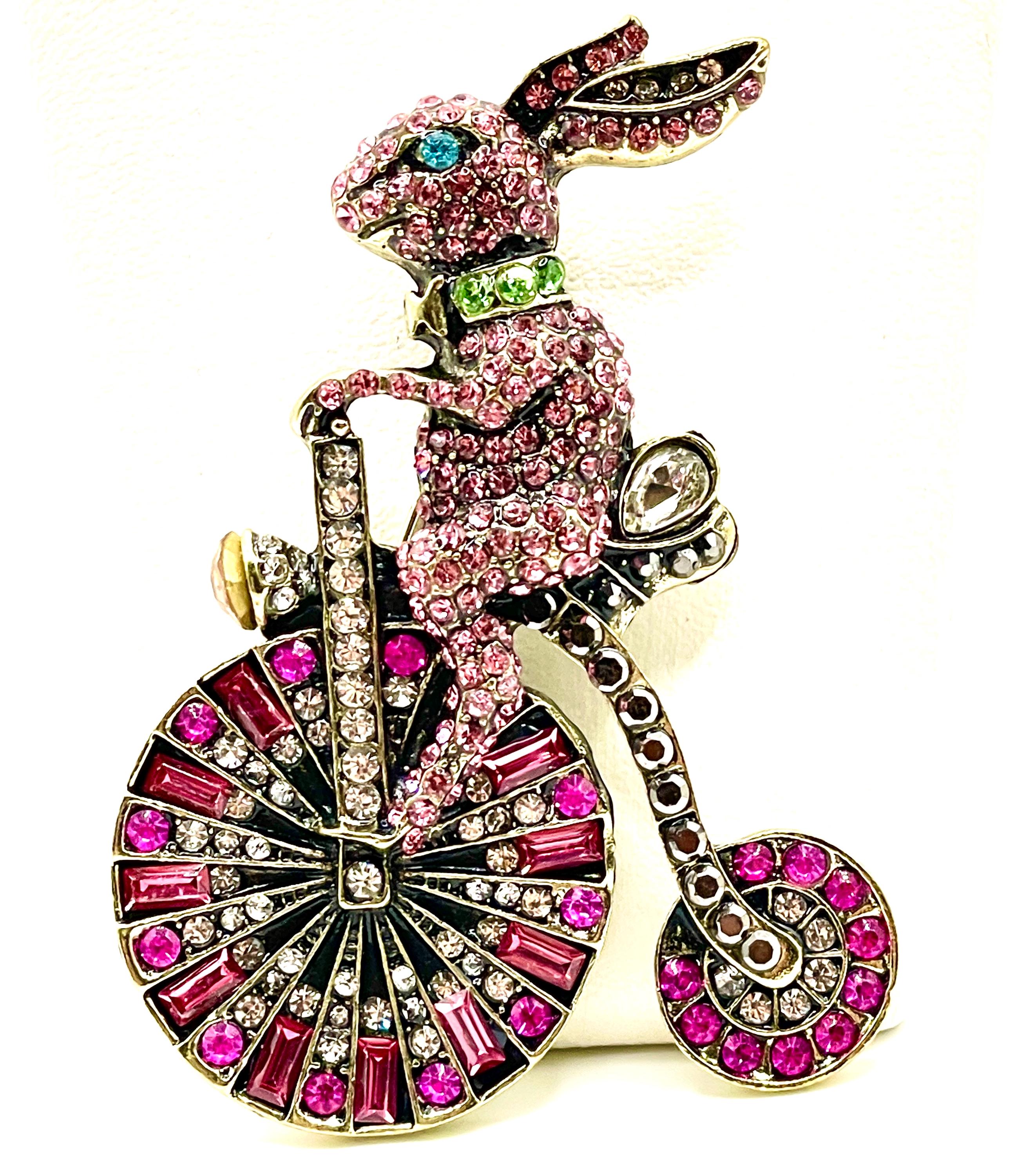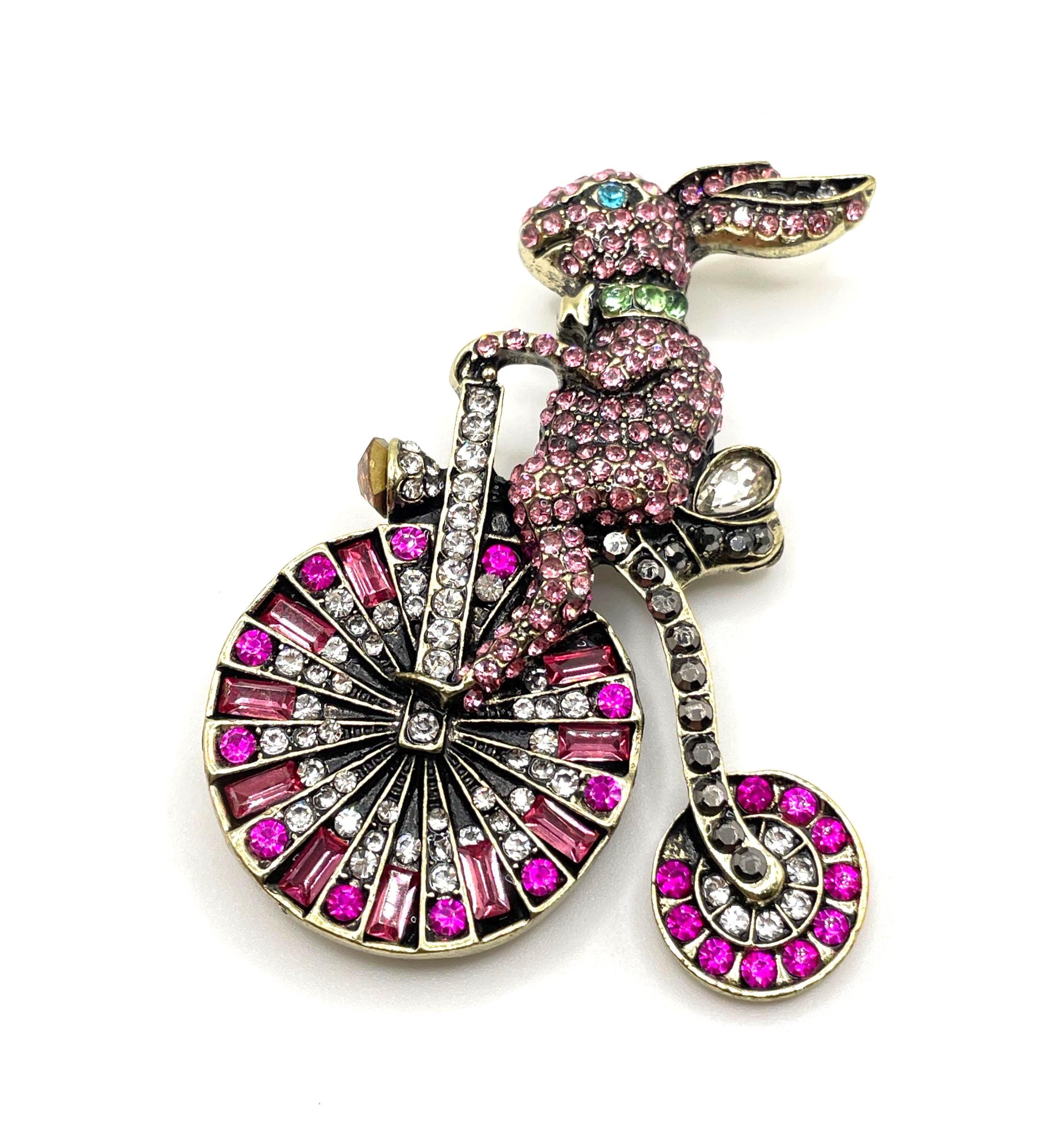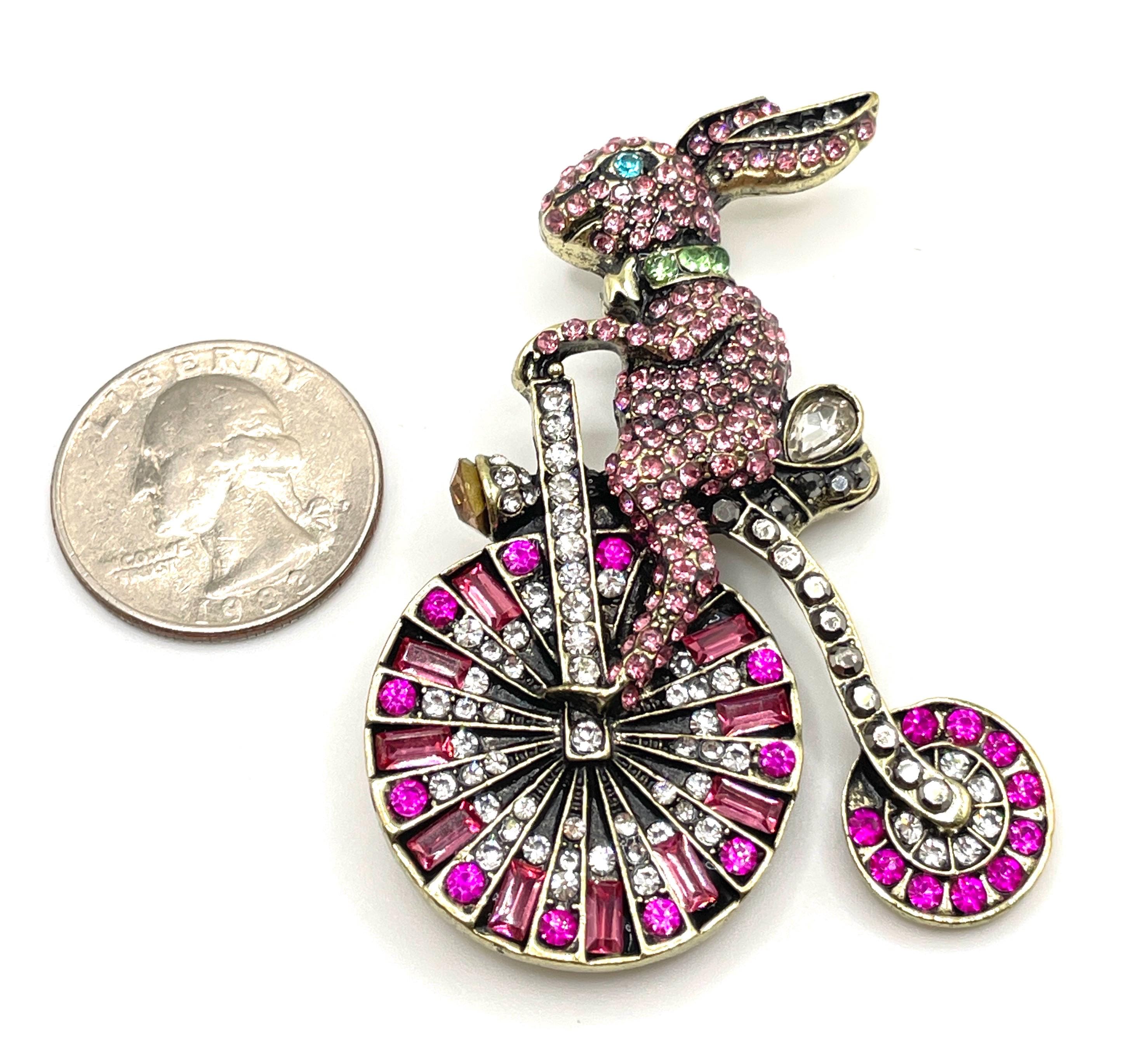The rabbit and bicycle design has a Victorian storybook aesthetic, brought to life with shimmering stones and finished in an antique gold tone setting. Every rhinestone is securely pave-set and intact, giving the brooch a luxurious sparkle from every angle.