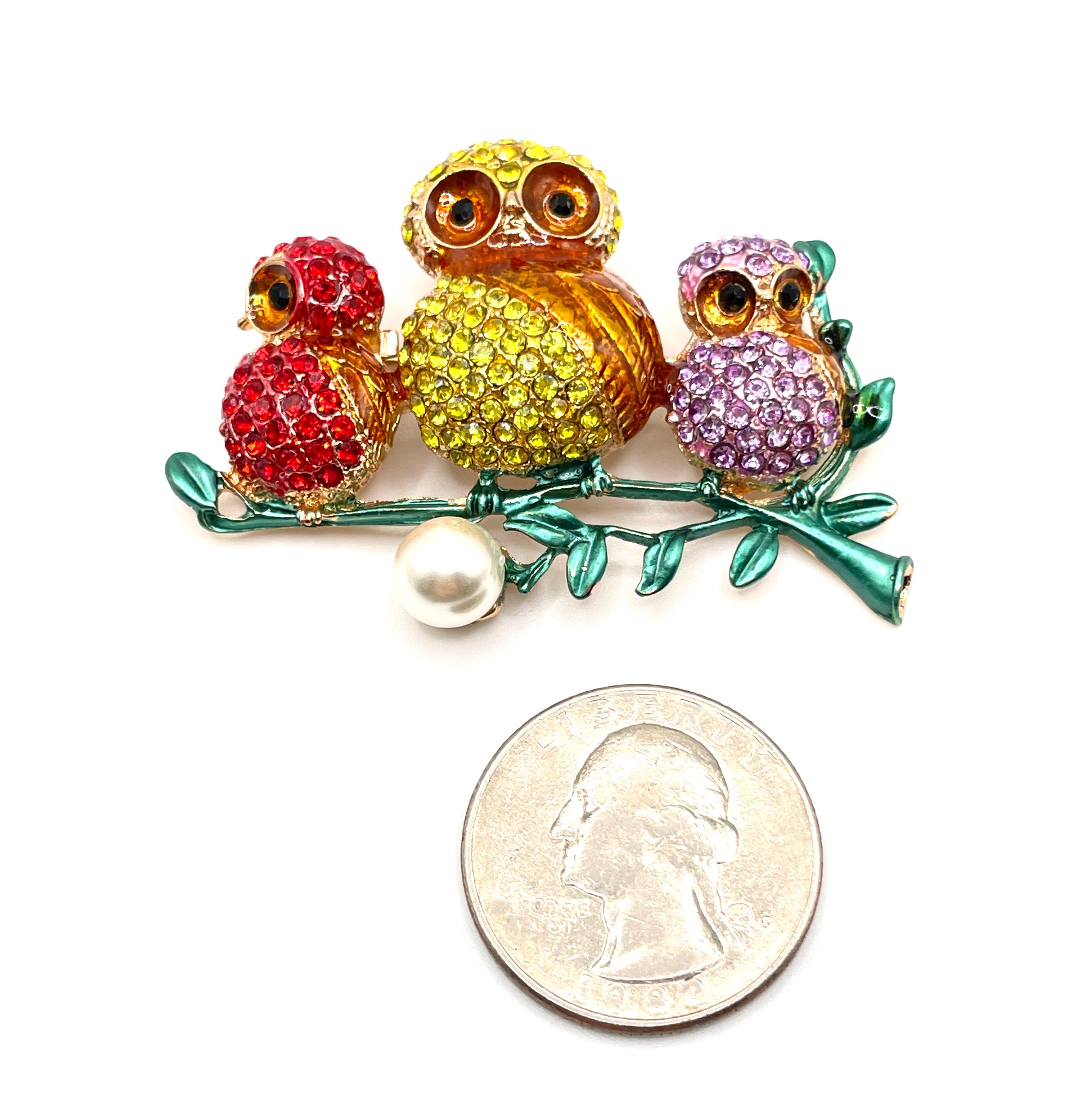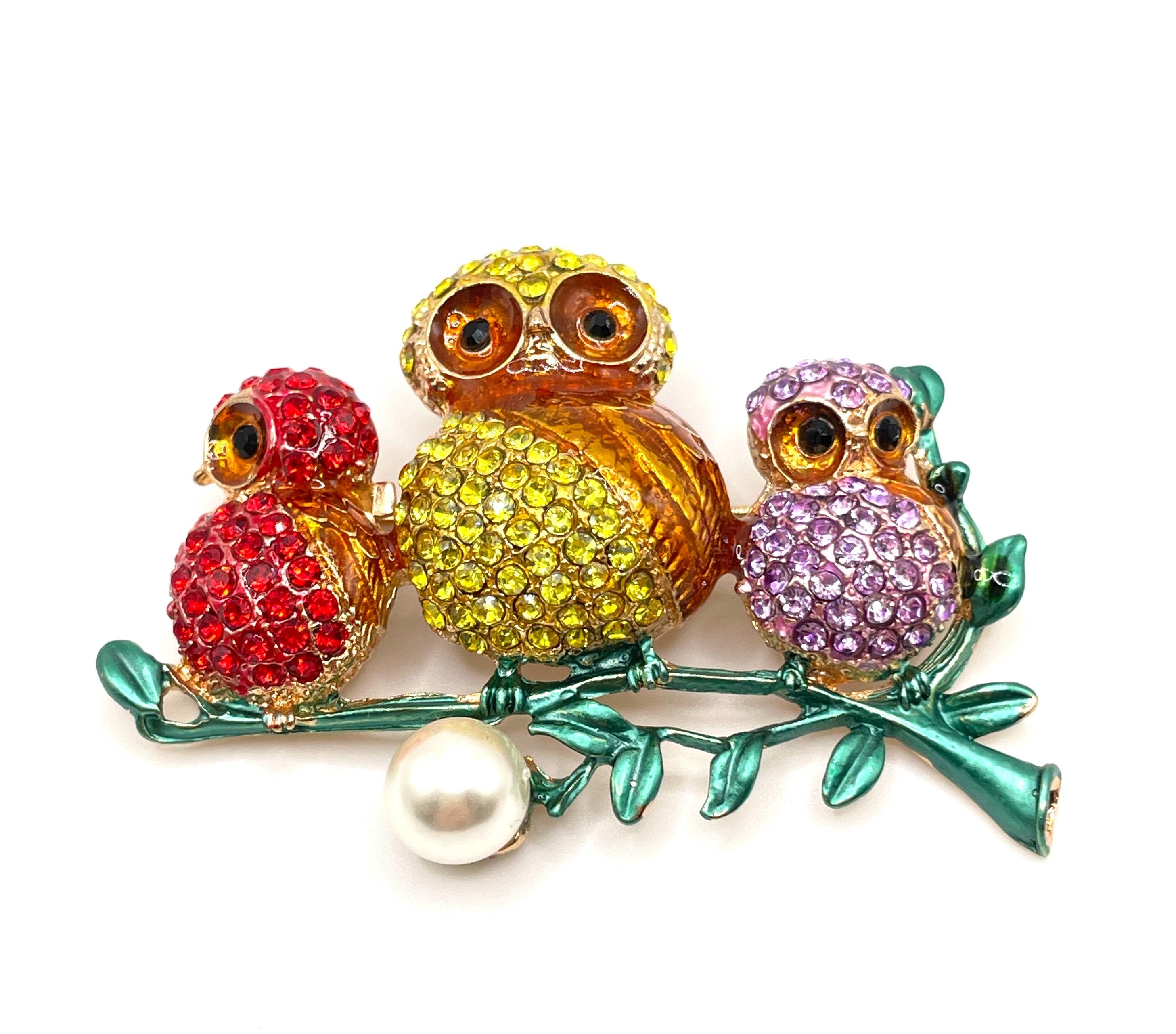 This eye-catching piece features three colorful owls — a bright yellow mama owl in the center with a baby owl on each side. The babies appear in cheerful red and purple, all accented with pavé rhinestones and gold enamel wings that add beautiful sparkle and texture. Each owl has striking black rhinestone eyes surrounded by golden enamel, giving them a lively and expressive look.
