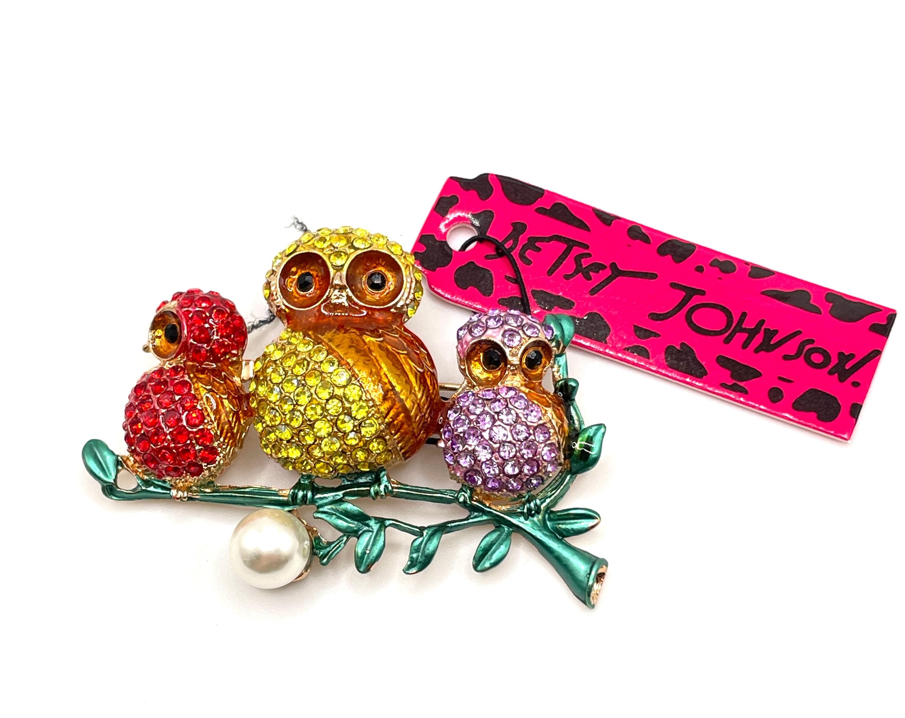 Add a touch of whimsical charm to your jewelry collection with this adorable Betsey Johnson owl brooch/pendant featuring a sweet little owl family perched together on a branch. Known for her playful and imaginative designs, Betsey Johnson brings this delightful scene to life with vibrant enamel colors and sparkling rhinestones.